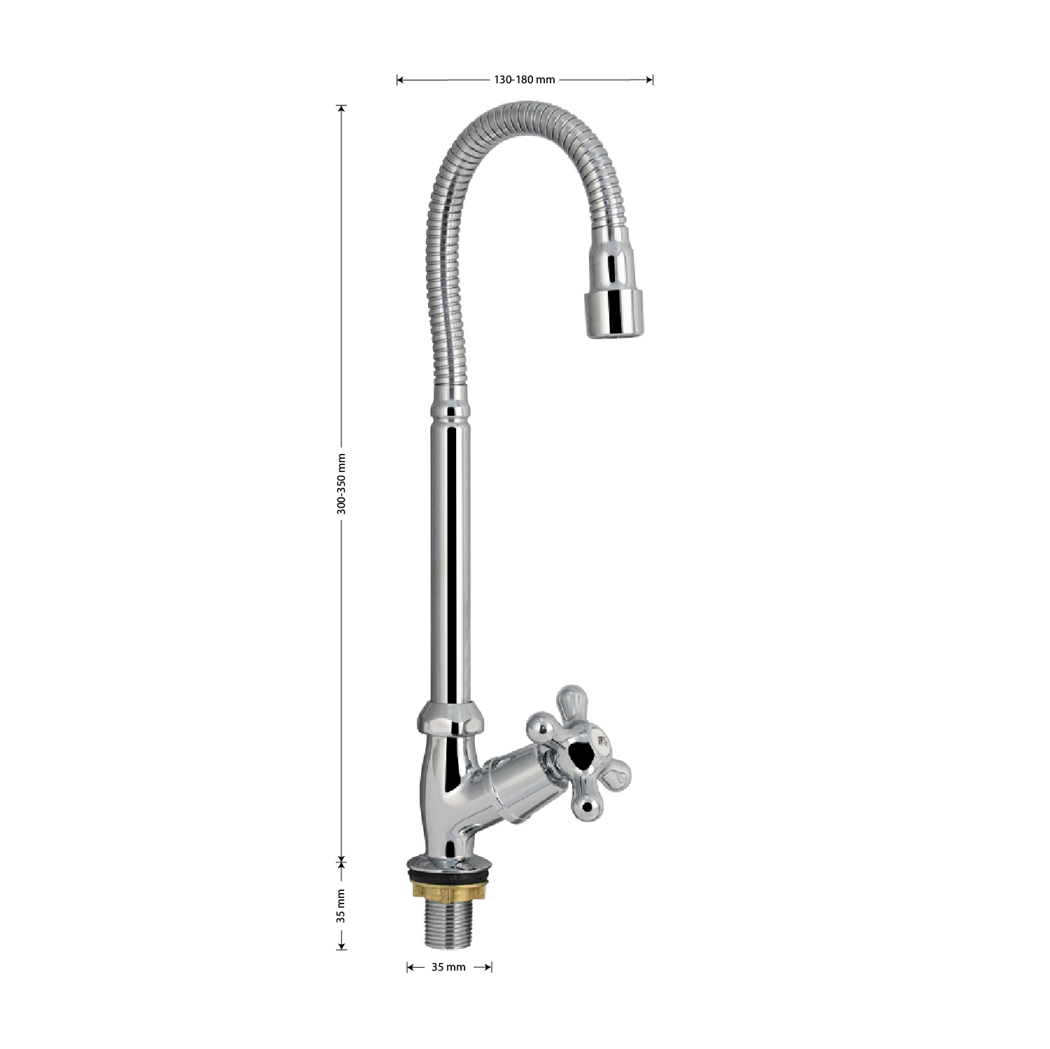 Кран на одну воду хромированный с гибким изливом. Крепление резьба - гайка. Кранбукса м/к, ручка крест поворот на 90˚. Габаритные размеры: высота 300-350 мм, регулировка расположения излива от 130-180 мм , диаметр посадочного седла 35 мм, длина резьбы 35 мм. Вес - 1,100 кг, объём - 0,00187 м3. В комплекте корпус, крепёж