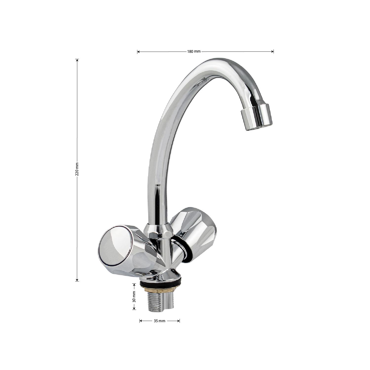 Смеситель для кухонной мойки, хромированный, с высоким изливом. Материал изготовления — ЦАМ (цинк-алюминий-медь) + нержавеющая сталь. Крепление резьба - гайка. Аэратор для экономии воды. Кранбукса м/к 1/2, ручка крест, поворот на 90˚. Габаритные размеры: высота 220 мм, длина 180 мм, диаметр посадочного седла 35 мм, длина резьбы 30 мм, длина подводки  400 мм. Вес - 0,41 кг, объём - 0,0012 м3. В комплекте паспорт, корпус с изливом, подводка 1/2, крепеж, набор прокладок.