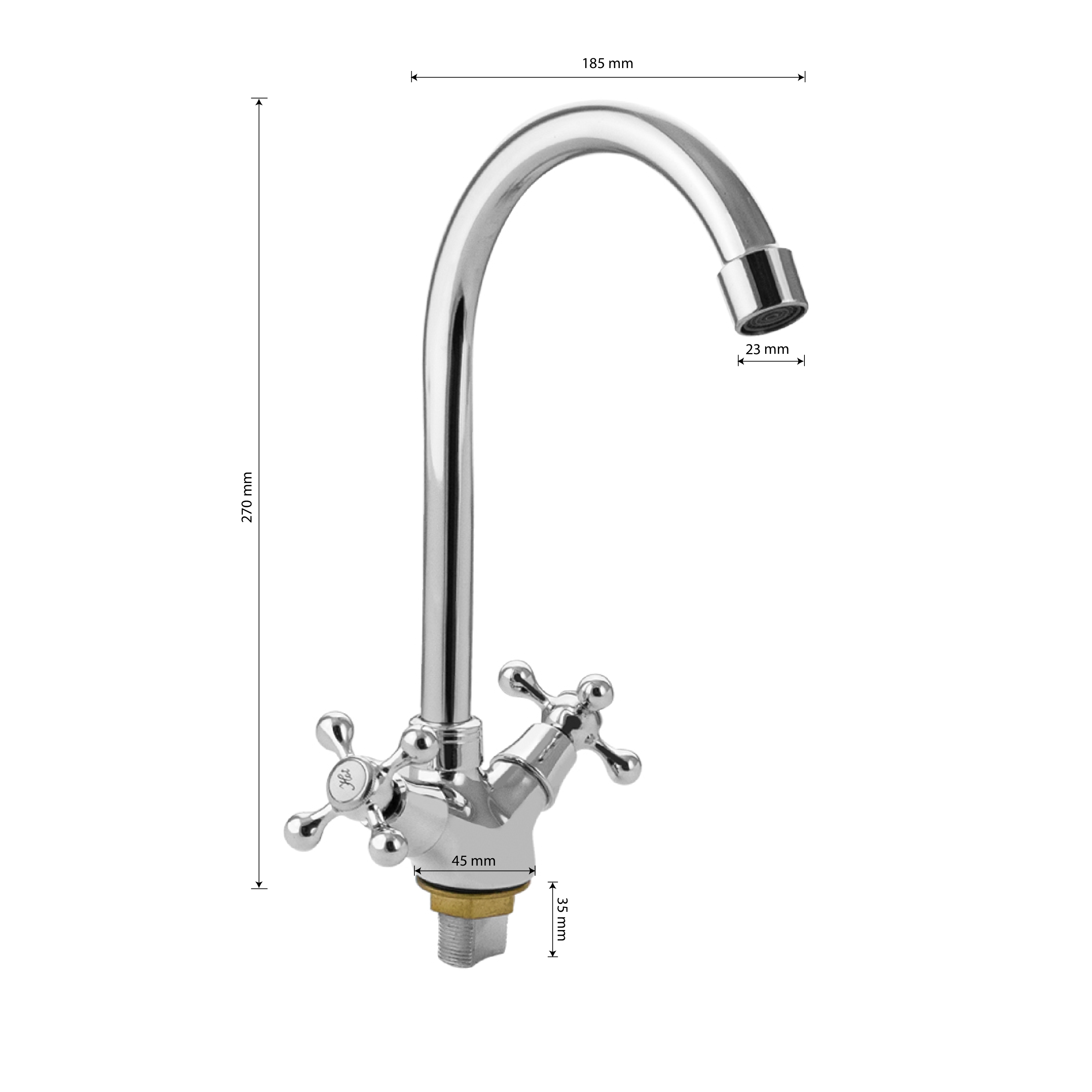 Смеситель для кухонной мойки и раковин, массивный корпус, хромированный, с высоким С-образным изливом. Материал изготовления — ЦАМ (цинк-алюминий-медь) + нержавеющая сталь. Крепление резьба - гайка. Аэратор для экономии воды. Кранбукса м/к 1/2, ручка крест, поворот на 90˚. Габаритные размеры: высота 270 мм, длина 185 мм, диаметр посадочного седла 45 мм, длина резьбы 35 мм, длина подводки 350 мм. Вес - 0,900 кг, объём - 0,00400 м3. В комплекте паспорт, корпус с изливом, подводка 1/2, крепеж, набор прокладок.