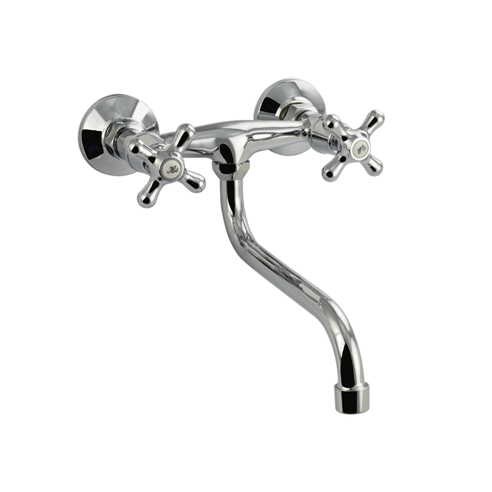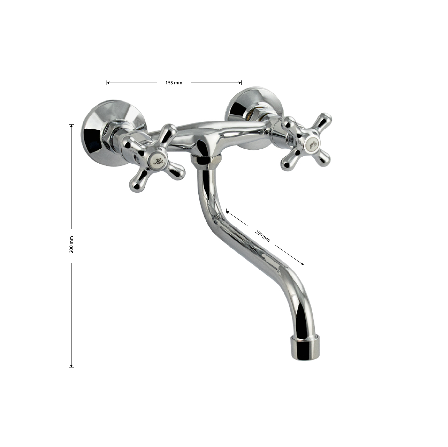 Смеситель от стены, для кухонной мойки и раковин, с круглым изливом, хромированный, с аэратором для экономии воды. Кранбуксы металлокерамика 1/2, ручки крест поворот на 90˚. Габаритные размеры: ширина 150 мм, высота 200 мм, длина излива 200 мм, диаметр чашки 60 мм. Вес - 0,700 кг, объём - 0,00380 м3. В комплекте корпус с изливом, паспорт, крепёж.