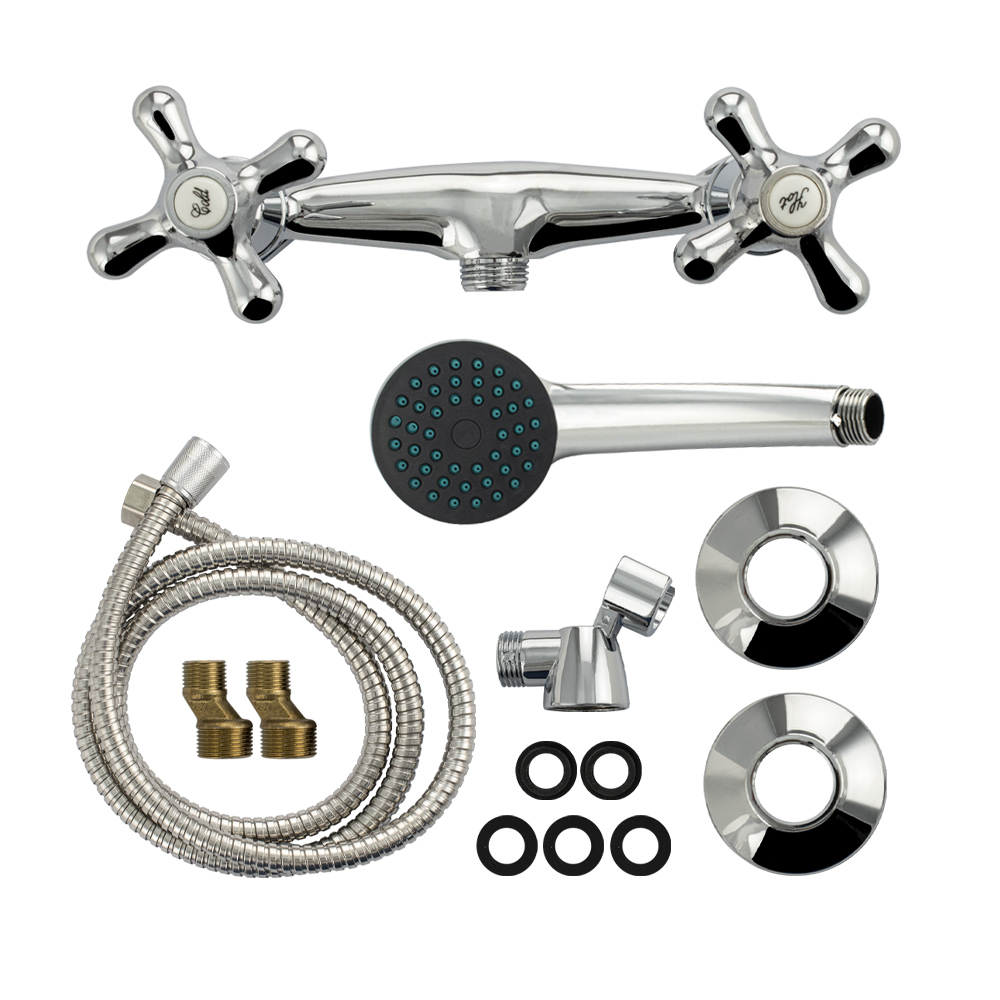 Смеситель хромированный в ванную/душевую комнату без излива. Кранбукса металокерамика 1/2, поворот на 90˚, ручка крест, крепление к стене, чашки нержавеющая сталь, гайки и эксцентрики из нержавейки, душевая лейка. Габаритные размеры: ширина 150 мм, длина 100 мм, высота 50 мм, диаметр чашки 60 мм, диаметр лейки 65 мм. Вес - 0,900 кг, объём - 0,00384 м3. В комплекте корпус, паспорт, шланг 150 см, лейка, кронштейн, крепеж.