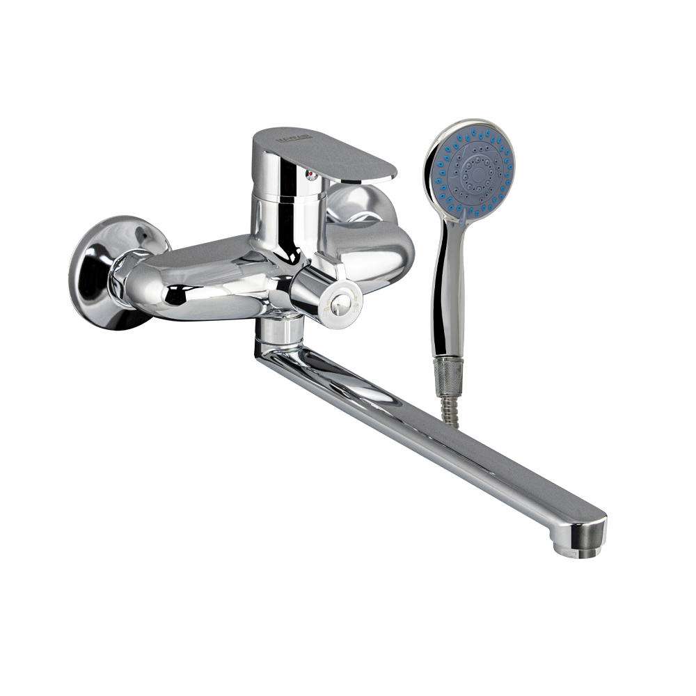 Смеситель хромированный в ванную / душевую комнату с длинным, плоским изливом, дутый корпус, шаровый, с дивертором м/к на корпусе. Материал изготовления — ЦАМ (цинк-алюминий-медь) + нержавеющая сталь. Картридж d = мм, ручка литая, аэратор для экономии воды, чашки и эксцентрики. Габаритные размеры: ширина 150 мм, высота корпуса 135 мм, длина излива 290 мм, трёхрежимная душевая лейка d = 80 мм, шланг 150 см. Вес - 1,51 кг, объём - 0,00521 м3. В комплекте паспорт, корпус с изливом, дивертор, душевая лейка, шланг, кронштейн, комплект крепежа и прокладок.