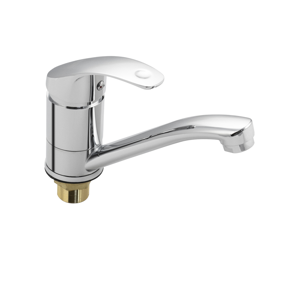 Смеситель для кухонной мойки и раковины, хромированный, с коротким, поворотным изливом, шаровый, литая ручка. Материал изготовления — ЦАМ (цинк-алюминий-медь) + нержавеющая сталь. Крепление резьба - гайка, картридж d = 40 мм. Аэратор для экономии воды. Габаритные размеры: высота 115 мм, длина 190 мм, длина излива135 мм, диаметр посадочного седла 50 мм, длина резьбы 40 мм, длина подводки 350 мм. Вес - 0,800 кг, объём - 0,00194 м3. В комплекте паспорт, корпус, подводка 1/2, крепеж, набор прокладок.