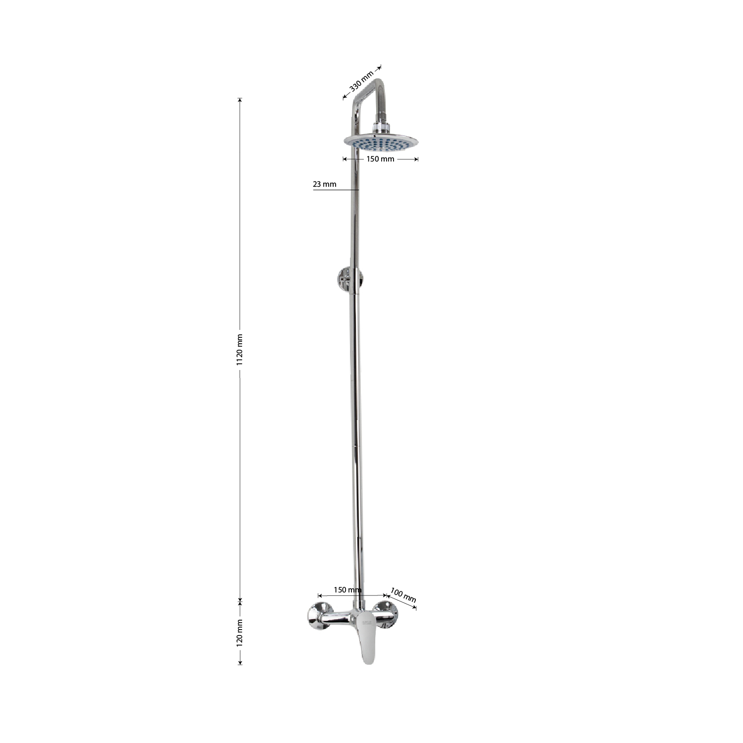Смеситель хромированный в ванную / душевую комнату с жёстким высоким изливом, шаровый, с большой лейкой "тропический душ". Материал изготовления — ЦАМ (цинк-алюминий-медь). Картридж d = 40 мм, литая ручка, крепление к стене, чашки, гайки и эксцентрики из нержавеющей стали. Габаритные размеры: высота 1200 мм, ширина смесителя 150 мм, высота смесители 120 мм, длина излива верхнего душа 330 мм, рассеиватель из нержавеющей стали d = 150 мм. Вес - 1.300 кг, объём - 0,01200 м3. В комплекте корпус, паспорт, рассеиватель, излив - штанга, крепеж.