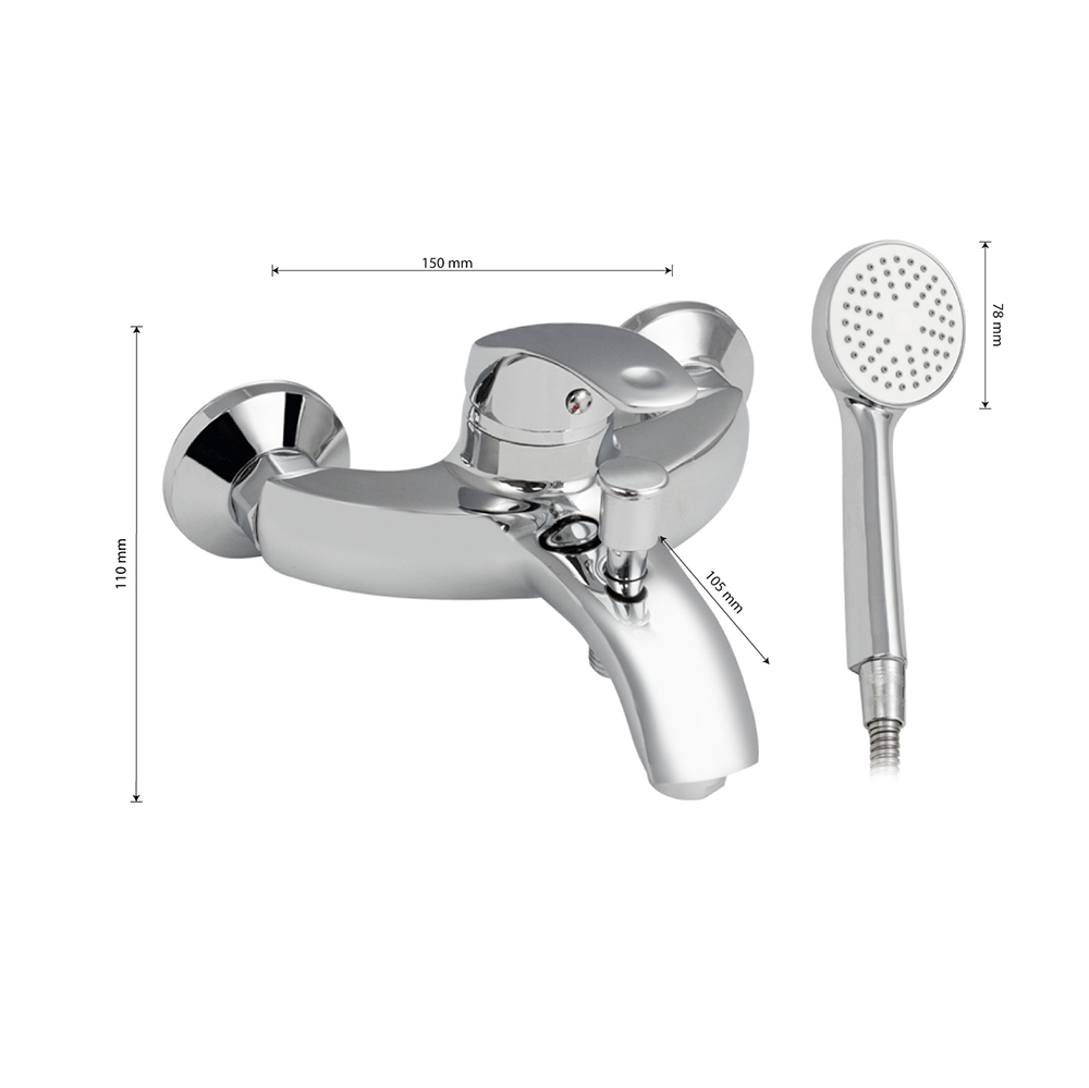 Смеситель хромированный в ванную / душевую комнату с коротким, изогнутым изливом, изогнутый дутый корпус, шаровый, с кнопочным дивертором на корпусе. Материал изготовления — ЦАМ (цинк-алюминий-медь) + нержавеющая сталь. Картридж d = 40 мм, ручка литая, аэратор для экономии воды, чашки и эксцентрики. Габаритные размеры: ширина 150 мм, высота корпуса 110 мм, длина излива 105 мм, трёхрежимная душевая лейка d = 78 мм, шланг 150 см. Вес - 1,400 кг, объём - 0,00432 м3. В комплекте паспорт, корпус с изливом, дивертор, душевая лейка, шланг, кронштейн, комплект крепежа и прокладок.