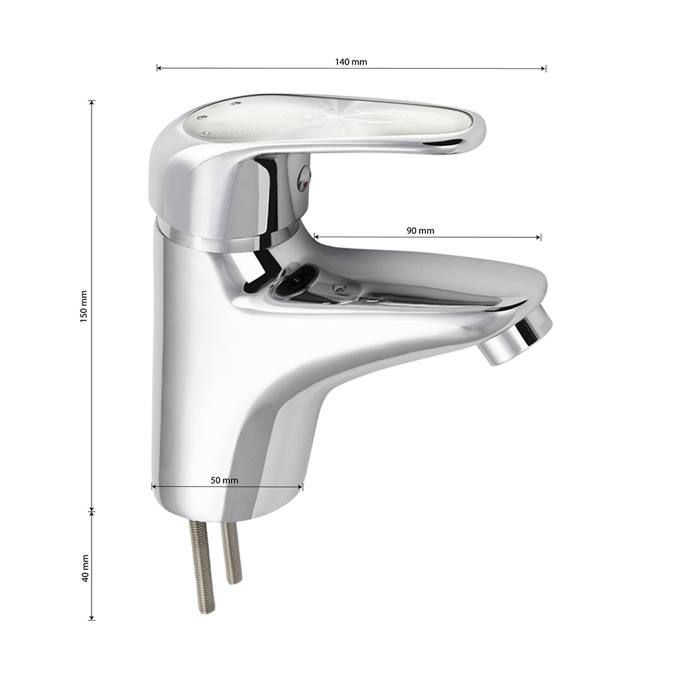 Смеситель для раковины, хромированный, с коротким изливом, литой корпус, сатеновая ручка с узором, шаровый. Материал изготовления — ЦАМ (цинк-алюминий-медь) + нержавеющая сталь. Крепление на шпильках, картридж d = 40 мм. Аэратор для экономии воды. Габаритные размеры: высота 150 мм, длина 140 мм, длина излива 90 мм, диаметр посадочного седла 50 мм, длина резьбы 40 мм, длина подводки 400 мм. Вес - 1,200 кг, объём - 0,00200 м3. В комплекте паспорт, корпус, подводка 1/2, крепеж, набор прокладок.