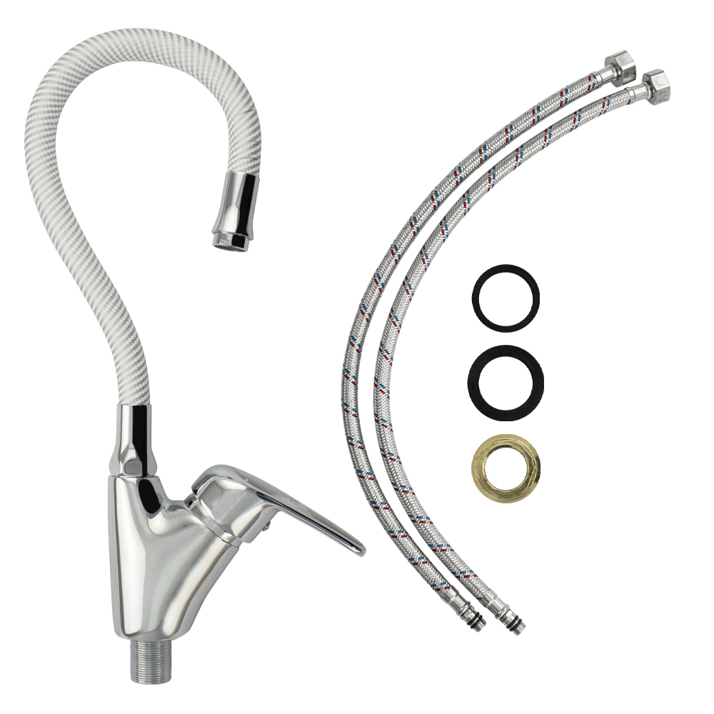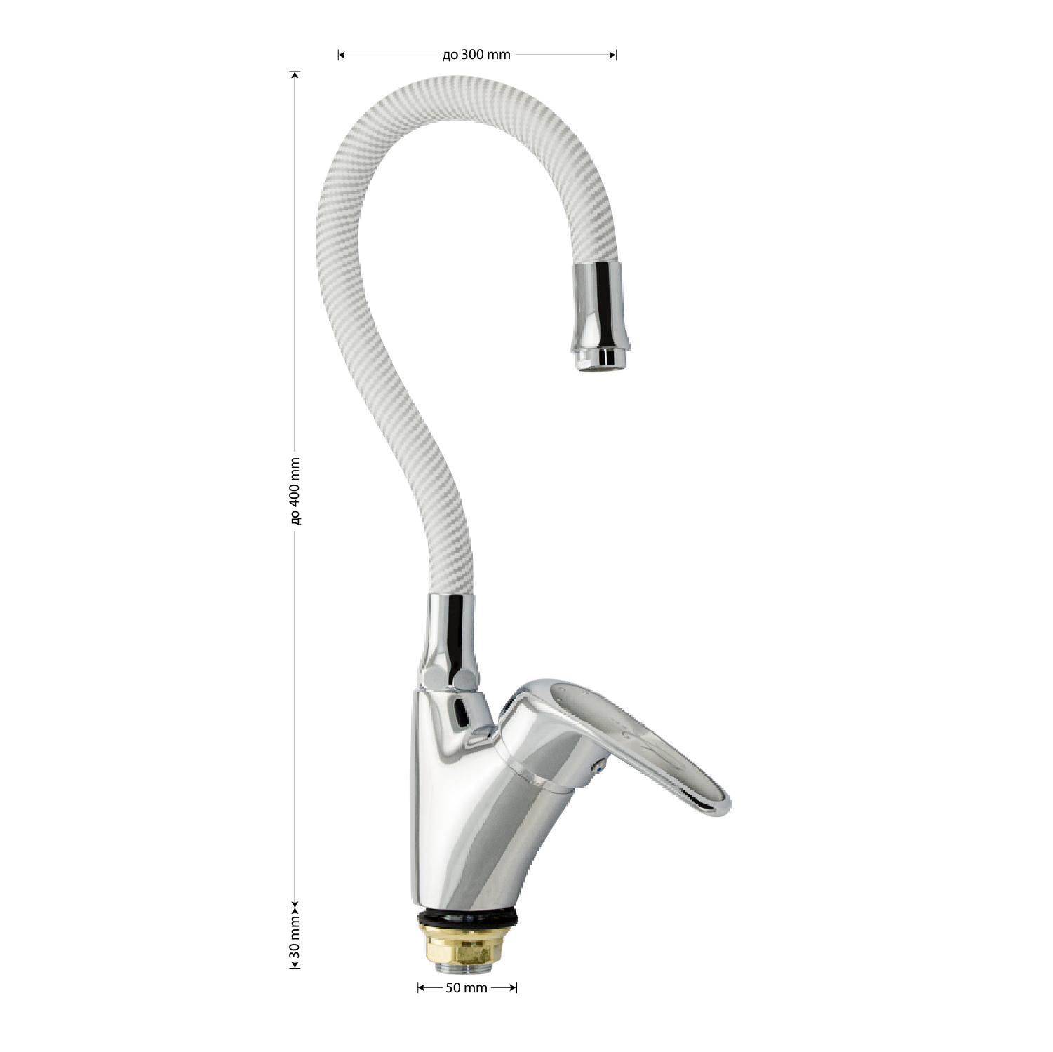 Смеситель для кухонной мойки и раковин, корпус хромированный, боковой, с высоким гибким изливом белого цвета, шаровый. Материал изготовления — ЦАМ (цинк-алюминий-медь) + нержавеющая сталь. Крепление резьба - гайка, картридж d = 40 мм, сатеновая ручка с узором. Аэратор для экономии воды. Габаритные размеры: высота 400 мм, длина от 300 мм, диаметр посадочного седла 50 мм, длина резьбы 30 мм, длина подводки 500 мм. Вес - 1,600 кг, объём - 0,00550 м3. В комплекте паспорт, корпус с изливом, подводка 1/2, крепеж, набор прокладок.