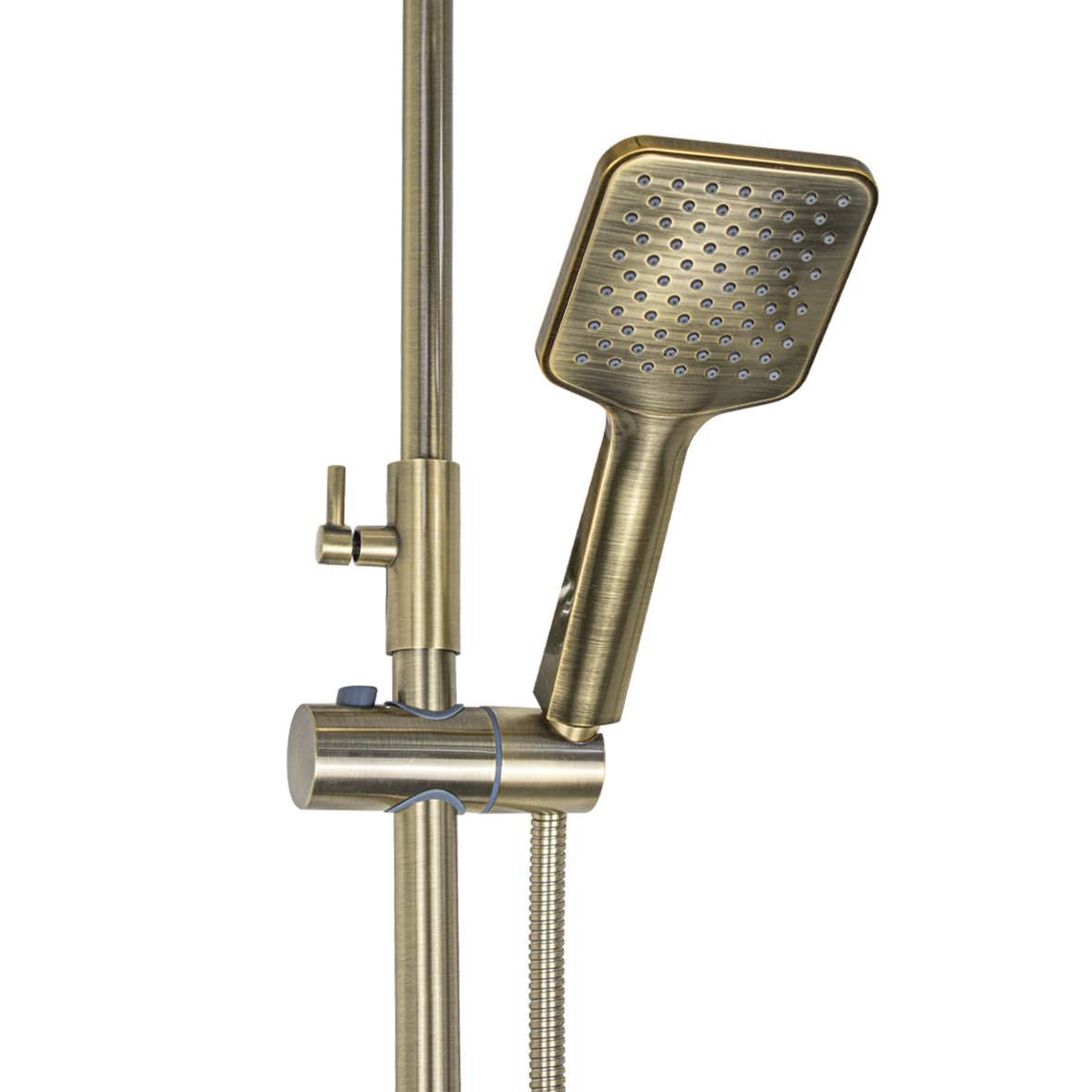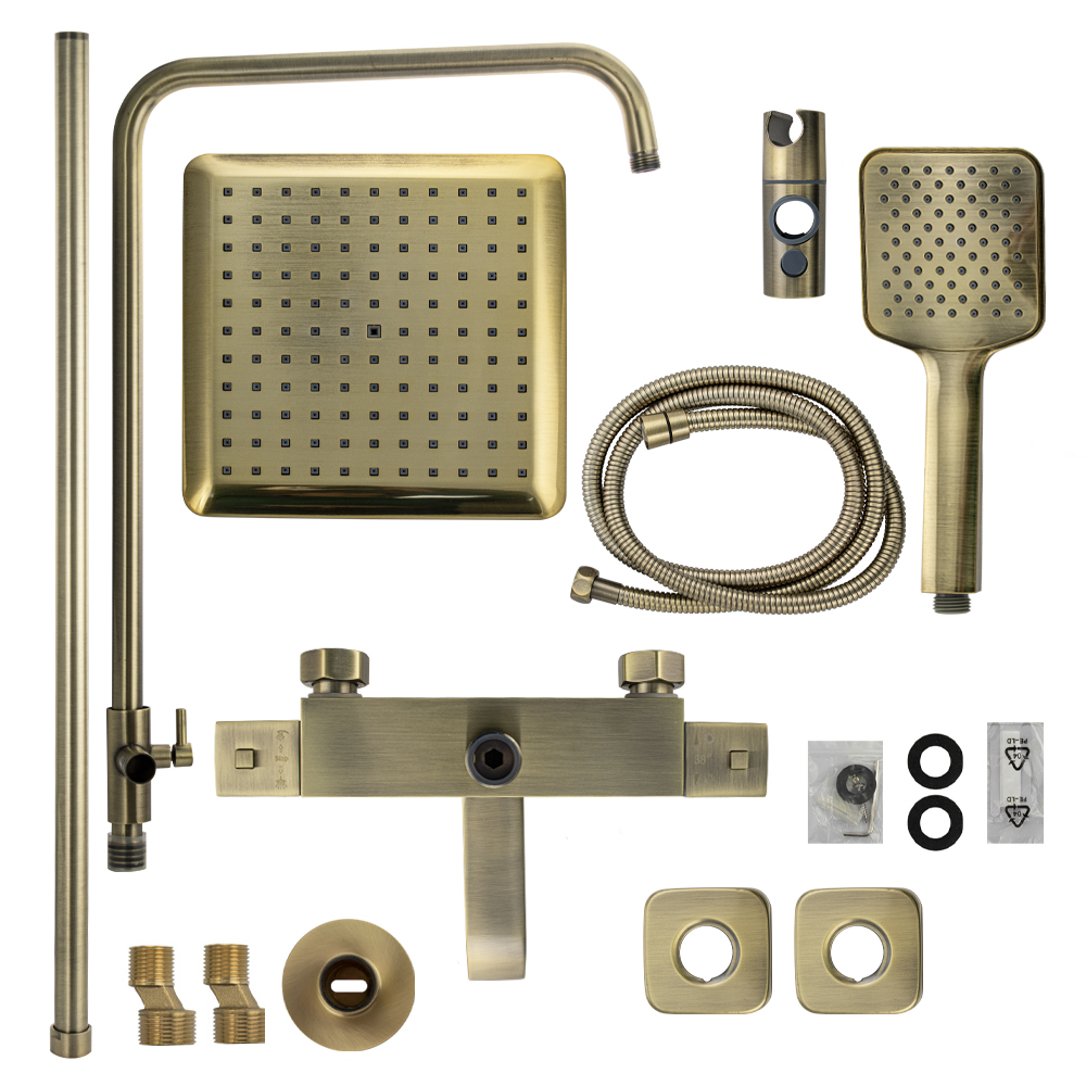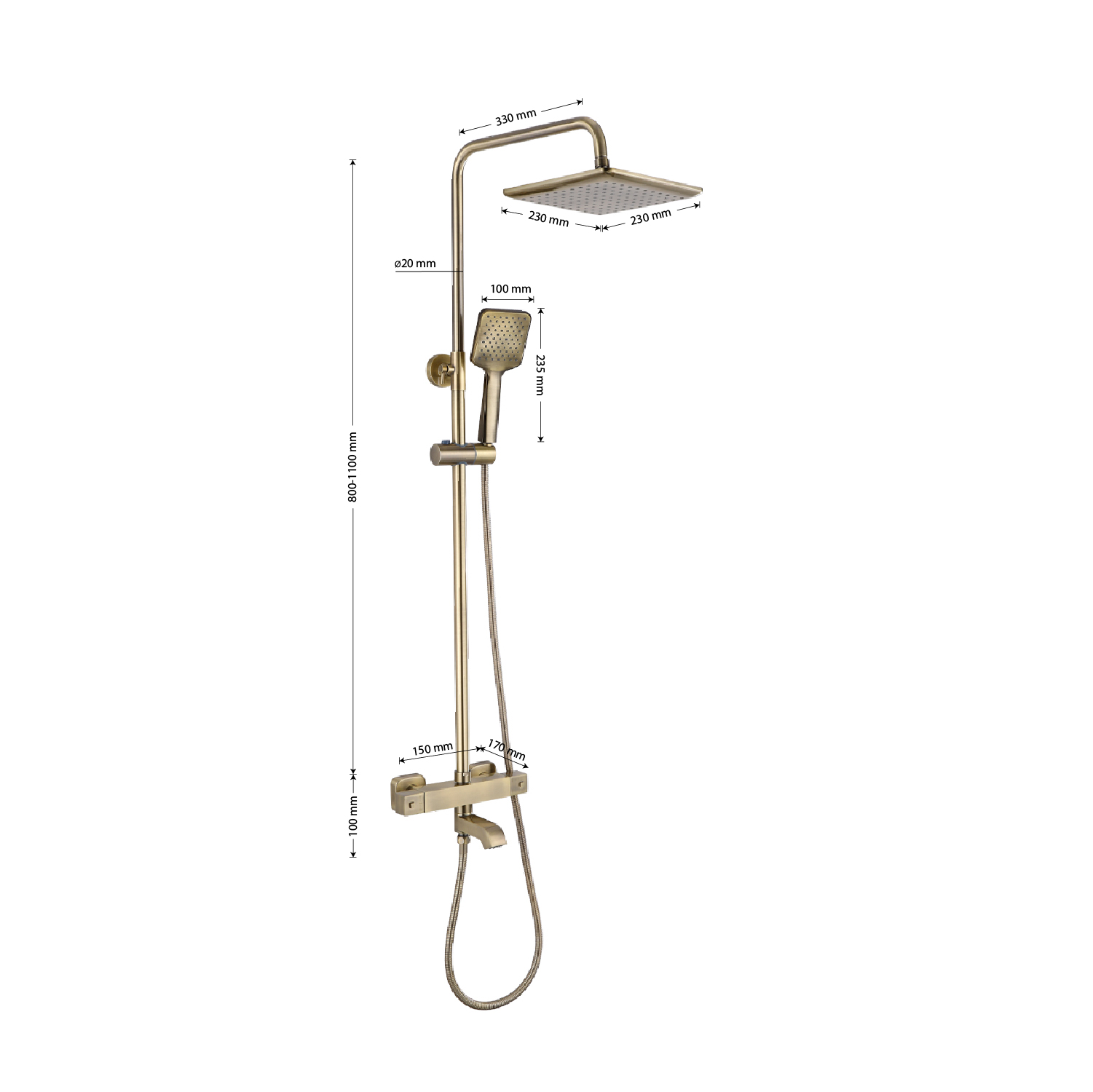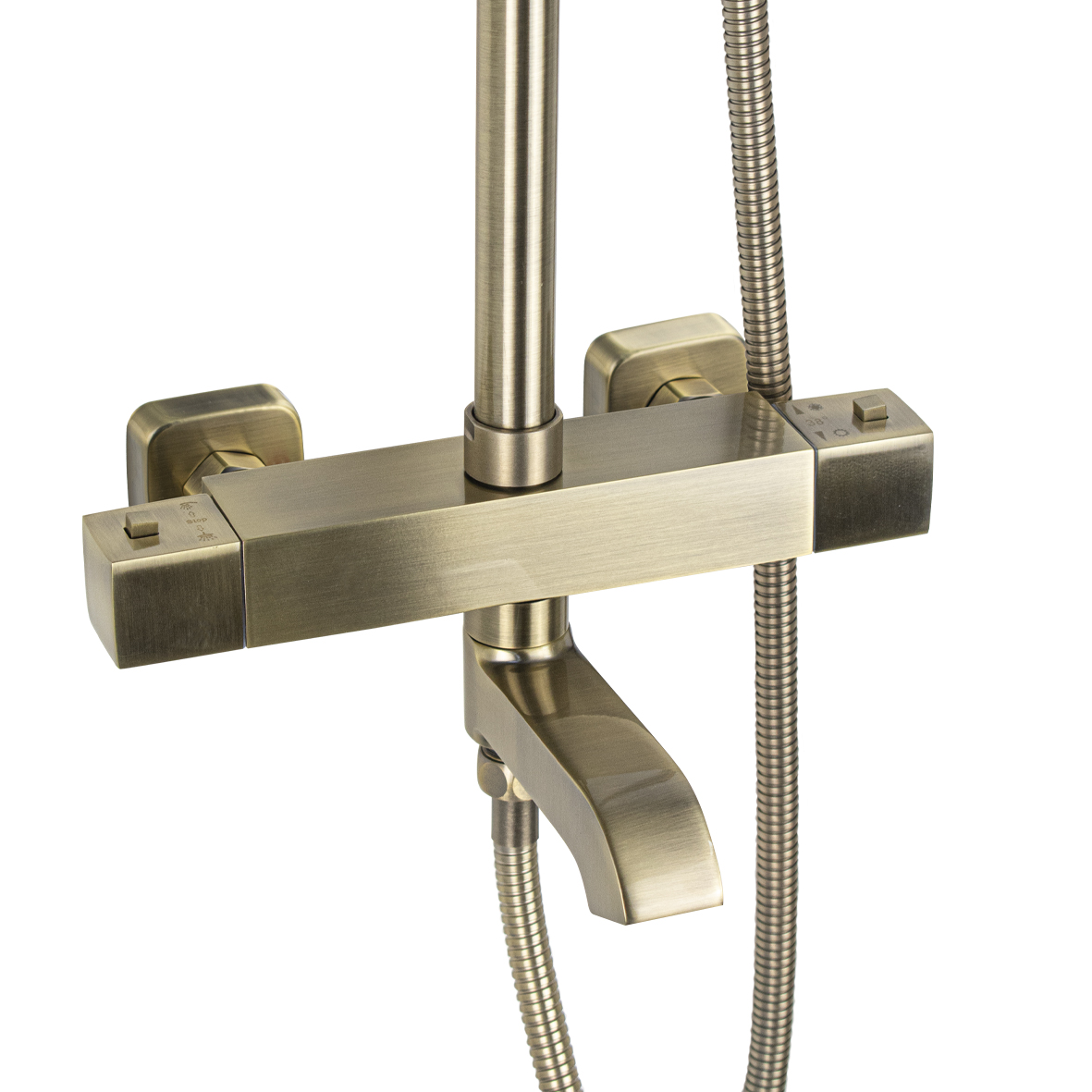 Смеситель с термостатом + стойка душевая телескопическая "тропический душ" – надежное сантехническое оборудование. Латунный, квадратный массивный корпус под бронзу с коротким изливом, поворот которого является переключением подачи воды. Температура и напор воды устанавливаются поворотом двух удобных рукояток. Термостат поддерживает заданную температуру воды и может работать в системах низкого давления с газовыми проточными водонагревателями. Ограничитель температуры до 38 градусов спасает от возможного ожога при случайном повороте рукоятки. Встроенный аэратор формирует комфортный и приятный поток воды. Сеточка легко снимается для удаления налета. Аксессуар оснащен термостатическим картриджем с шумоподавлением и керамической кран-буксой, стойка с двумя квадратными лейками и шланг. Габаритные размеры: высота стойки 800 - 1100 мм, длина излива стойки 330 мм, лейка для душа 100 мм двухрежимная, лейка тропического душа 230*230 мм, длина гусака 170 мм, шланг 150 см. Вес - 4.85 кг, объём - 0,035 м3. В комплекте ко