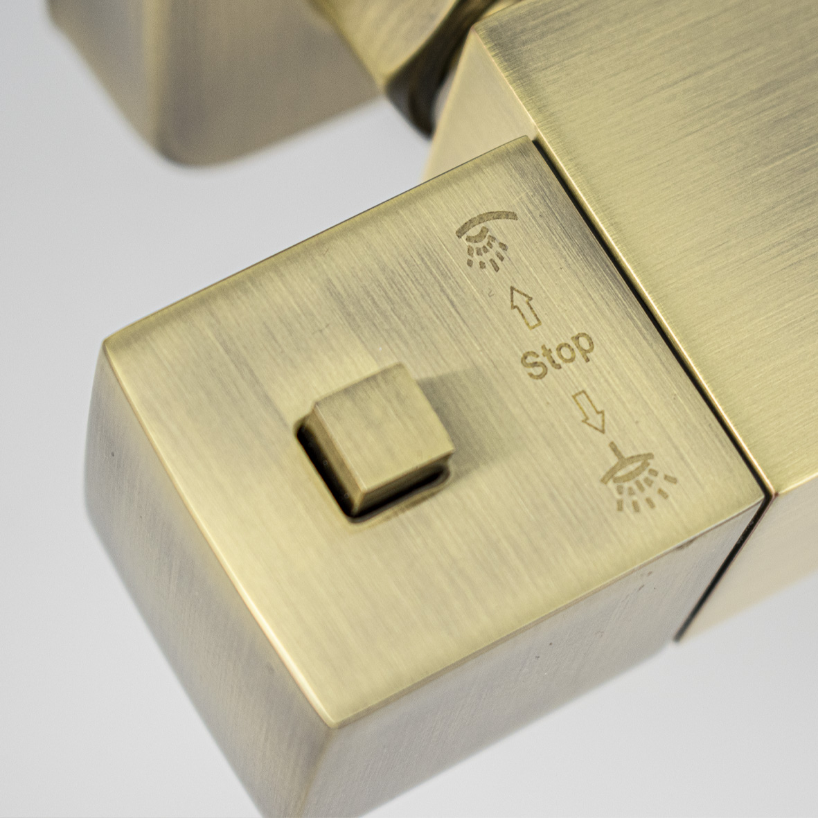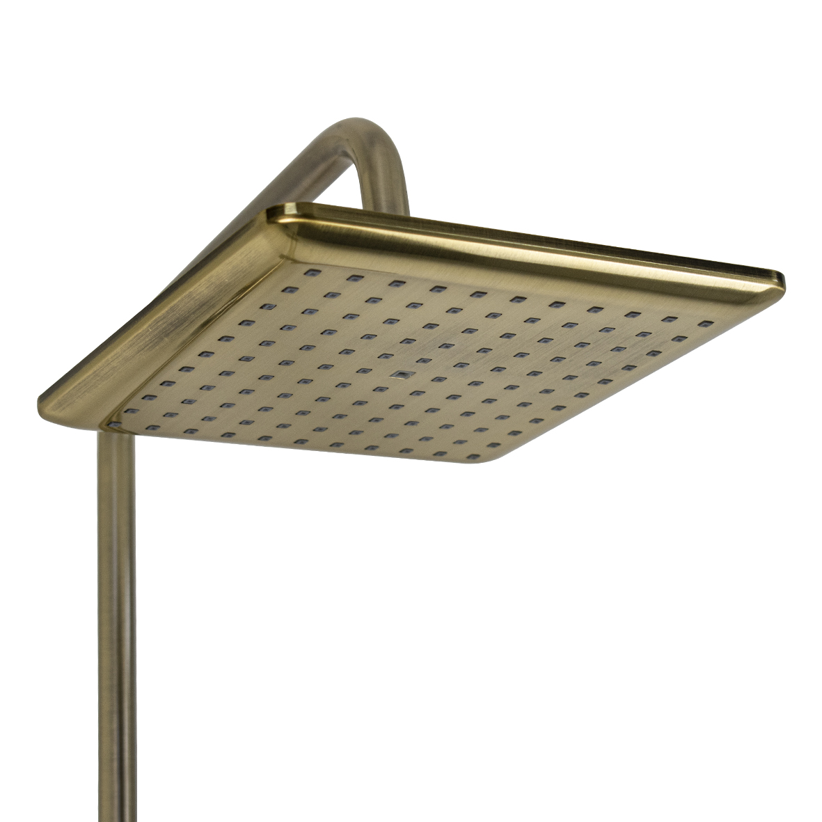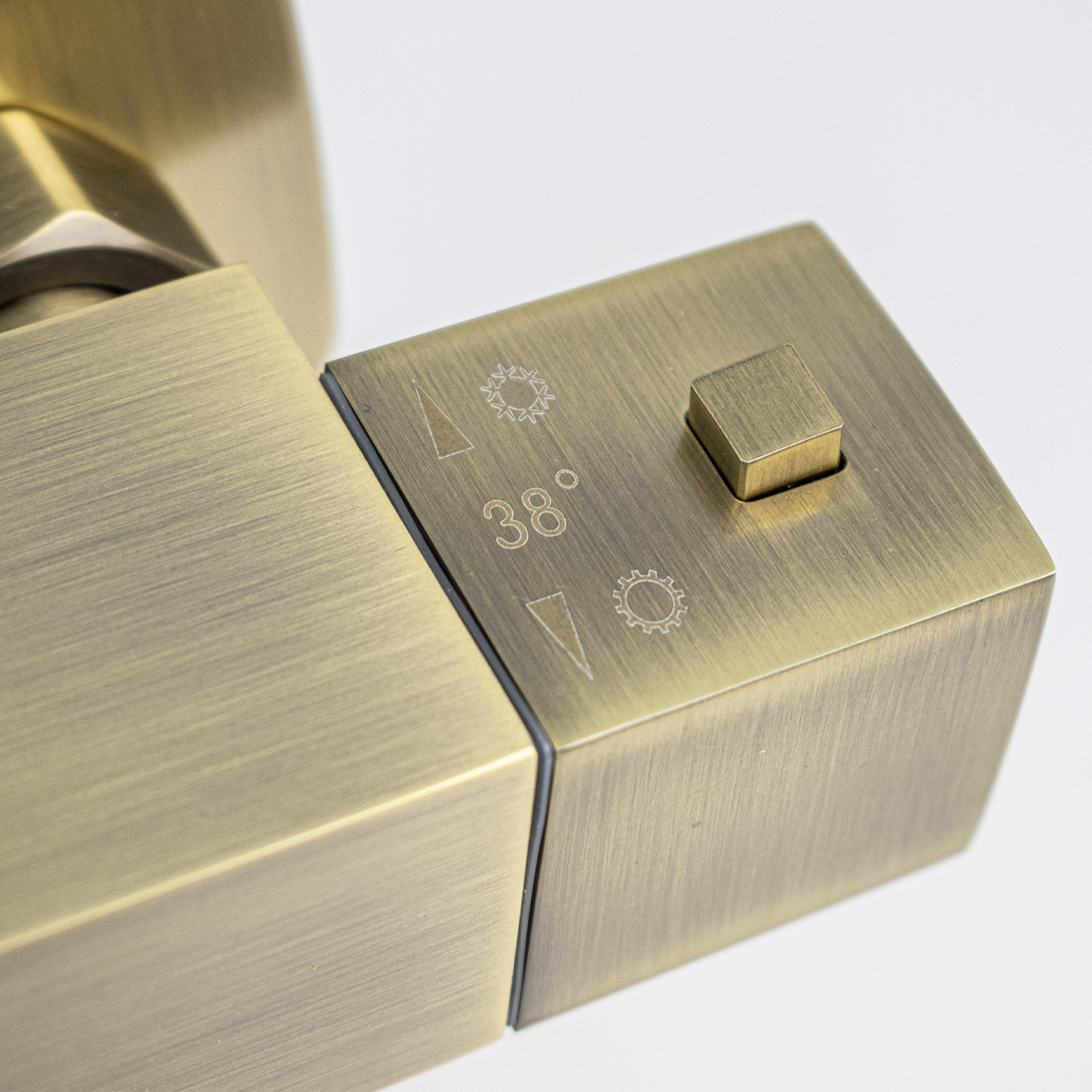 Смеситель с термостатом + стойка душевая телескопическая "тропический душ" – надежное сантехническое оборудование. Латунный, квадратный массивный корпус под бронзу с коротким изливом, поворот которого является переключением подачи воды. Температура и напор воды устанавливаются поворотом двух удобных рукояток. Термостат поддерживает заданную температуру воды и может работать в системах низкого давления с газовыми проточными водонагревателями. Ограничитель температуры до 38 градусов спасает от возможного ожога при случайном повороте рукоятки. Встроенный аэратор формирует комфортный и приятный поток воды. Сеточка легко снимается для удаления налета. Аксессуар оснащен термостатическим картриджем с шумоподавлением и керамической кран-буксой, стойка с двумя квадратными лейками и шланг. Габаритные размеры: высота стойки 800 - 1100 мм, длина излива стойки 330 мм, лейка для душа 100 мм двухрежимная, лейка тропического душа 230*230 мм, длина гусака 170 мм, шланг 150 см. Вес - 4.85 кг, объём - 0,035 м3. В комплекте ко