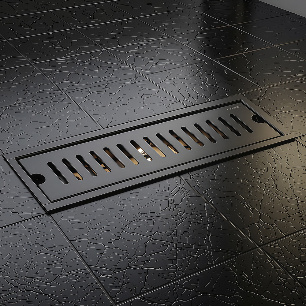 Трап линейный 300 х 100 мм, вертикальный выпуск с гидрозатвором, с верхним бортиком, из нержавеющей стали марки SUS 304, цвет ЧЁРНЫЙ.