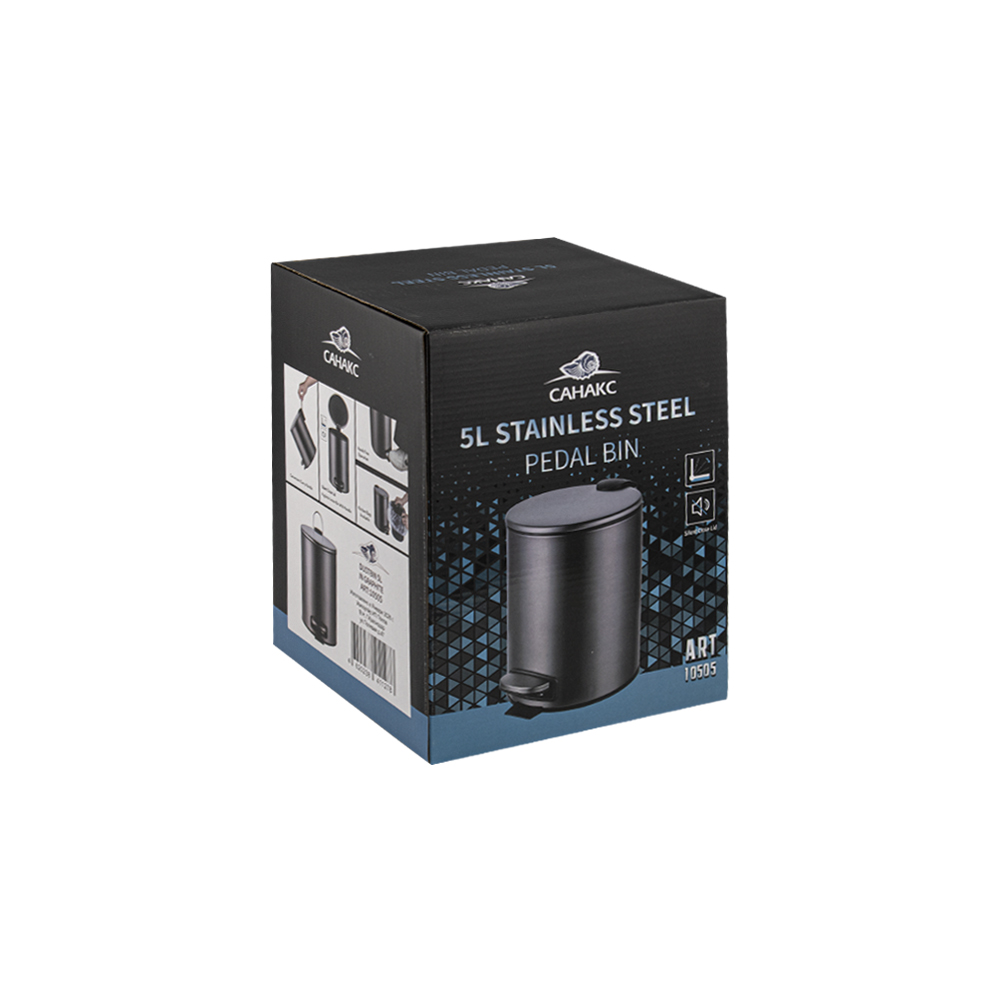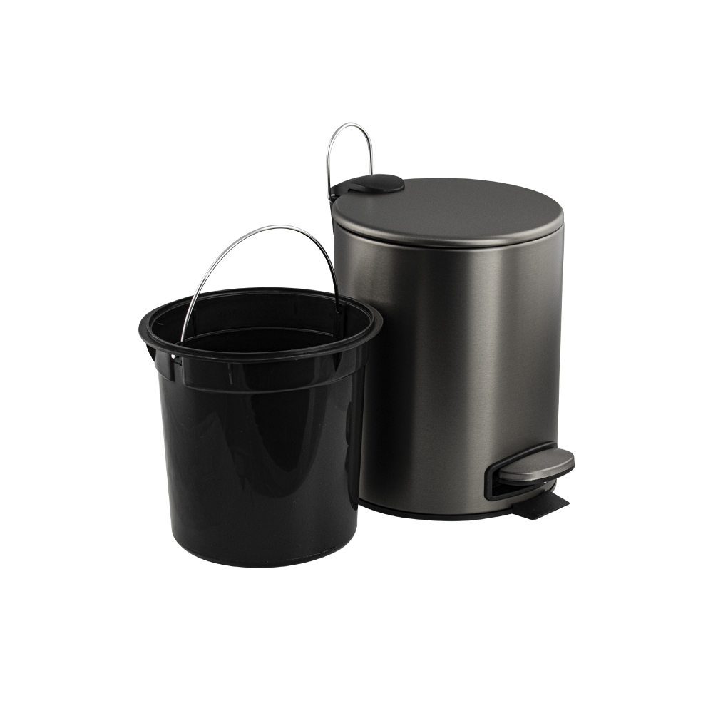 Ведро для мусора с педалью и откидной крышкой с функцией микролифт, прекрасно подойдет для ванной комнаты, туалета или кухни и офиса. Нержавеющая сталь SUS 410. Ведро оснащено пластиковым гигиеническим контейнером и плавным механизмом поднятия - опускание крышки, при помощи нажатия на педаль. Объём ведра 5 литров. Отличное решение для утилизации мелкого бытового мусора. Наличие крышки обеспечивает защиту от неприятных запахов и распространения бактерий, а педальная система открывания позволяет не прикасаться к баку руками. Благодаря современному дизайну ведро впишется в интерьер любой кухни и ванной комнаты. Преимущества ведра для мусора с педалью: удобно устанавливается и перемещается на любое место; изготовлено из устойчивой к коррозии нержавеющей стали с покрытием цвета графит; пользоваться изделием удобно и гигиенично благодаря педали в нижней части корпуса. Нескользящая пластиковая основа ведра предотвращает повреждение пола. Габаритные размеры: высота 265 мм, диаметр 205 мм. Вес - 0.9 кг, объём - 0,0135