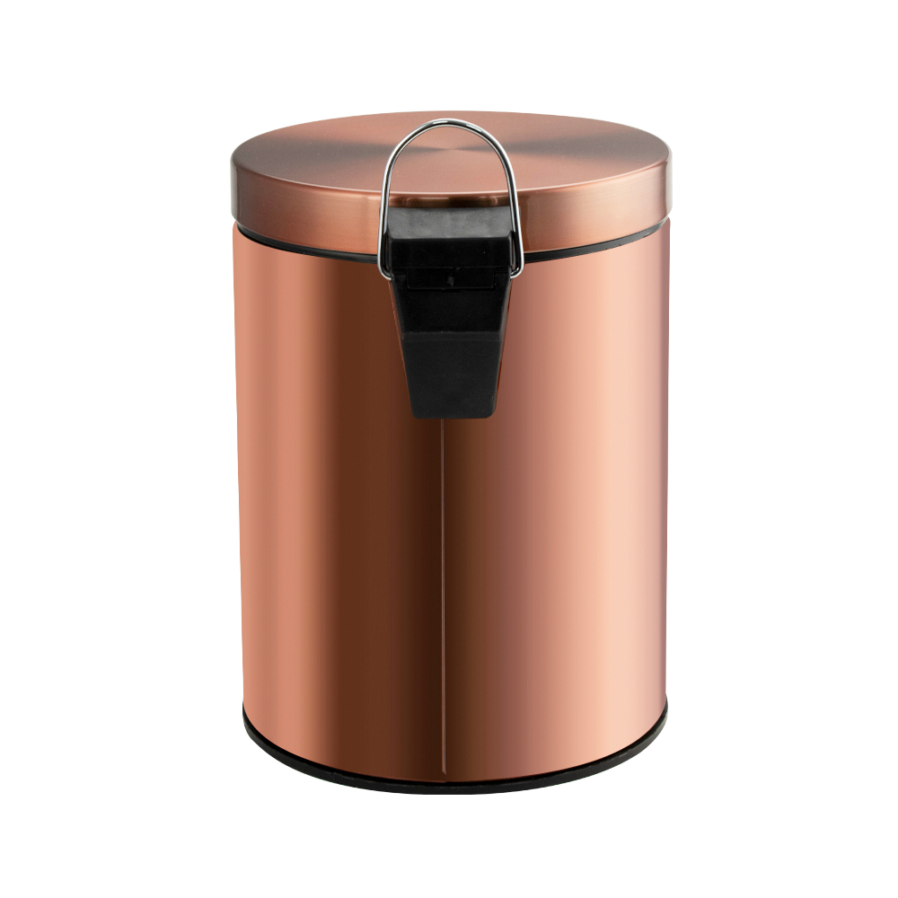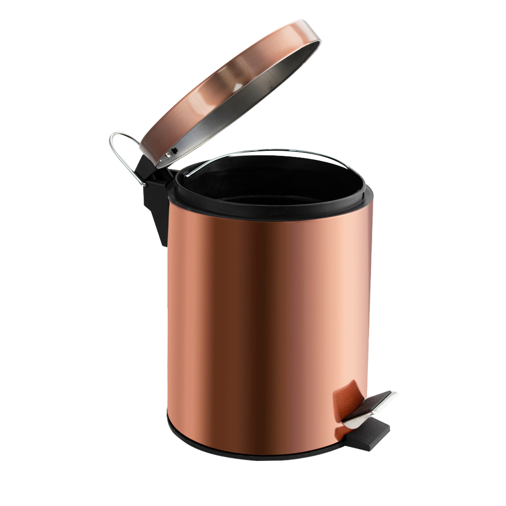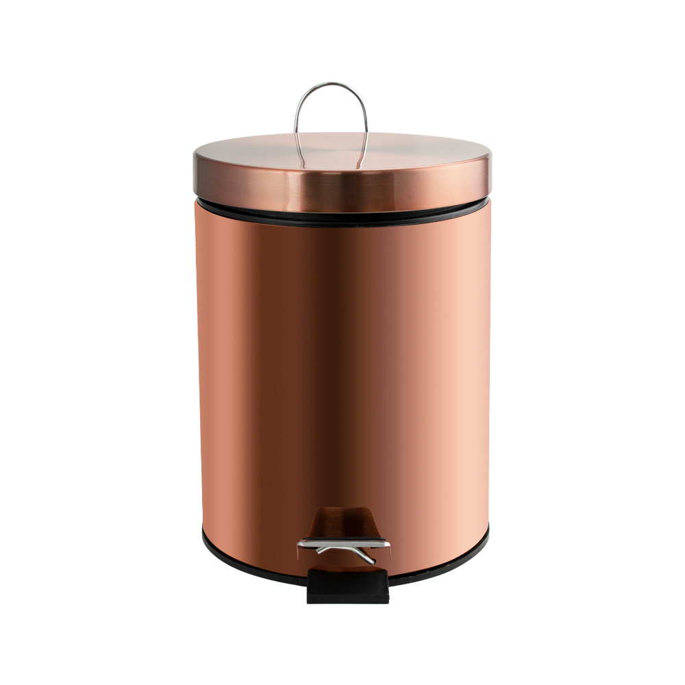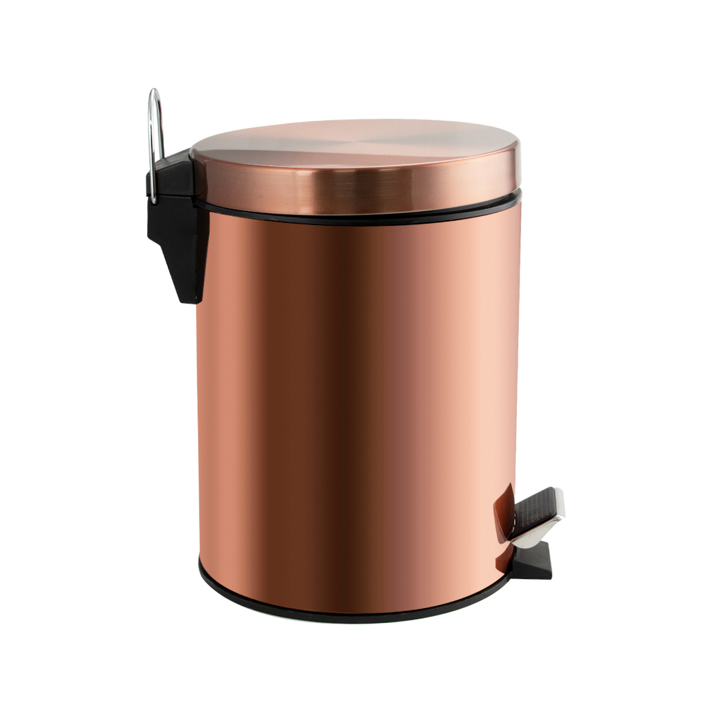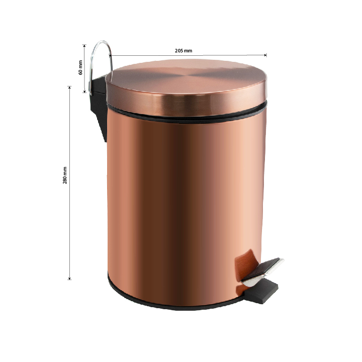 Круглое ведро, цвета медь, для хранения мусора с педалью и откидной крышкой прекрасно подойдет для ванной комнаты, туалета или кухни и офиса. Ведро оснащено пластиковым гигиеническим контейнером с металлической ручкой для переноса и механизмом поднятия крышки, при помощи нажатия на педаль. Объём ведра 5 литров. Отличное решение для утилизации мелкого бытового мусора. Наличие крышки обеспечивает защиту от неприятных запахов и распространения бактерий, а педальная система открывания позволяет не прикасаться к баку руками. Благодаря современному дизайну ведро впишется в интерьер любой кухни и ванной комнаты. Преимущества ведра для мусора с педалью: удобно устанавливается и перемещается на любое место; изготовлено из устойчивой к коррозии нержавеющей стали с покрытием под мед, глянцевое; пользоваться изделием удобно и гигиенично благодаря педали в нижней части корпуса. Нескользящая пластиковая основа ведра предотвращает повреждение пола. Габаритные размеры: высота 280 мм, диаметр 205 мм. Вес - 1,000 кг, объём -