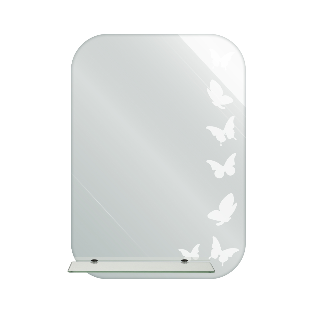 Зеркало с матированным рисунком - БАБОЧКИ. Простота и качество делают зеркало практичным дополнением к интерьеру ванной комнаты, прихожей или гардеробной. Модель не занимает много места на стене и благодаря возможности горизонтальной и вертикальной установки, поможет реализовать разные дизайнерские идеи. Особая обработка кромки украшает изделие, придавая ему аккуратный и законченный вид. Зеркало изготовлено из полотна AGC Mirox, толщина зеркального полотна 4 мм. Изделие демонстрирует значительную устойчивость к влажности помещения и перепаду температур. Профессиональный универсальный крепеж в комплекте, подходит для всех типов стен. Габаритные размеры: высота 700 мм, ширина 500 мм, длина полки 400 мм. Вес - 4,300 кг, объём - 0,00800 м3.