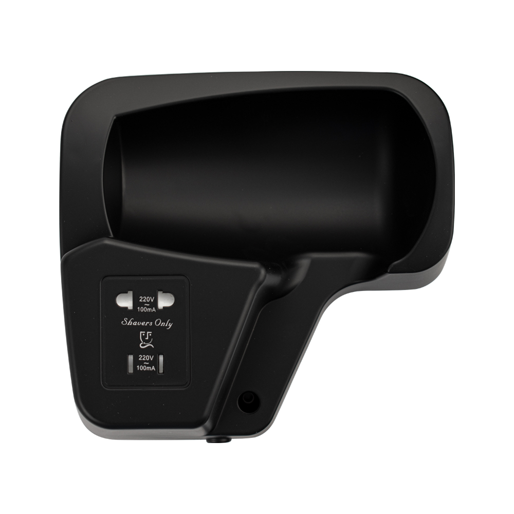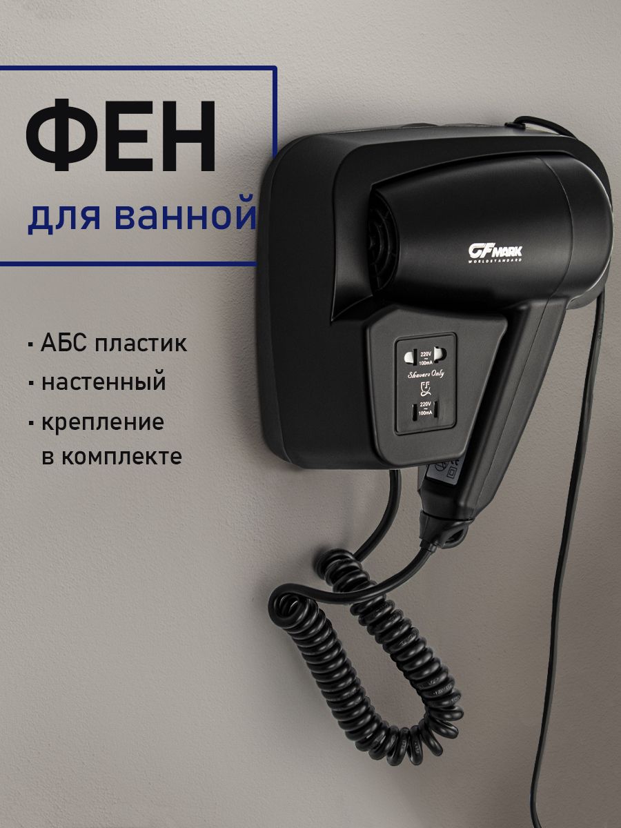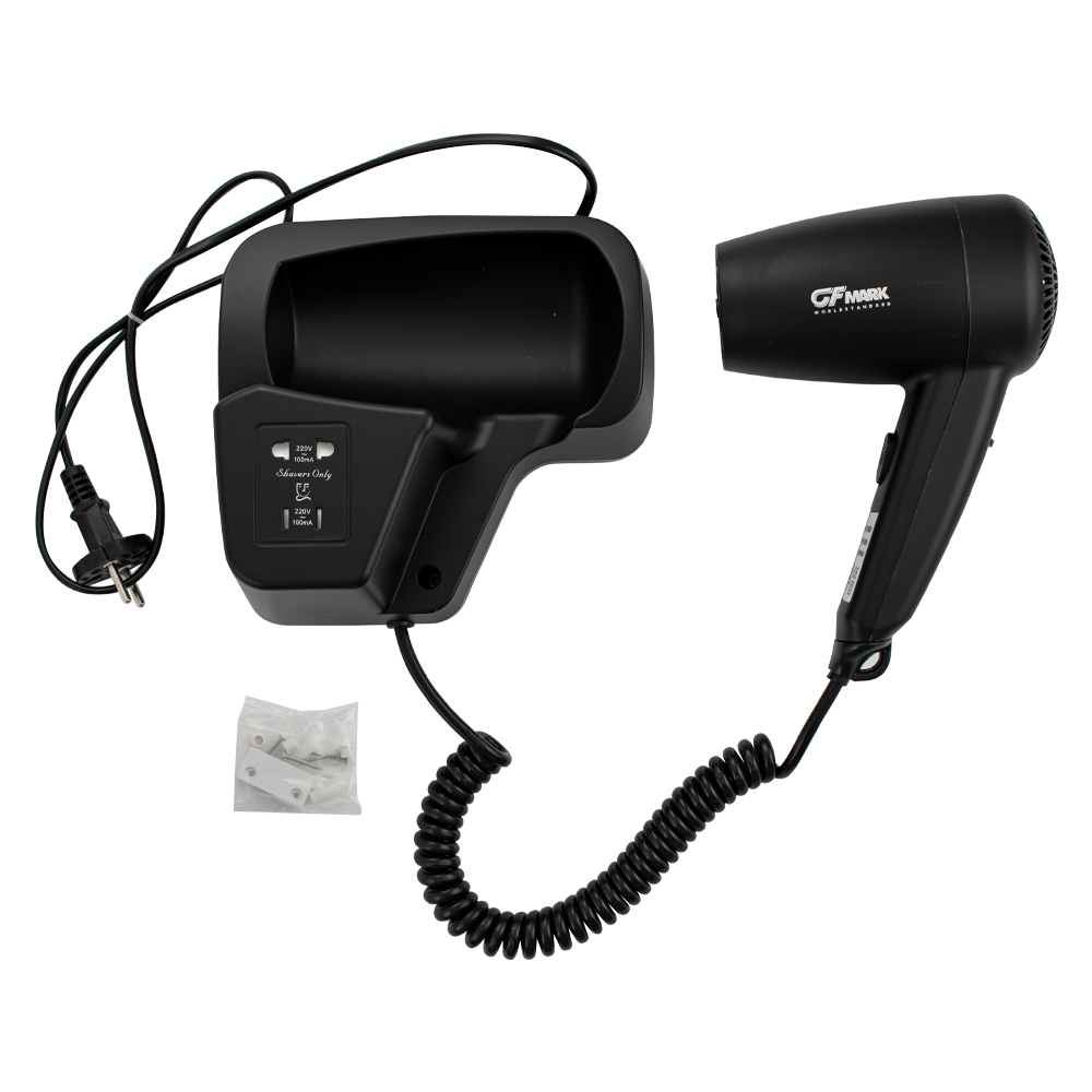 Фен для волос профессиональный, супермощный, черного цвета, в ванную комнату с боковым креплением с розеткой для бритвы, предназначен для сушки волос потоком теплого воздуха. Идеально подходит для установки в гостиницах, бассейнах, фитнес-клубах, в раздевалках складских и производственных комплексов. Так же может использоваться в личных ванных комнатах. Электрический фен позволяет комфортно и быстро высушить волосы после душа. Настенный держатель дает возможность хранить электроприбор в ванной комнате. Материал корпуса выполнен из белого высокопрочного пластика АБС, устойчивого к механическим повреждениям, перепадам температуры и коррозии. Поэтому электроприбор подходит не только для домашнего, но и для общественного использования – бассейны, сауны, душевые в спортивных залах. Благодаря небольшому весу феном удобно пользоваться. Параметры: +65°C, 1200 W, 220V/50-60Hz, скорость 18 м/с, защита - IPX4. Габаритные размеры: высота блока 165 мм, ширина блока 180 мм, глубина блока 90 мм, высота фена 210 мм, ширина ф