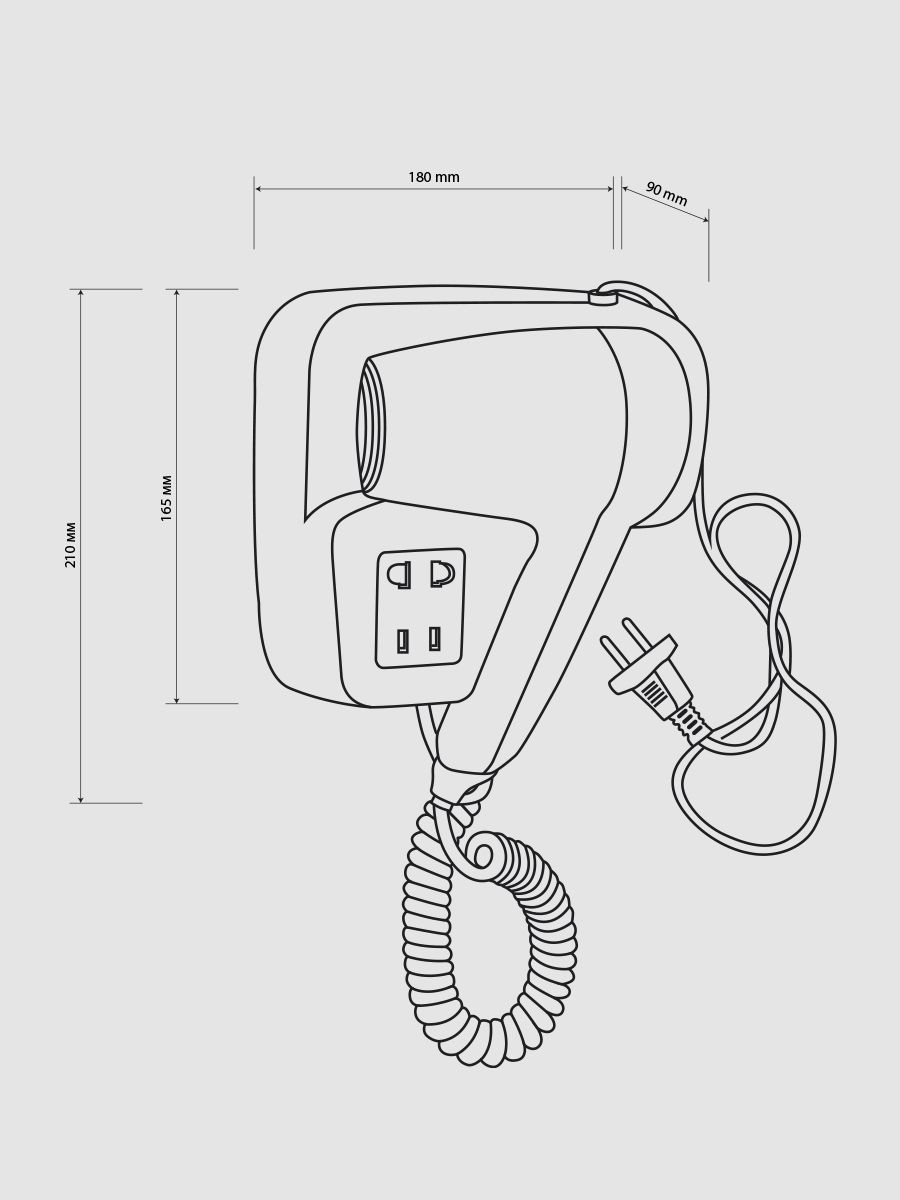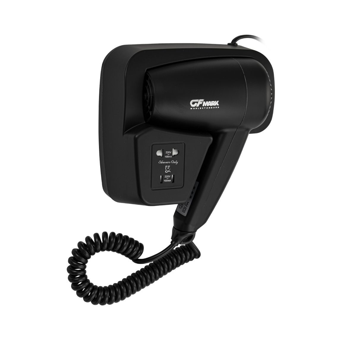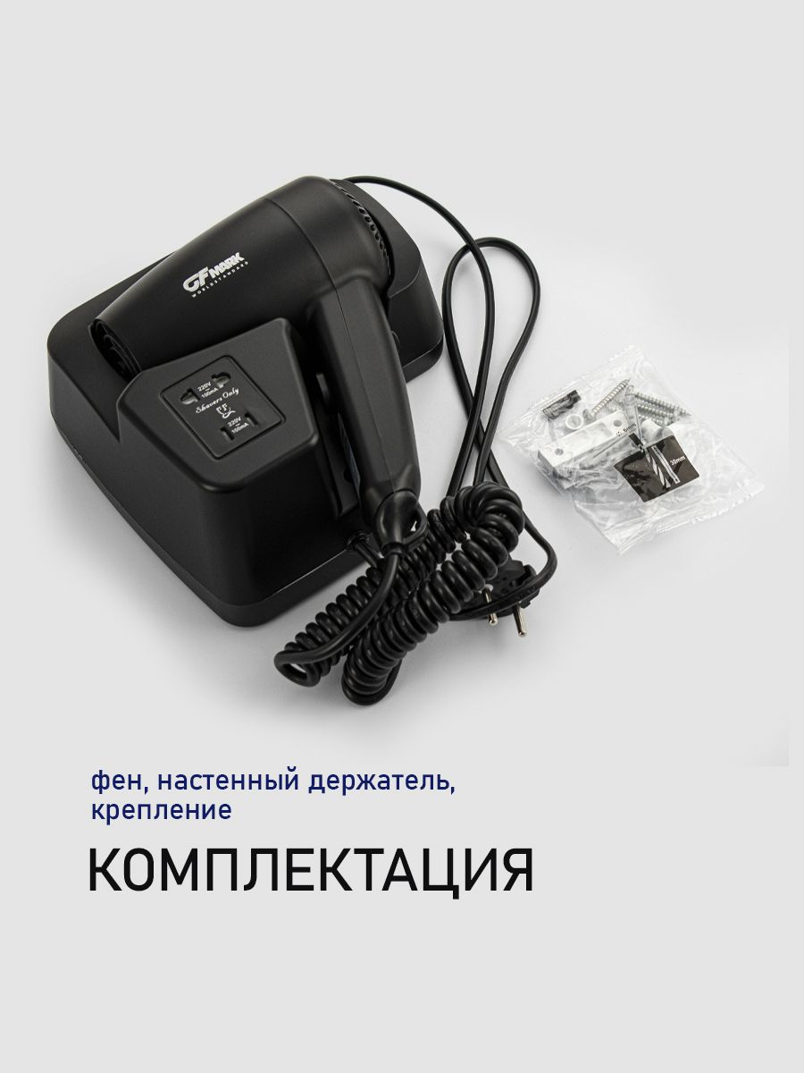 Фен для волос профессиональный, супермощный, черного цвета, в ванную комнату с боковым креплением с розеткой для бритвы, предназначен для сушки волос потоком теплого воздуха. Идеально подходит для установки в гостиницах, бассейнах, фитнес-клубах, в раздевалках складских и производственных комплексов. Так же может использоваться в личных ванных комнатах. Электрический фен позволяет комфортно и быстро высушить волосы после душа. Настенный держатель дает возможность хранить электроприбор в ванной комнате. Материал корпуса выполнен из белого высокопрочного пластика АБС, устойчивого к механическим повреждениям, перепадам температуры и коррозии. Поэтому электроприбор подходит не только для домашнего, но и для общественного использования – бассейны, сауны, душевые в спортивных залах. Благодаря небольшому весу феном удобно пользоваться. Параметры: +65°C, 1200 W, 220V/50-60Hz, скорость 18 м/с, защита - IPX4. Габаритные размеры: высота блока 165 мм, ширина блока 180 мм, глубина блока 90 мм, высота фена 210 мм, ширина ф