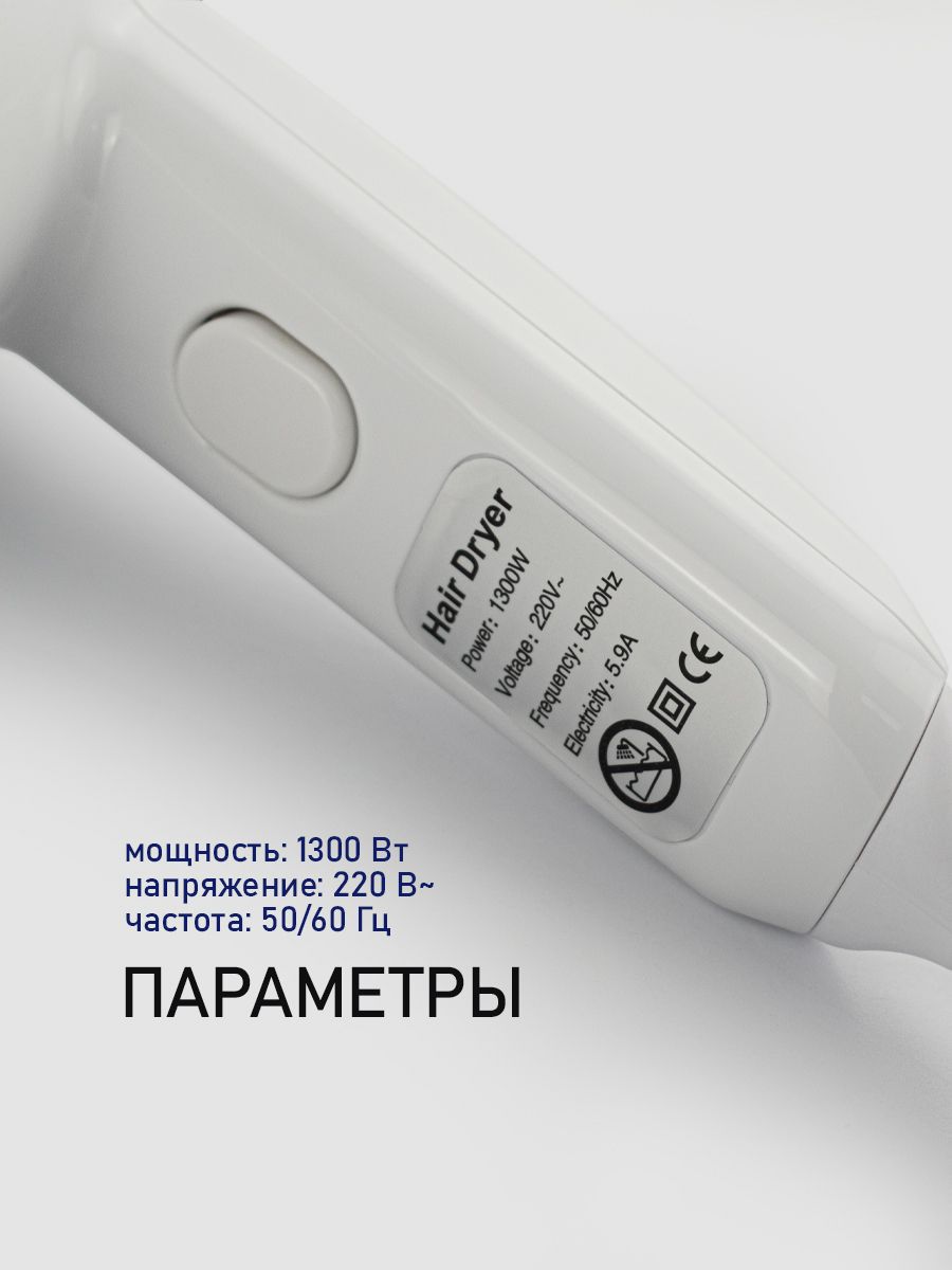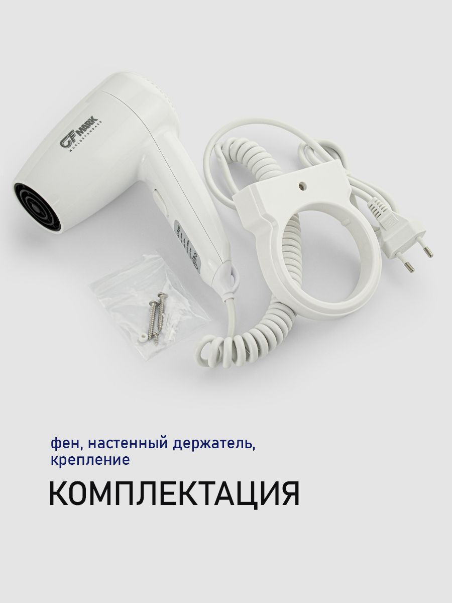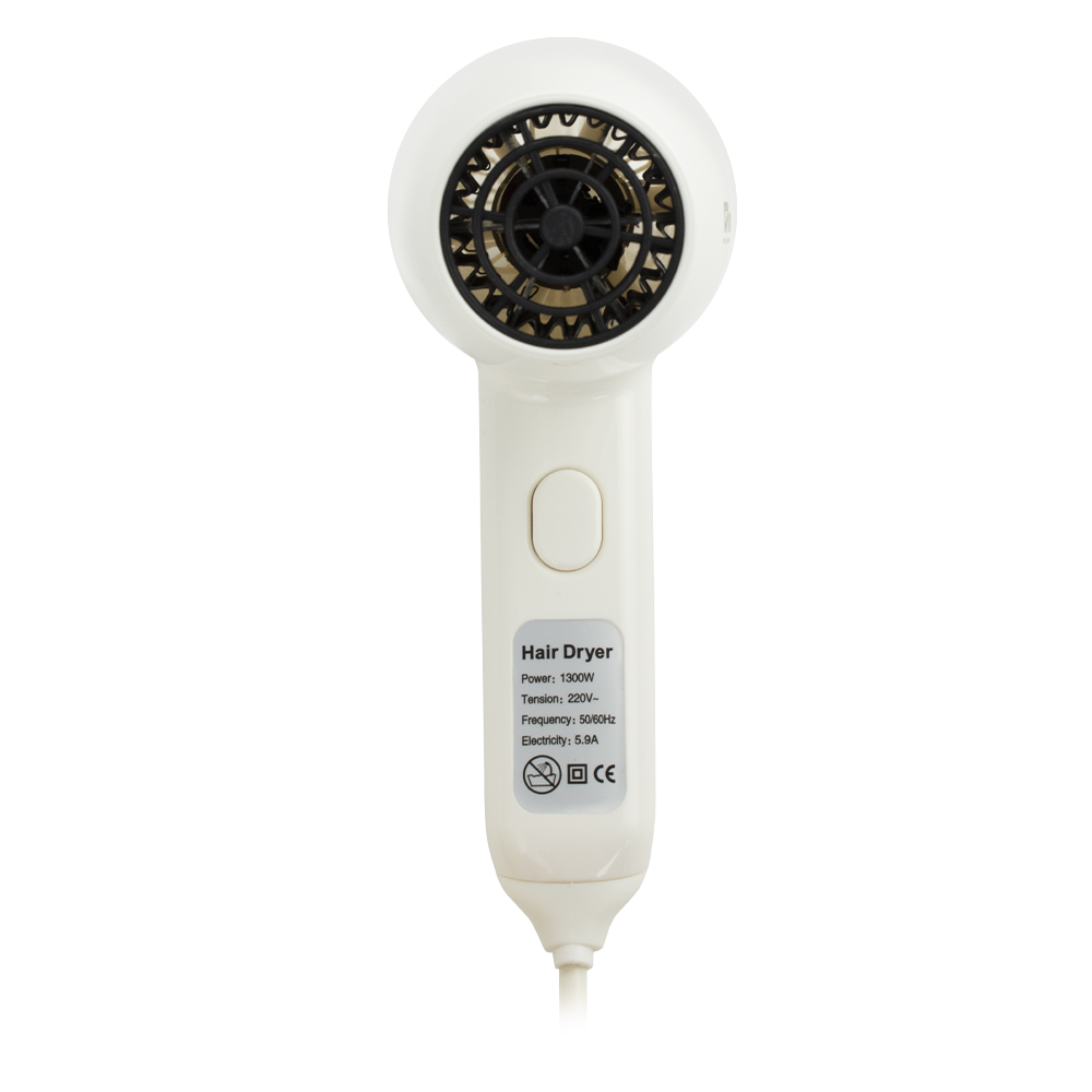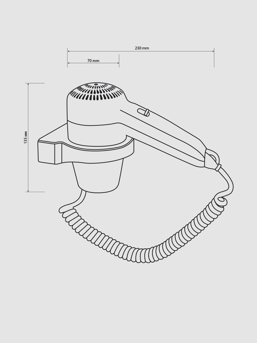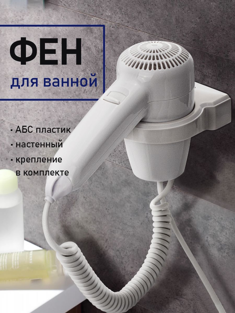 Фен для волос в ванную комнату с кольцевым креплением, предназначен для сушки волос потоком теплого воздуха. Идеально подходит для установки в гостиницах, бассейнах, фитнес-клубах, в раздевалках складских и производственных комплексов. Так же может использоваться в личных ванных комнатах. Электрический фен позволяет комфортно и быстро высушить волосы после душа. Настенный держатель дает возможность хранить электроприбор в ванной комнате. Материал корпуса выполнен из белого высокопрочного пластика АБС, устойчивого к механическим повреждениям, перепадам температуры и коррозии. Поэтому электроприбор подходит не только для домашнего, но и для общественного использования – бассейны, сауны, душевые в спортивных залах. Благодаря небольшому весу феном удобно пользоваться. Параметры: 1300W, 220В, 2 скорости. Скорость потока 17 м/с. Габаритные размеры: длина 230 мм, высота 135 мм, диаметр фена 70 мм, длина шнура розетки 800 мм, длина пружинного шнура 380 - 600 мм. Вес - 0,700 кг, объем - 0,00503 м3.