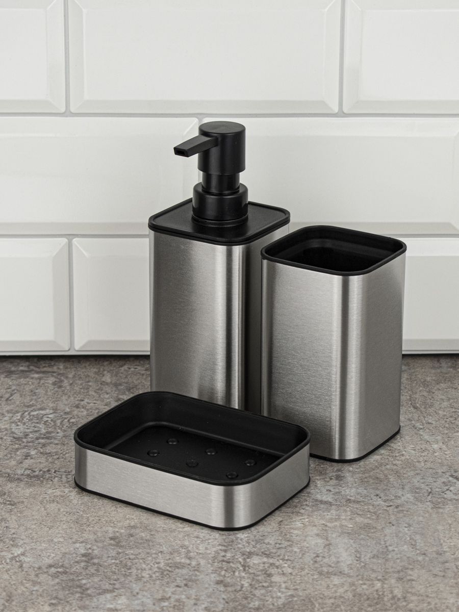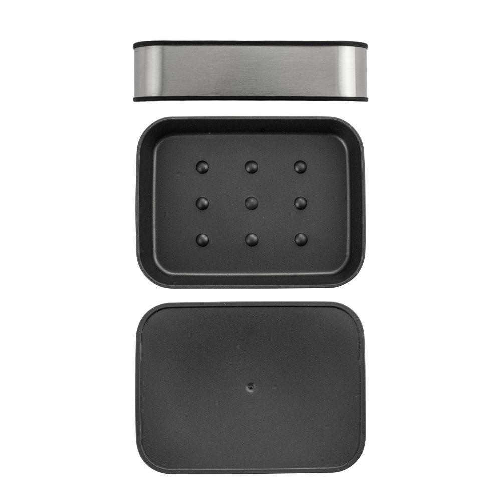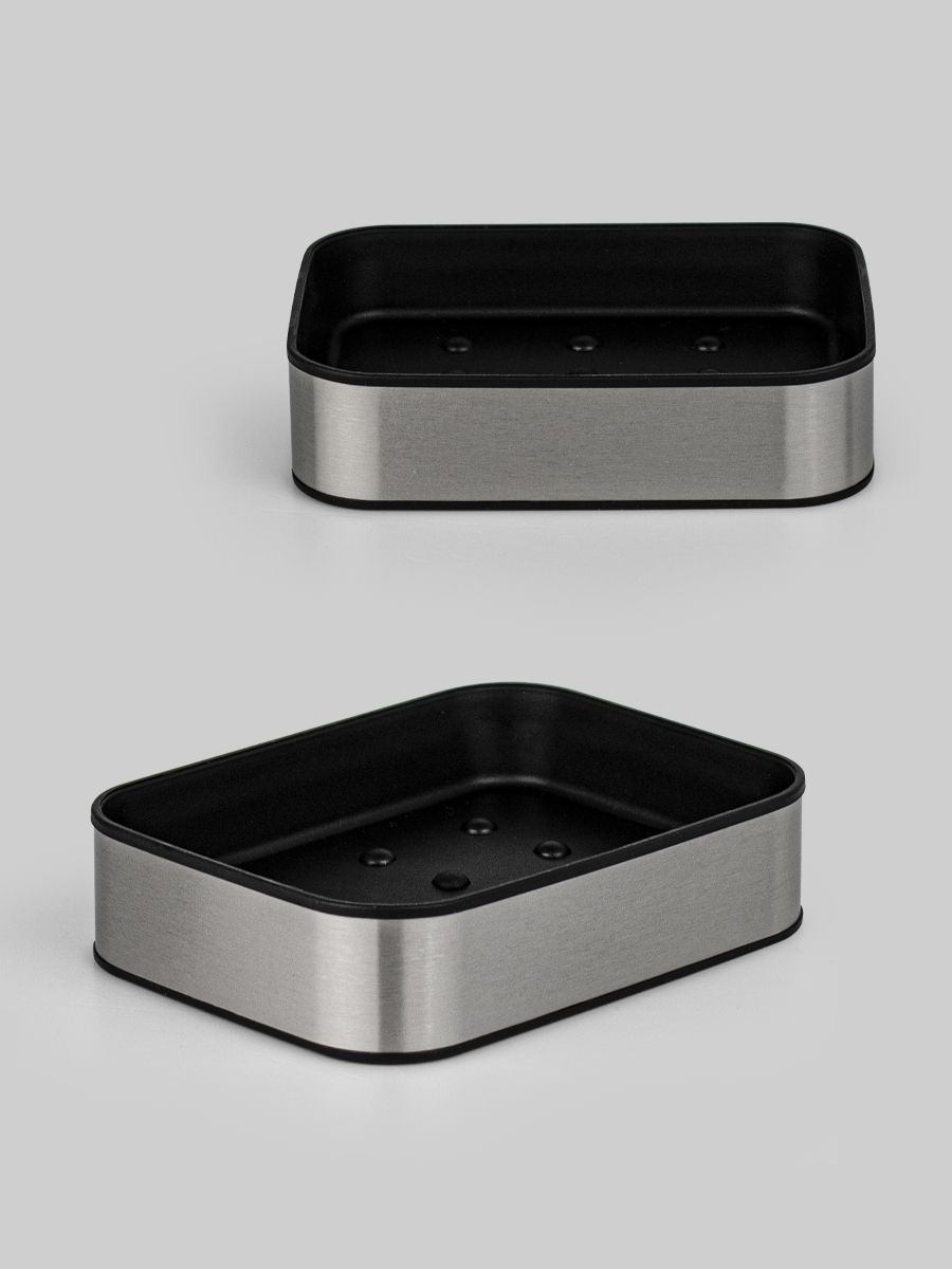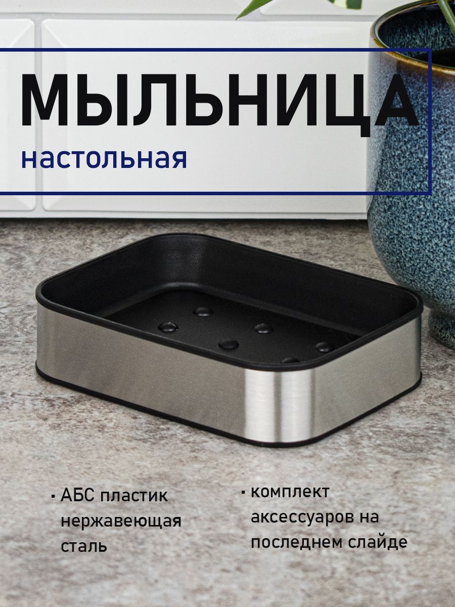 Мыльница для мыла настольная — необходимый аксессуар любой ванной комнаты и кухни. Приспособление обеспечит порядок и правильное хранение гигиенических принадлежностей. Изделие выполнено из нержавеющей стали с матовым покрытием и чёрного пластика АБС. Такое сочетание материалов делает конструкцию прочной и долговечной. Гармоничный дизайн отлично впишется в любой интерьер. Изделие имеет специальное покрытие, которое защищает его от влаги и придает ему стильный внешний вид. В коллекции представлены: дозатор для мыла, мыльница, напольный ершик для унитаза, стакан для зубных щеток. Габаритный размеры: высота 30 мм,основание 90*120 мм. Вес - 0,200 кг, объём - 0,00063 м3.