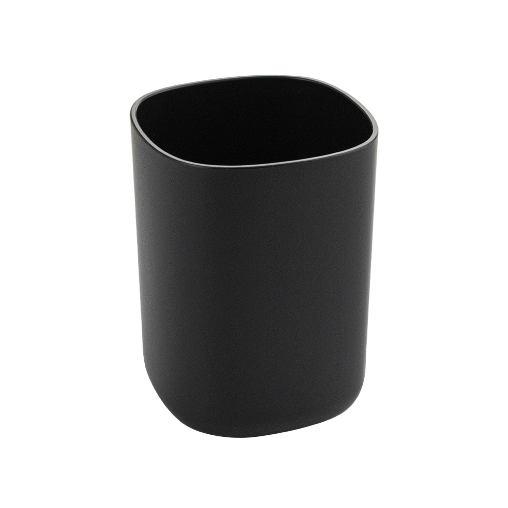 Стакан для зубных щёток и паст настольный — необходимый аксессуар любой ванной комнаты и кухни. Приспособление обеспечит порядок и правильное хранение гигиенических принадлежностей. Изделие выполнено из пластика АБС с чёрным матовым покрытием. Такое сочетание материалов делает конструкцию прочной и долговечной. Гармоничный дизайн и чёрный матовый цвет отлично впишется в любой интерьер. Изделие имеет специальное покрытие, которое защищает его от влаги и придает ему дизайнерский внешний вид. В коллекции представлены: дозатор для мыла, мыльница, напольный ершик для унитаза, стакан для зубных щеток. Габаритные размеры: высота стакана 100 мм, ширина 75 мм, глубина 75 мм. Вес - 0,100 кг, объём - 0,00095 м3