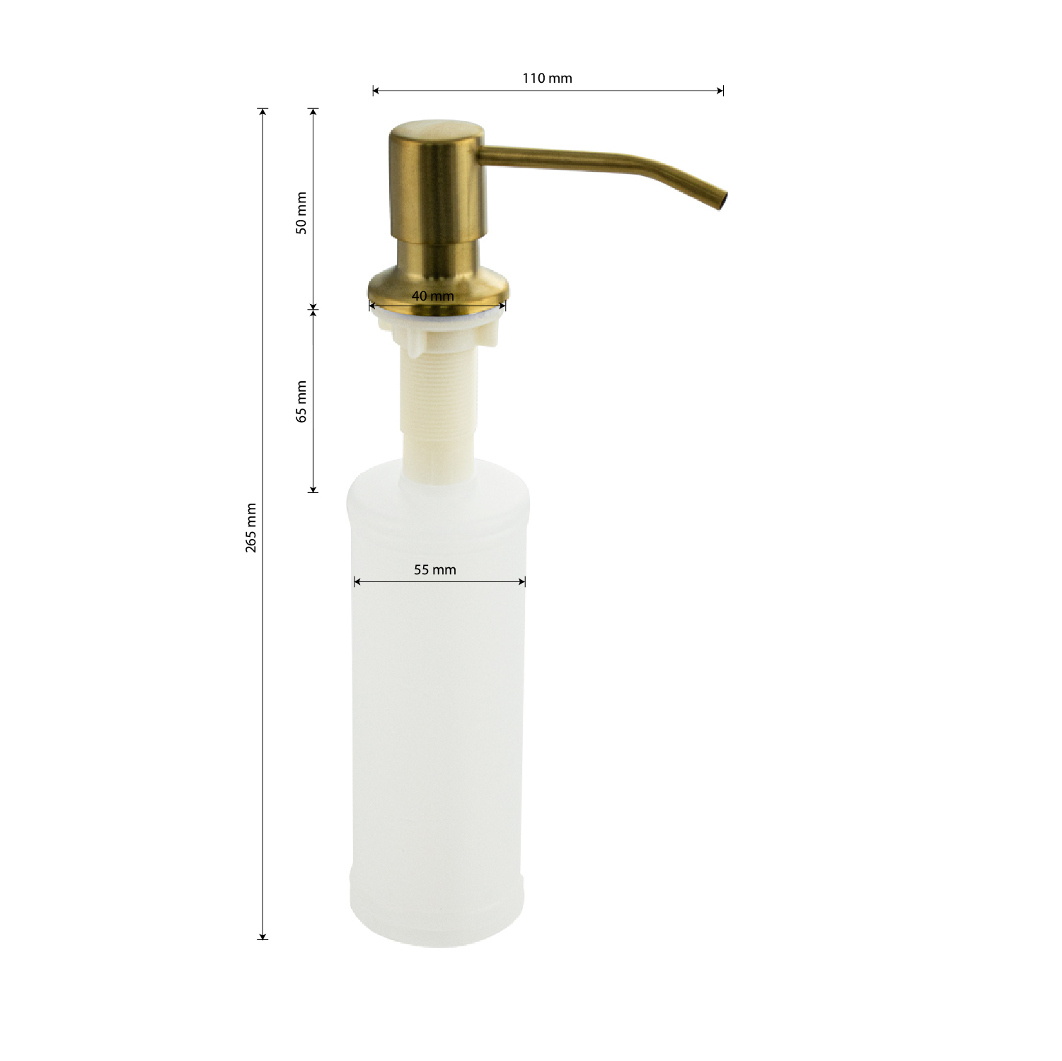 Дозатор для жидкого мыла и моющих средств, под золото, врезной, можно установить на кухонную мойку, если в ней предусмотрено место под встраиваемый дозатор, или на столешницу в любом удобном месте. Антивандальный корпус дозатора изготовлен из высокопрочного ABS-пластика и нержавеющей стали. Требуемое отверстие для установки встраиваемого дозатора не менее 25 мм. Это очень удобный и полезный аксессуар на кухне. Наполнять его жидким моющим средством не сложно, нужно просто снять верхнюю часть дозатора и залить требуемое количество жидкого мыла в колбу, емкостью 300 мл. Последовательно нажимая на верхнюю часть дозатора, Вы получаете требуемое количество моющего средства. Габаритные размеры: высота 265 мм, ширина 110 мм, диаметр посадочного седла 40 мм, длины резьбы 65 мм. Вес - 0,150 кг, объем - 0,00150 м3.