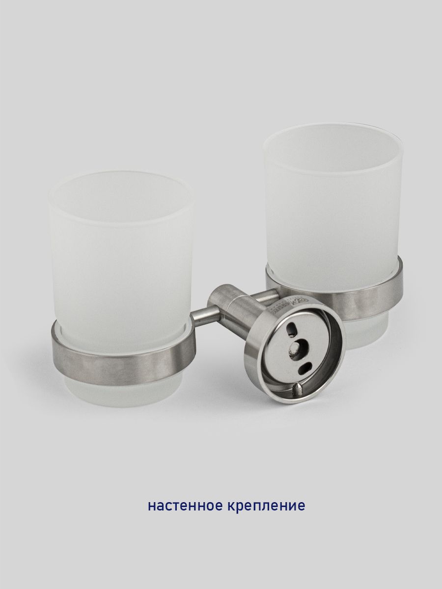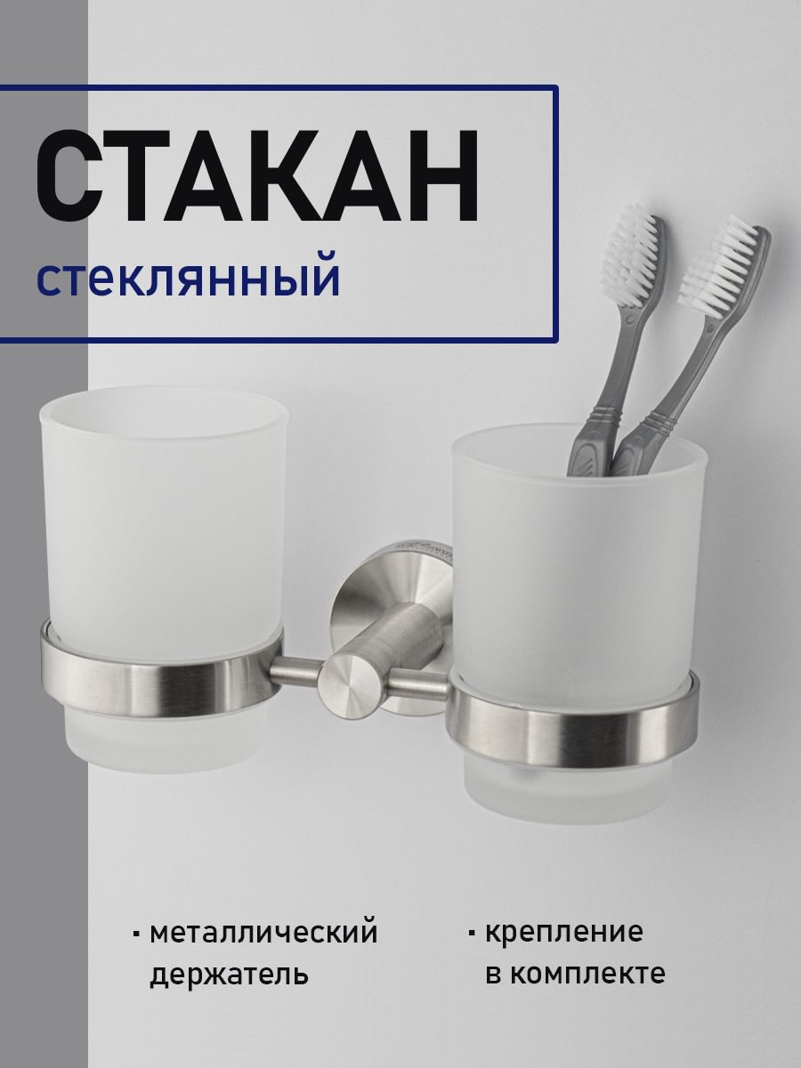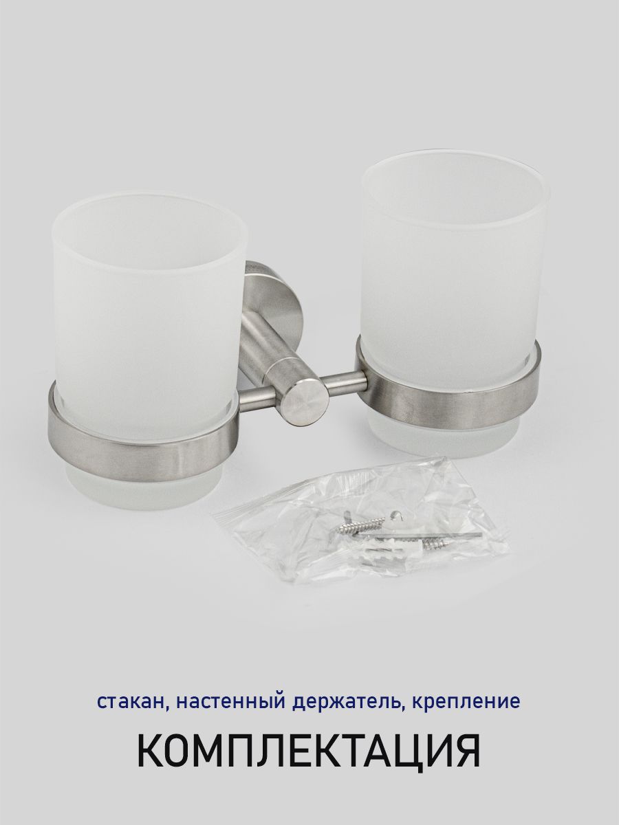 Стакан + стакан стеклянный с креплением к стене, правильной формы на основании. Изделие выполнено из матового стекла и металла с матовым покрытием. Изготовлен из прочной нержавеющей стали марки SUS 304 с матовым покрытием, которое придает безупречный стильный вид и долговечность. Идеально подойдет не только для ванной, но и для кухни. Изделие крепится к стене с помощью дюбелей и саморезов (входят в комплект). Габаритные размеры: высота стакана 95 мм, диаметр 65 мм, ширина 180 мм, глубина 80 мм, основание 50 мм. Вес - 0,800 кг, объём - 0,00347 м3.