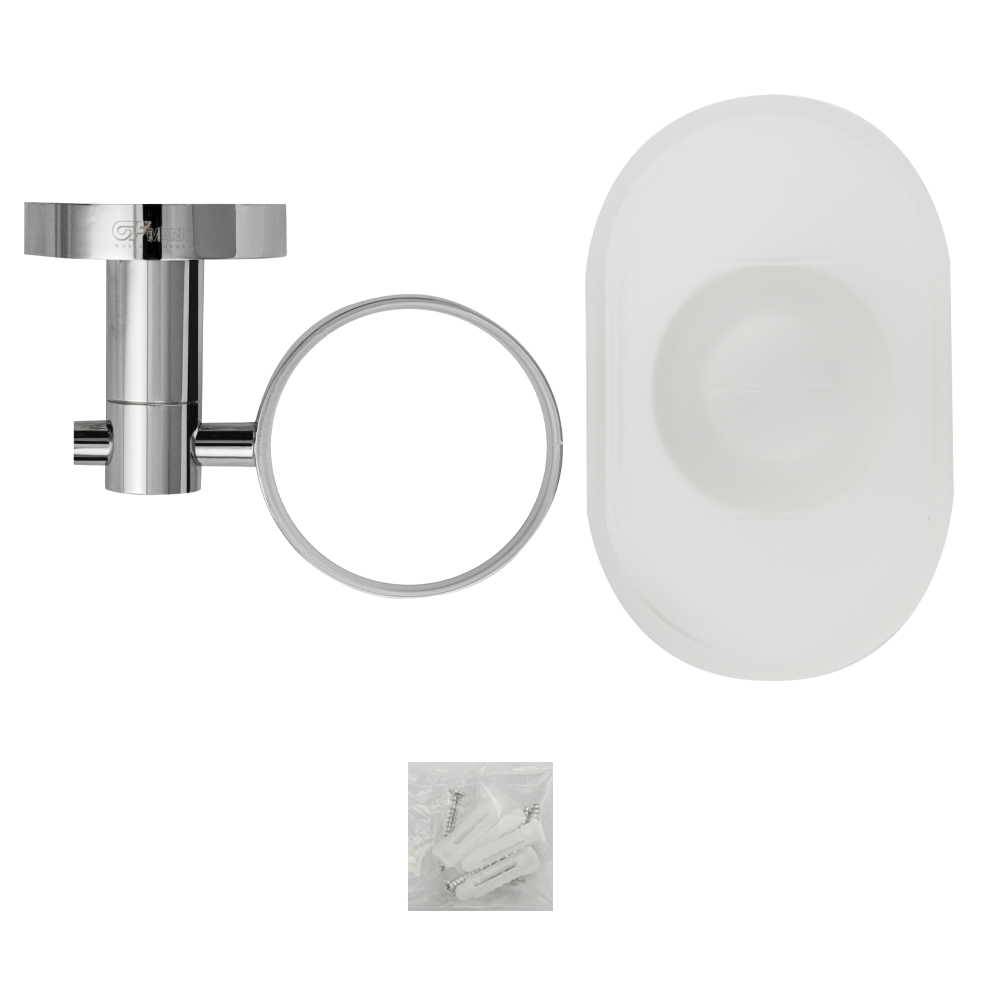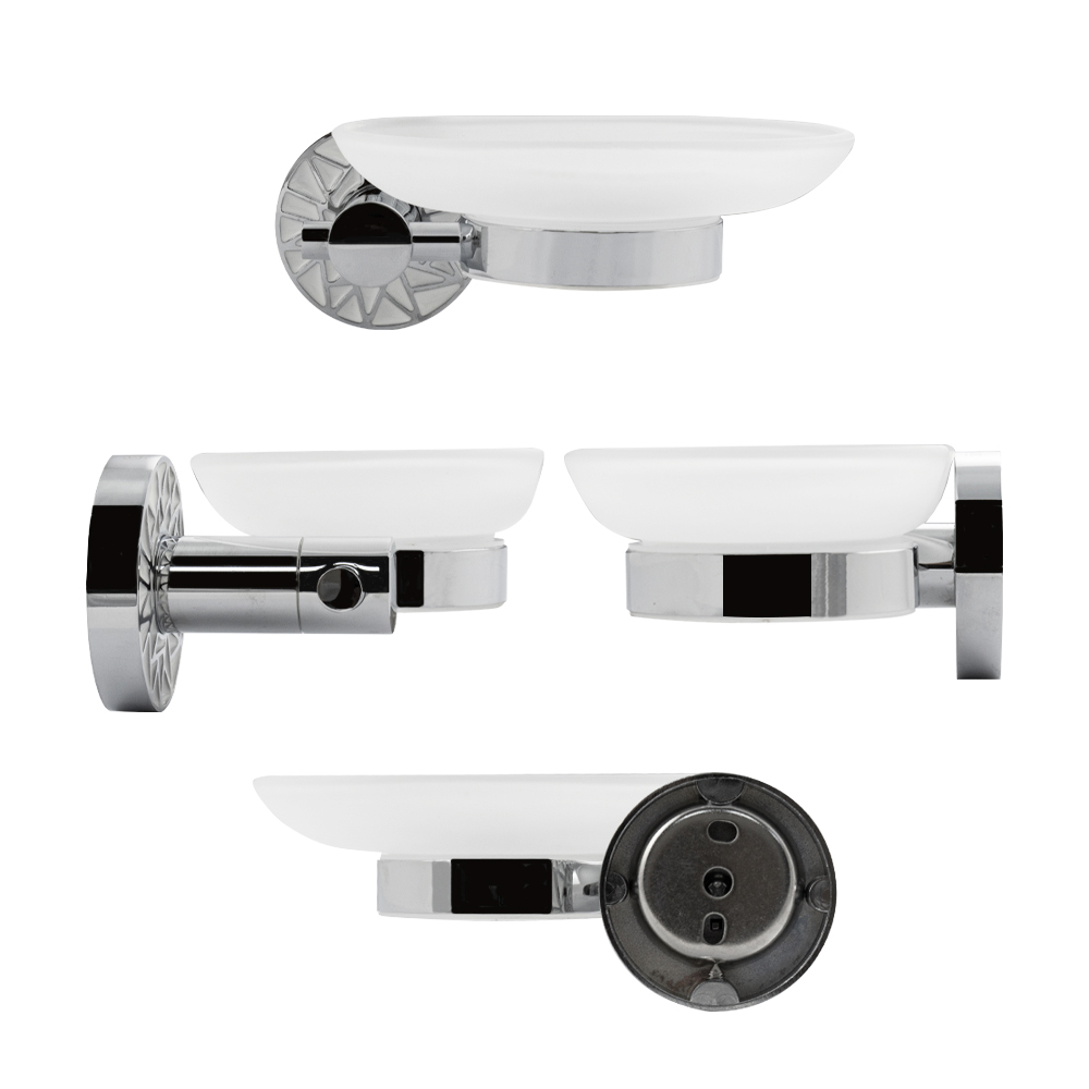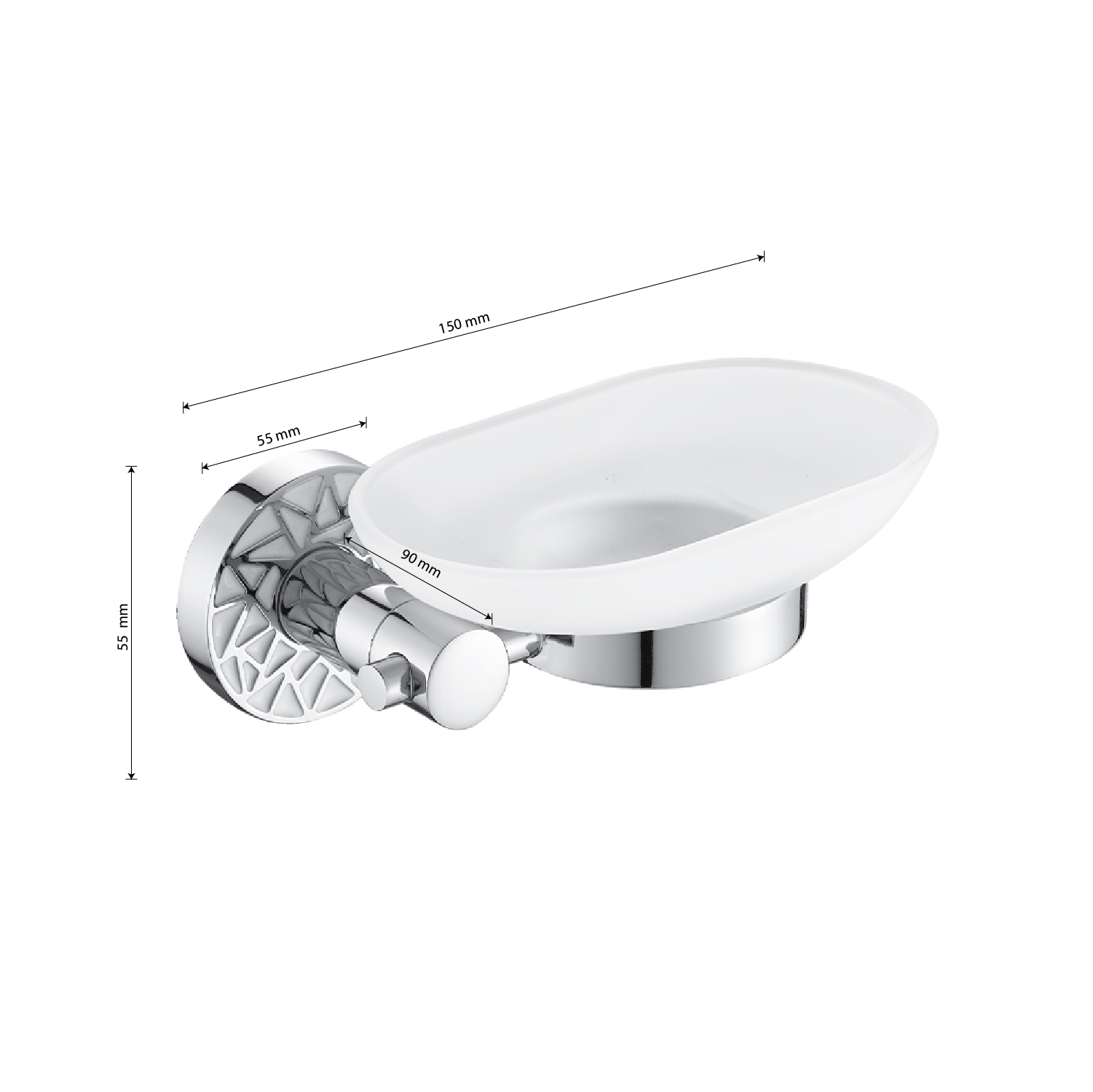 Мыльница подвесная, стеклянная с креплением к стене, овальной формы на основании, хромированная. Изделие выполнено из матового стекла и металла с хромированным покрытием. Материал изготовления — ЦАМ (цинк-алюминий-медь) + нержавеющая сталь. Хромированное покрытие очень стойко переносит истирания и обеспечивает зеркальный блеск изделия. Идеально подойдет не только для ванной, но и для кухни. Изделие крепится к стене с помощью дюбелей и саморезов (входят в комплект). Размеры: ширина 150 мм, глубина 90 мм, высота 55 мм, основание 55 мм. Вес - 0,500 кг, объём - 0,00158 м3.