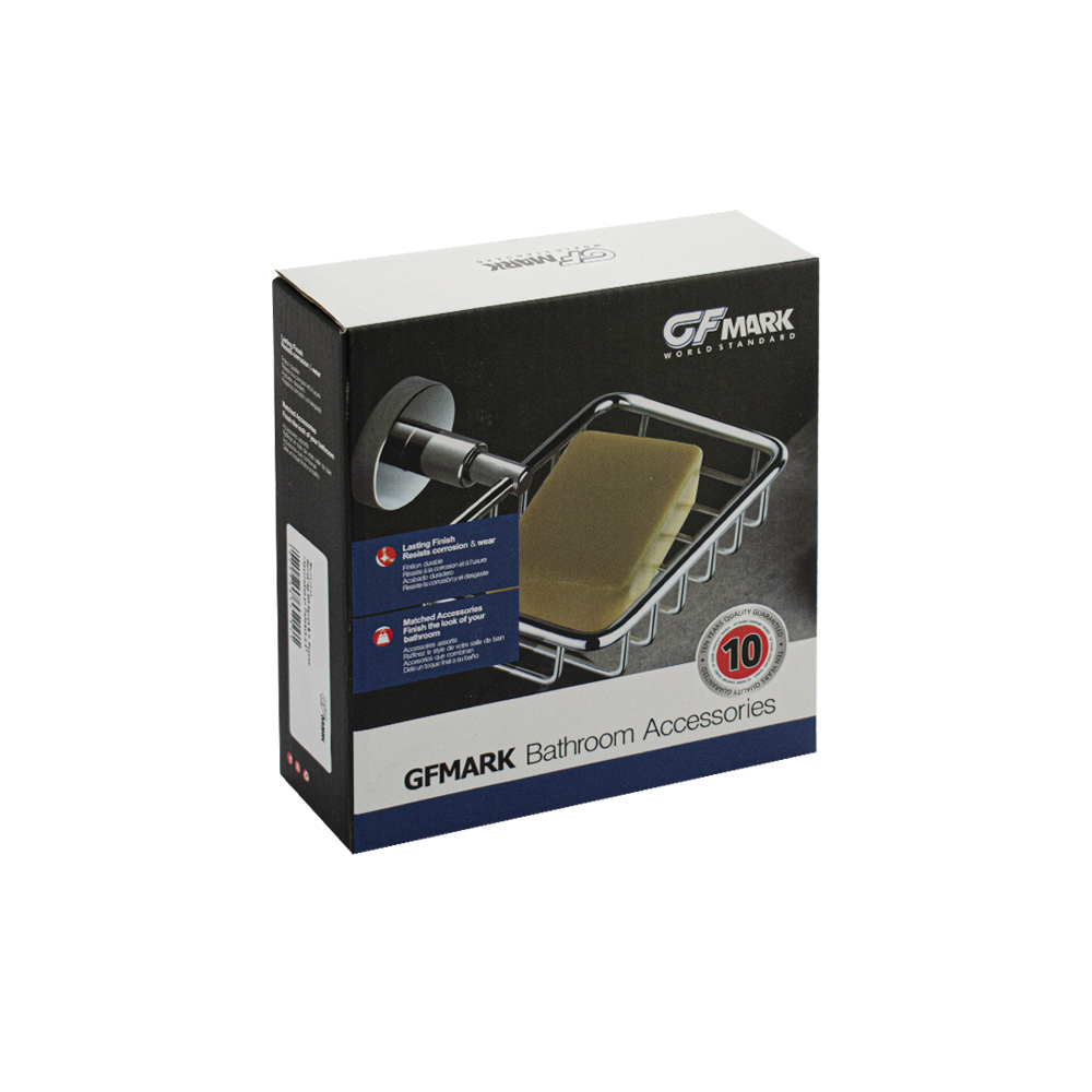 Мыльница подвесная, настенная, прямоугольной формы на основании, решетка, хромированная. Материал изготовления — ЦАМ (цинк-алюминий-медь) + нержавеющая сталь. Хромированное покрытие очень стойко переносит истирания и обеспечивает зеркальный блеск изделия. Сетчатый каркас не позволяет влаге скапливаться, поэтому мыло долгое время сохраняет свою форму. Идеально подойдет не только для ванной, но и для кухни. Изделие крепится к стене с помощью дюбелей и саморезов (входят в комплект). Габаритные размеры: ширина 175 мм, высота 50 мм, глубина 100 мм, диаметр посадочного седла 50 мм. Вес - 0,36 кг, объём - 0.00193 м3.