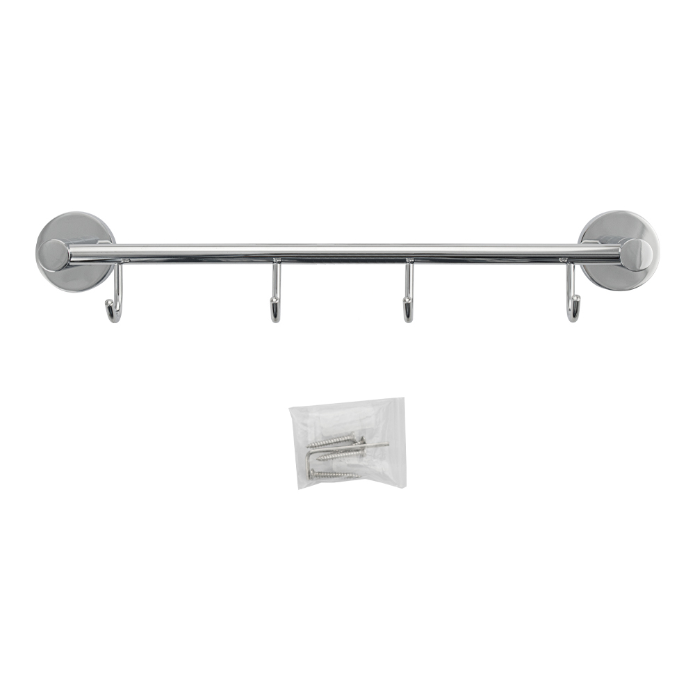 Держатель для полотенец металлический, хромированный, с четырьмя крючками. Материал изготовления — ЦАМ (цинк-алюминий-медь) + нержавеющая сталь. Хромированное покрытие очень стойко переносит истирания и обеспечивает зеркальный блеск изделия. На держателе с легкостью можно размещать вещи для сушки или вешать, как полотенца, так и одежду перед походом в душ. Идеально подойдет не только для ванной, но и для кухни, а также для дачи или гаража - при необходимости на держатель можно вешать любые предметы. Изделие крепится к стене с помощью дюбелей и саморезов (входят в комплект). Габаритные размеры: длина 390 мм, высота 60 мм, глубина 90 мм, диаметр посадочного седла 50 мм. Вес - 0.45 кг, объём - 0.00288 м3.