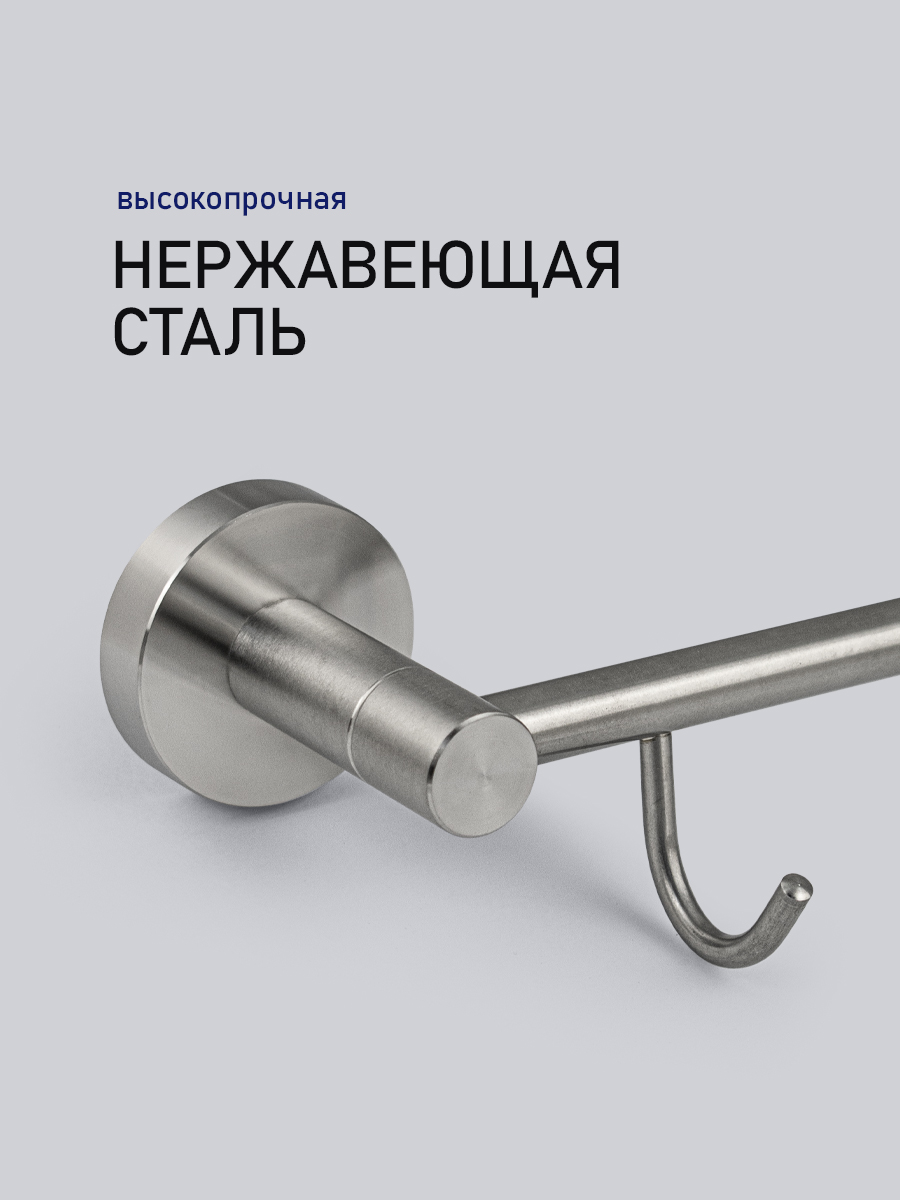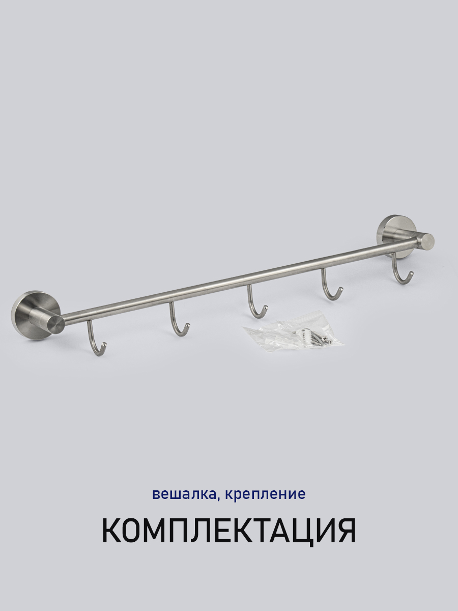 Держатель для полотенец металлический с пятью крючками. Изготовлен из прочной нержавеющей стали марки SUS 304 с матовым покрытием, которое придает безупречный стильный вид и долговечность. На держателе с легкостью можно размещать вещи для сушки или вешать, как полотенца, так и одежду перед походом в душ. Идеально подойдет не только для ванной, но и для кухни, а также для дачи или гаража - при необходимости на держатель можно вешать любые предметы. Изделие крепится к стене с помощью дюбелей и саморезов (входят в комплект). Размеры: длина 490 мм, высота 55 мм, глубина 85 мм. Вес - 0,500 кг, объём - 0,00336 м3.