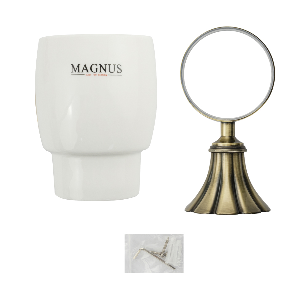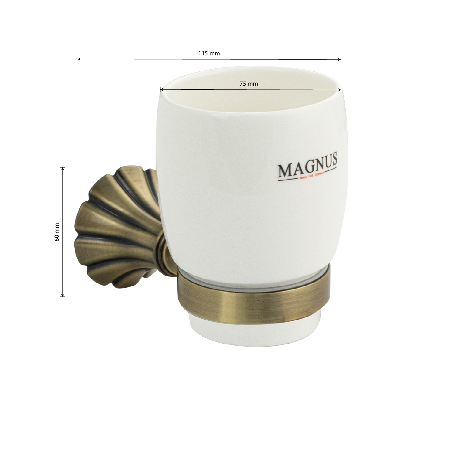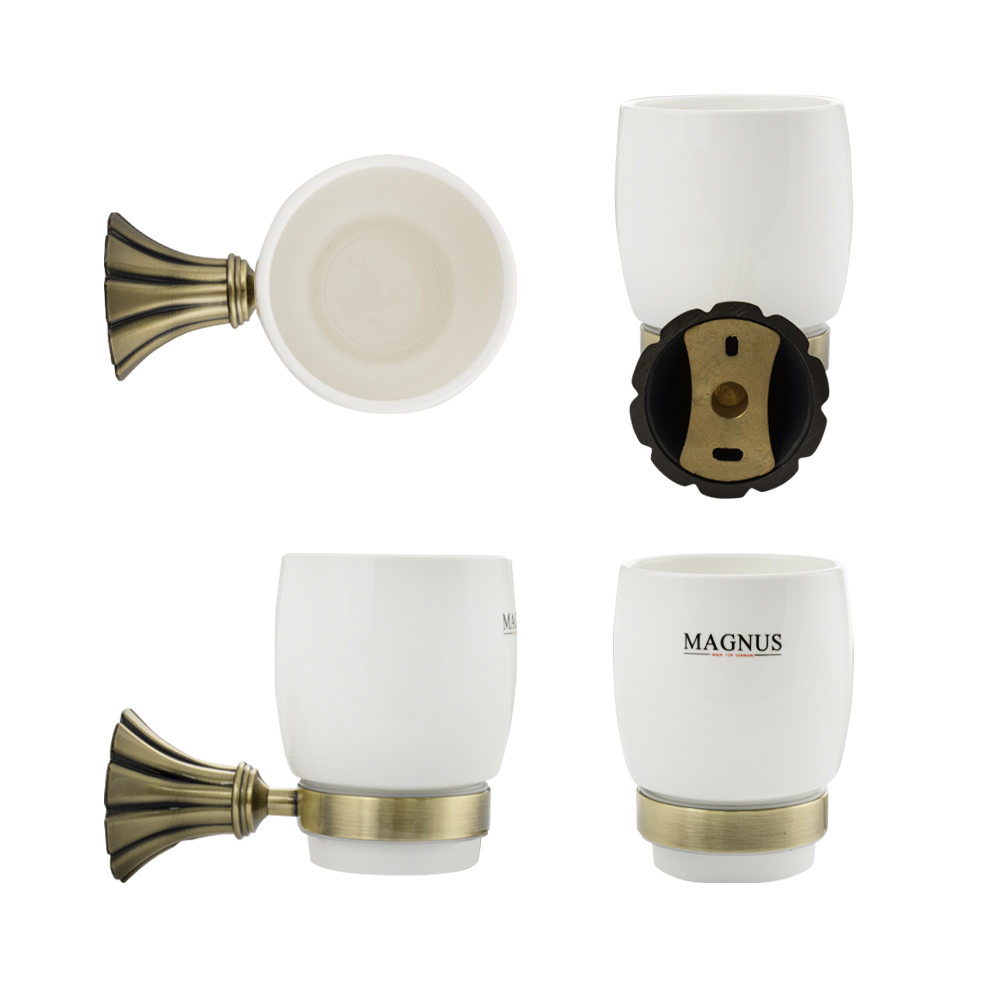 Стакан керамический с креплением к стене, правильной формы, на основании. Изделие выполнено из белой керамики и металла. Материал изготовления — латунь. Имеет специальное бронзовое, матовое покрытие, которое защищает изделие от влаги и придает ему безупречный стильный вид и долговечность. Идеально подойдет не только для ванной, но и для кухни. Изделие крепится к стене с помощью дюбелей и саморезов (входят в комплект). Габаритные размеры: высота 95 мм, диаметр 75 мм, глубина 115 мм. Вес - 0,600 кг, объём - 0,00185 м3.