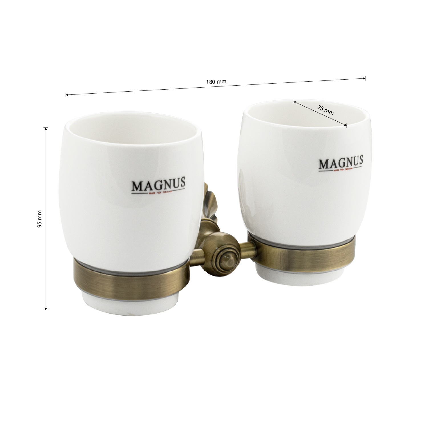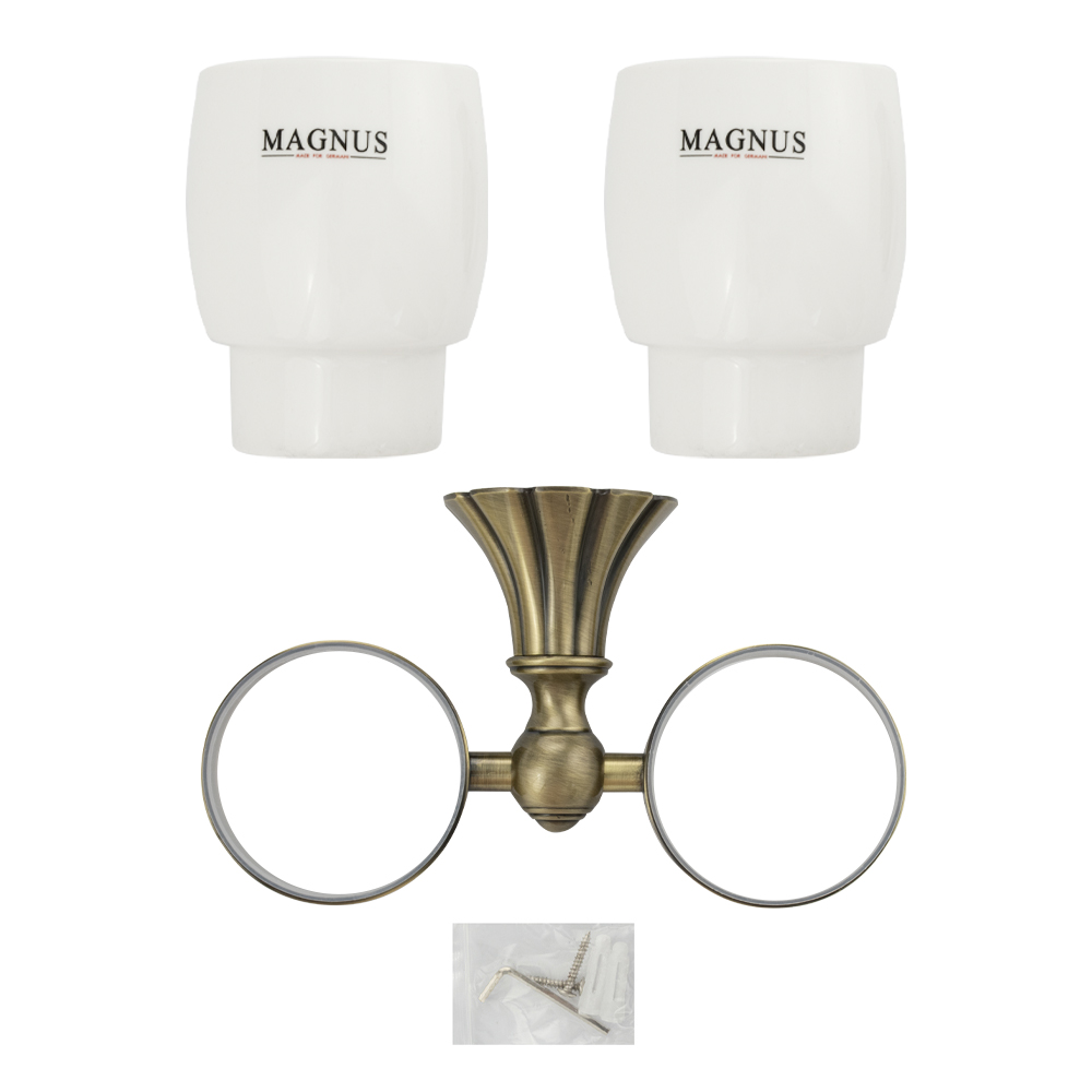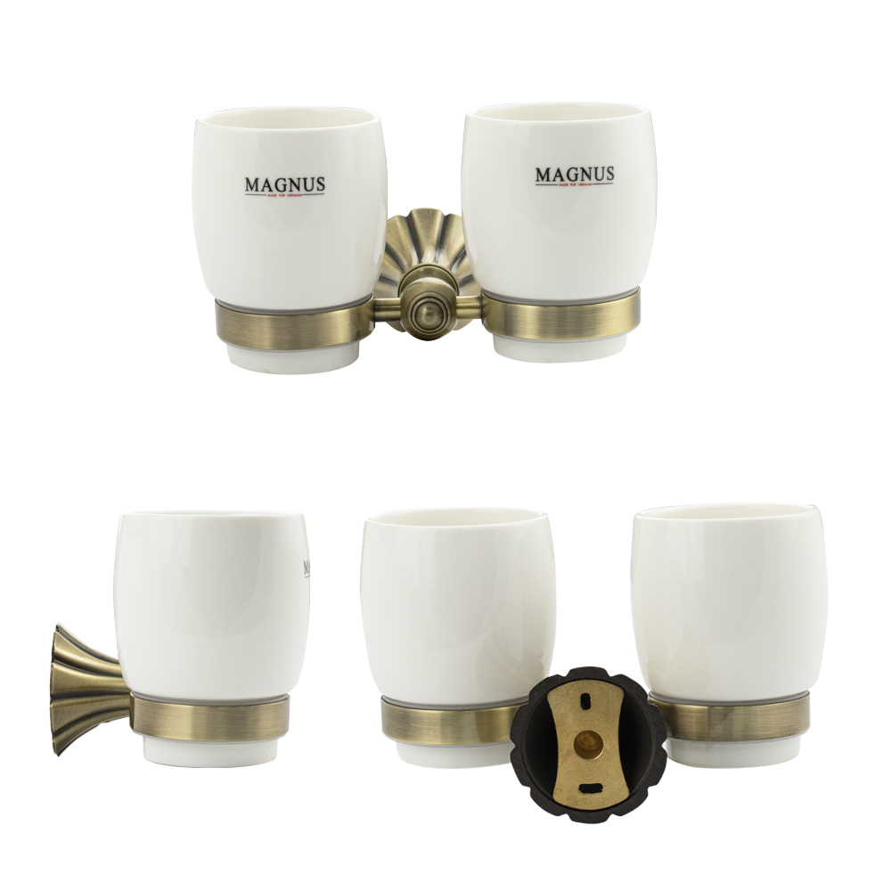Стакан + стакан керамические с креплением к стене, правильной формы на основании. Изделие выполнено из белой керамики и металла. Материал изготовления — латунь. Бронзовое покрытие очень стойко переносит истирания и обеспечивает стильный вид изделия. Идеально подойдет не только для ванной, но и для кухни. Изделие крепится к стене с помощью дюбелей и саморезов (входят в комплект). Габаритные размеры: высота стакана 95 мм, диаметр 75 мм, ширина 180 мм, основание 65 мм. Вес - 0,900 кг, объём - 0,00297 м3.