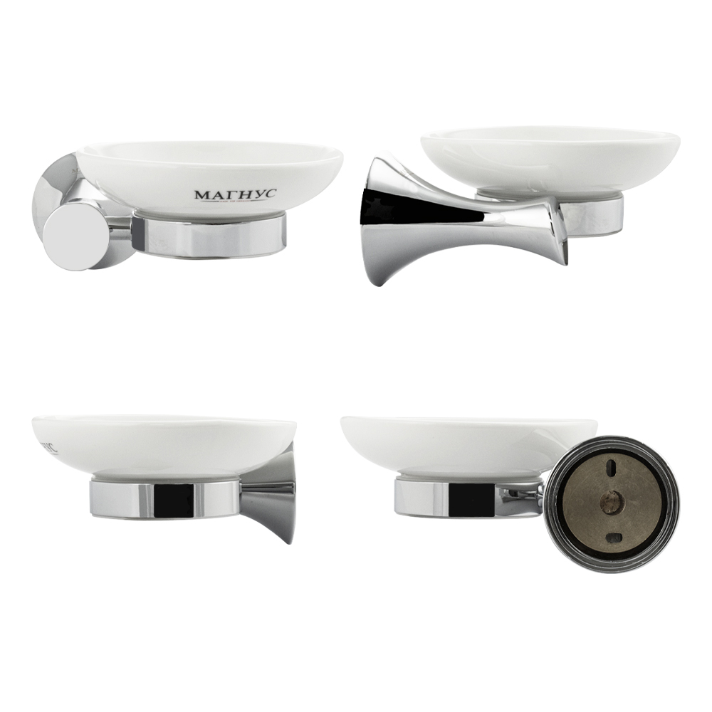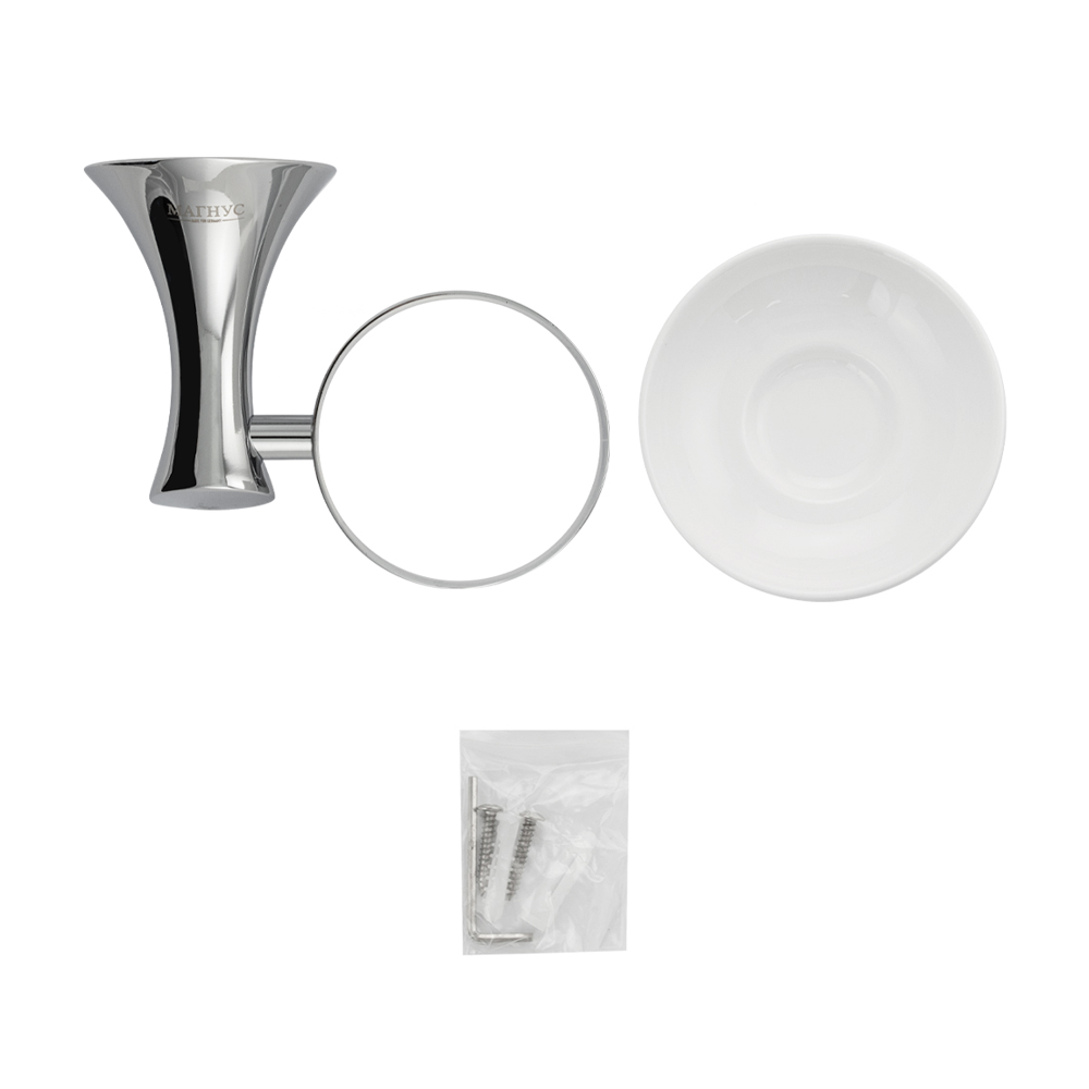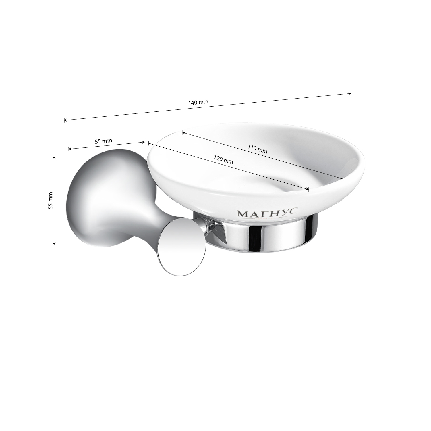 Мыльница подвесная, керамическая, с креплением к стене, круглой формы, на основании, хромированная. Изделие выполнено из белой керамики и металла с хромированным покрытием. Материал изготовления — ЦАМ (цинк-алюминий-медь) + нержавеющая сталь. Хромированное покрытие очень стойко переносит истирания и обеспечивает зеркальный блеск изделия. Идеально подойдет не только для ванной, но и для кухни. Изделие крепится к стене с помощью дюбелей и саморезов (входят в комплект). Размеры: ширина 140 мм, глубина 120 мм, высота 55 мм, диаметр чашки 110 мм, основание 55 мм. Вес - 0,600 кг, объём - 0,00180 м3.