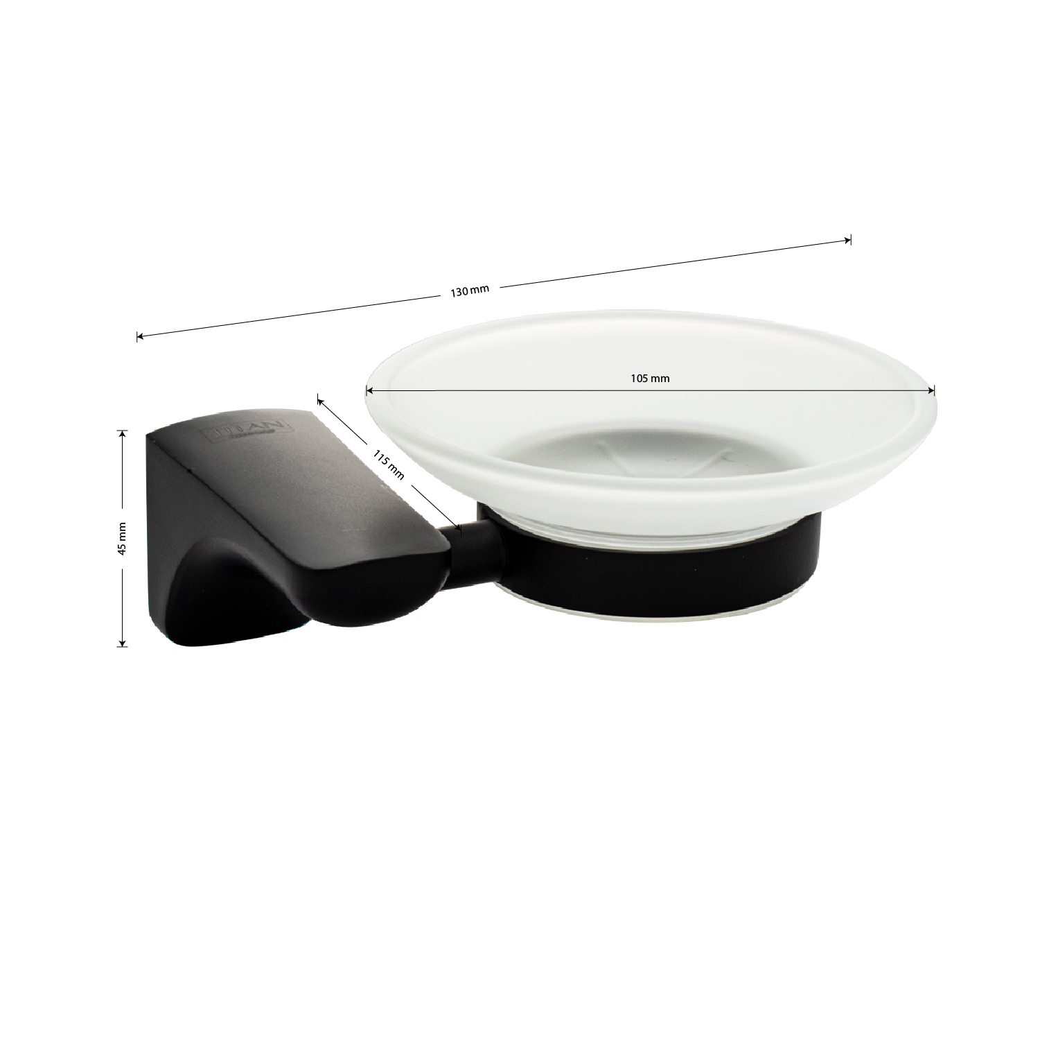 Мыльница подвесная, стеклянная с креплением к стене, круглой формы на основании, чёрного цвета. Изделие выполнено из матового стекла и металла с хромированным покрытием. Материал изготовления — ЦАМ (цинк-алюминий-медь) + нержавеющая сталь. Матовое покрытие очень стойко переносит истирания и обеспечивает представительский вид изделия. Идеально подойдет не только для ванной, но и для кухни. Изделие крепится к стене с помощью дюбелей и саморезов (входят в комплект). Габаритные размеры: ширина 130 мм, высота 45 мм, диаметр чашки 105, глубина 115 мм. Вес - 0,500 кг, объём - 0,00109 м3.