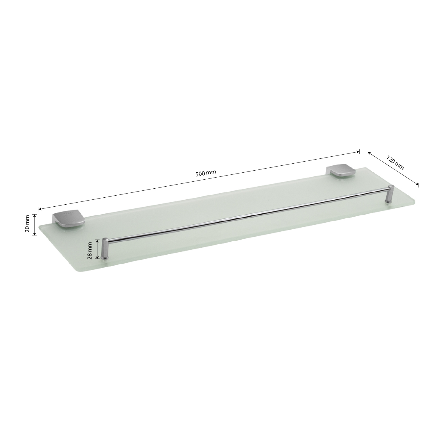 Прямоугольная полка из матового стекла с полированными краями о которые невозможно порезаться, с надежной фиксацией к стене с помощью крепления из металла с хромированным покрытием, идеально подходит для хранения различных ванных принадлежностей. Полочка изготовлена из качественного матового стекла и имеет бортик, предотвращающий падение ванных принадлежностей. Полка для ванной функциональное и практичное решение для любого интерьера. Хромированное покрытие креплений очень стойко переносит истирания и обеспечивает зеркальный блеск изделия. Идеально подойдет не только для ванной, но и для кухни. Изделие крепится к стене с помощью дюбелей и саморезов (входят в комплект). Габаритные размеры: ширина 500 мм, глубина 120 мм, высота 20 мм. Вес - 1,200 кг, объём - 0,00500 м3.