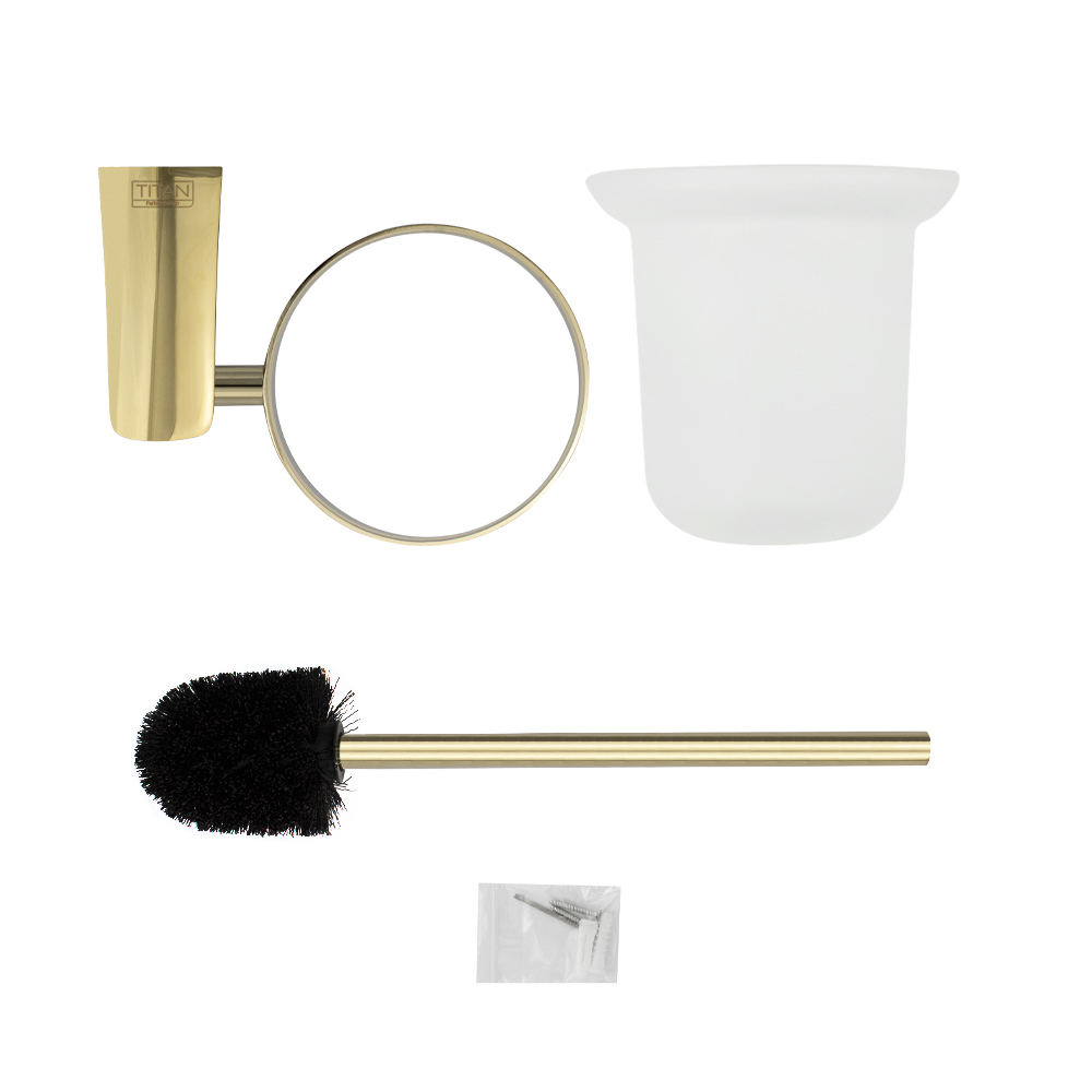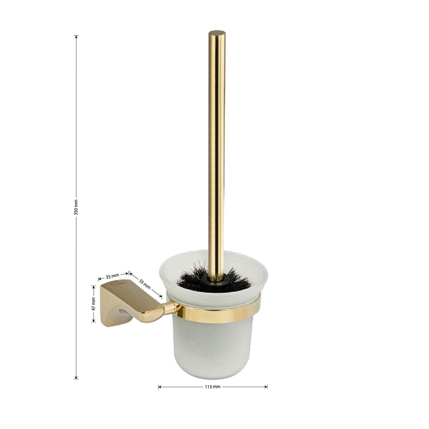 Ёршик со стеклянной матовой колбой, настенный, необходимый аксессуар любой туалетной комнаты. Приспособление обеспечит порядок и правильное хранение гигиенических принадлежностей. Изделие выполнено из стекла и металла с золотым покрытием. Жесткая щетина ерша гарантирует отличный результат очистки санузлов. Такое сочетание материалов делает конструкцию прочной и долговечной. Держатель колбы легко и удобно крепится к стене при помощи фурнитуры входящей в комплект поставки. Материал изготовления — ЦАМ (цинк-алюминий-медь) + нержавеющая сталь. Имеет специальное золотое покрытие, которое защищает изделие от влаги и придает ему блестящий внешний вид. Габаритные размеры: ширина 150 мм, высота 350 мм, высота колбы 105 мм, диаметр 115 мм. Вес - 0,860 кг, объём - 0,0076 м3.