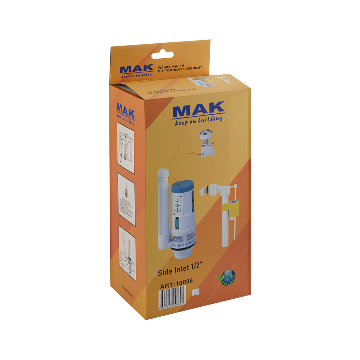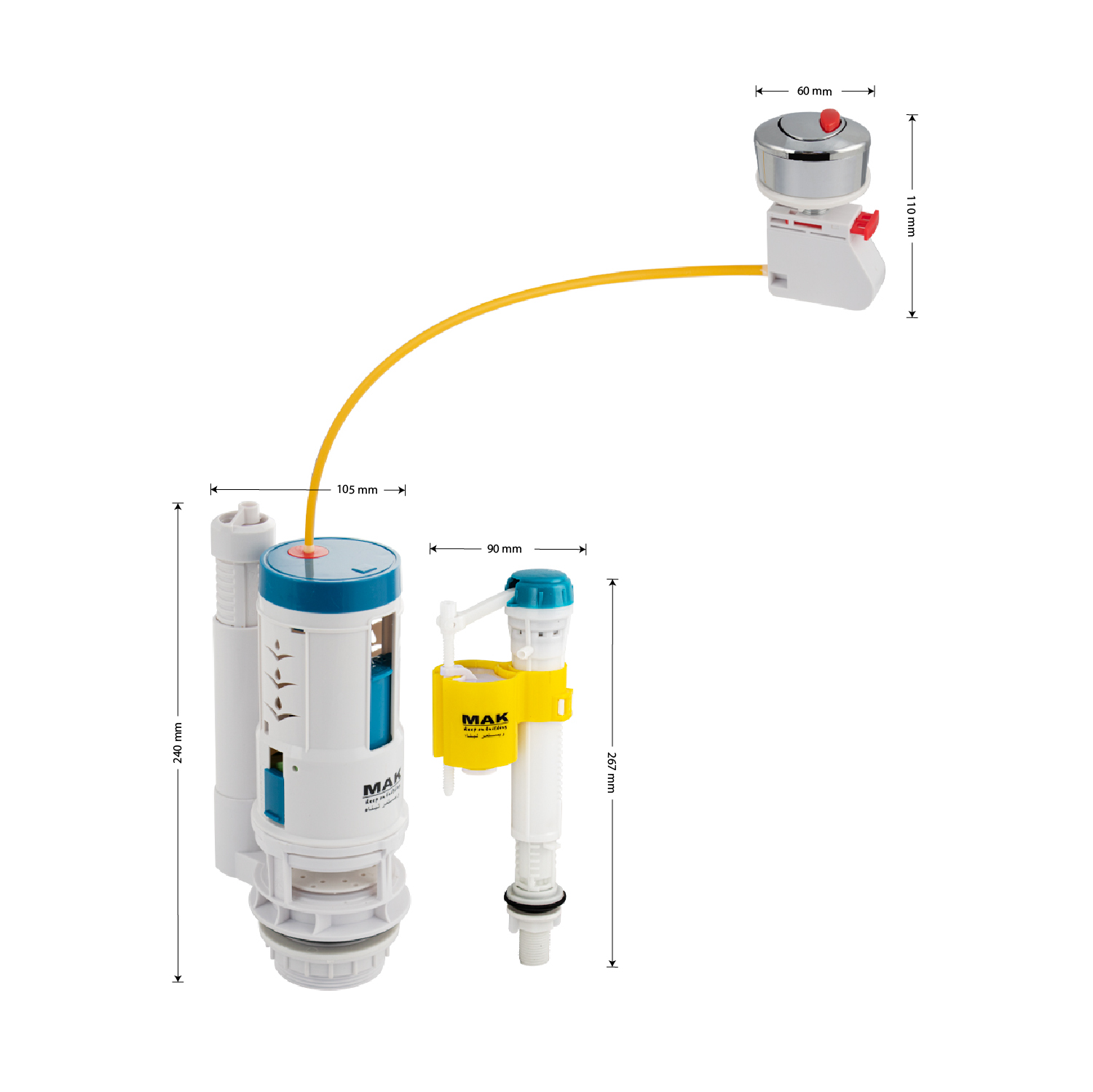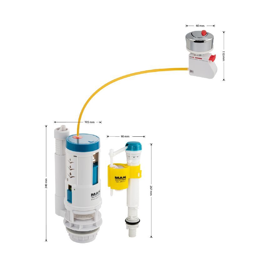 Комплект для бачка унитаза, ко всем моделям, универсальный, состоящий из впускного нижнего и выпускного клапана. Сливной механизм бачка имеет высокую хромированную кнопку, универсальный, подходит для бачков различной высоты, регулировка выпускного клапана производится ползунком на корпусе. Тросик на выпуском клапане позволяет устанавливать клапан в бачки любой высоты и конфигурации. Изделие выполнено из высококачественного пластика АБС, который обеспечивает длительное использование без поломок, отличается пониженным уровнем шума. Может устанавливаться в любом типе бачка с боковой подводкой для подачи воды. Габаритные размеры: высота 240 мм, ширина 105 мм, подключение 1/2, наружняя резьба. Вес - 0,66 кг, объём - 0,00556 м3.