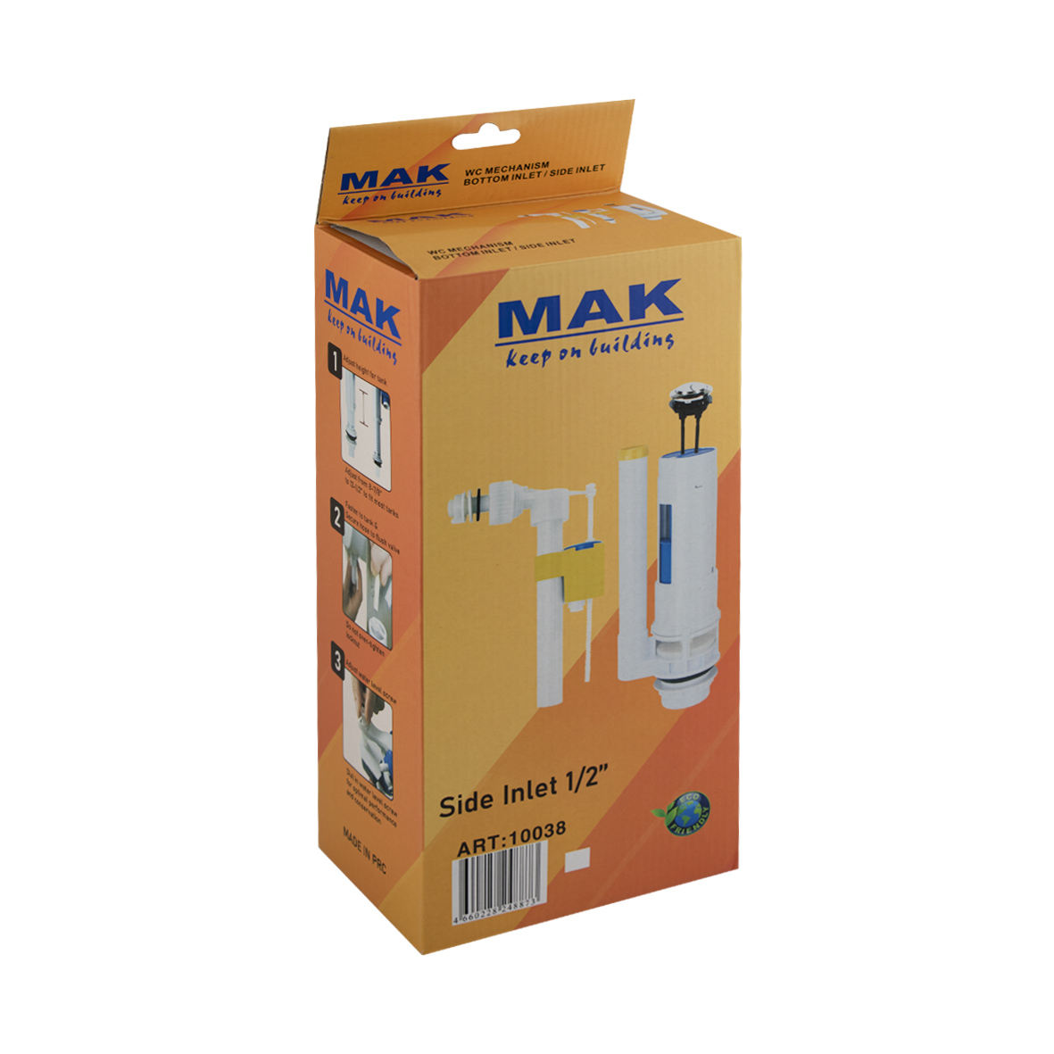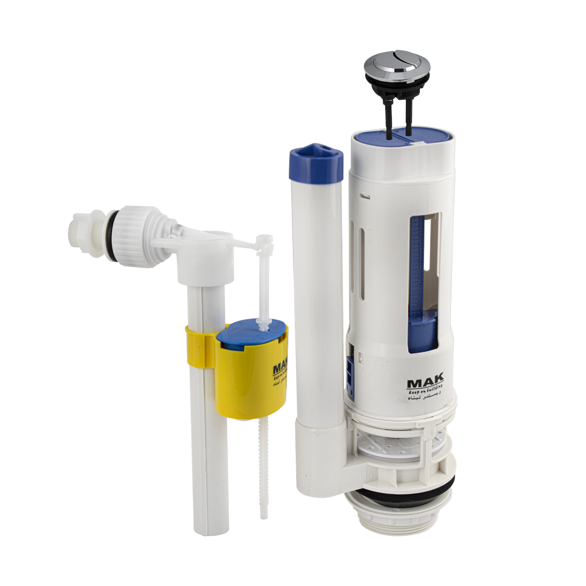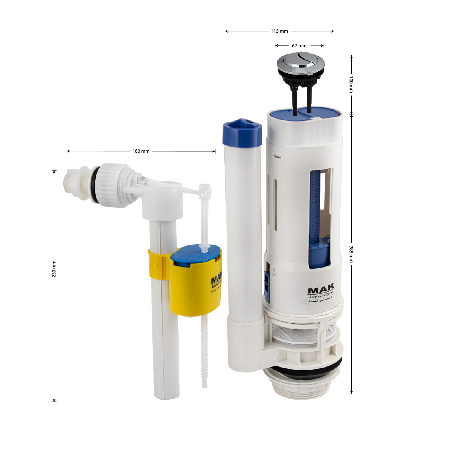 Комплект для бачка унитаза, ко всем моделям, универсальный, состоящий из впускного бокового и выпускного клапана. Сливной механизм бачка имеет хромированную кнопку с двумя режимами слива, универсальный, подходит для бачков различной высоты, регулировка выпускного клапана производится ползунком на корпусе. Регулировка уровня кнопок смыва происходит путем подрезания на нужную длину. Изделие выполнено из высококачественного пластика АБС, который обеспечивает длительное использование без поломок, отличается пониженным уровнем шума. Может устанавливаться в любом типе бачка с боковой подводкой для подачи воды. Габаритные размеры: высота 285 мм, ширина 115 мм, подключение 1/2, наружняя резьба. Вес - 0,57 кг, объём - 0,00599 м3.