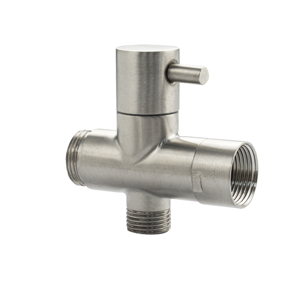 Переключатель душа из нержавеющей стали, поворотный, матовый. Угол поворота 90°. Применяется для перенаправления потока воды с излива в душевой кран и обратно. Входная резьба 3/4, выходная резьба 3/4, выход на лейку 1/2. Габаритные размеры: высота 85 мм, диаметр 25 мм. Вес - 0,360 кг, объём - 0,00002 м2. Комплектация: дивертор, резиновая прокладка.