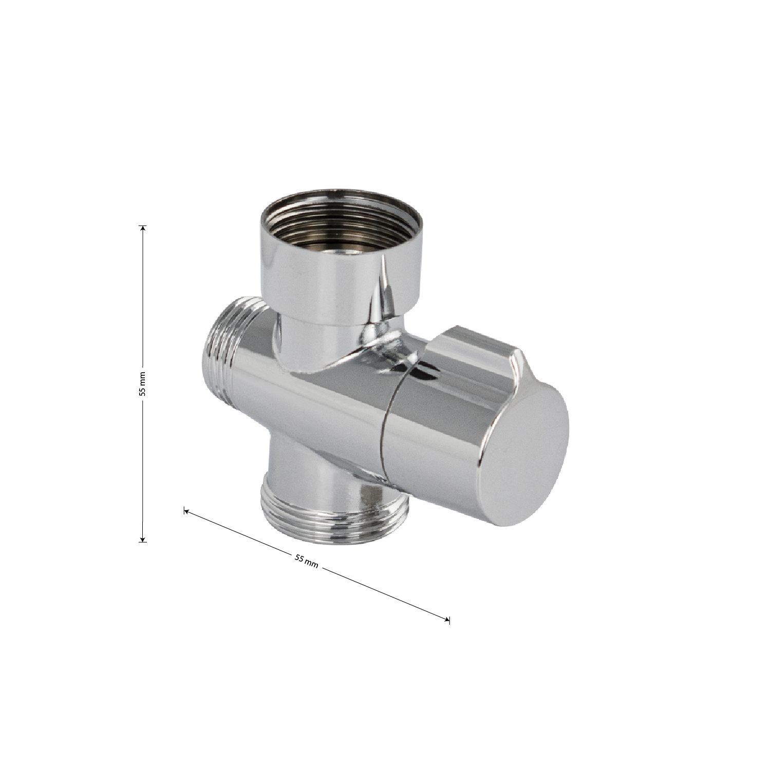 Переключатель душа алюминиевый, поворотный, хромированный. Угол поворота 90°. Применяется для перенаправления потока воды с излива в душевой кран и обратно. Входная резьба 3/4, выходная резьба 3/4, выход на лейку 1/2. Габаритные размеры: высота 55 мм, длина 55 мм. Вес - 0.10 кг, объём - 0.000286 м2. Комплектация: дивертор, резиновая прокладка.