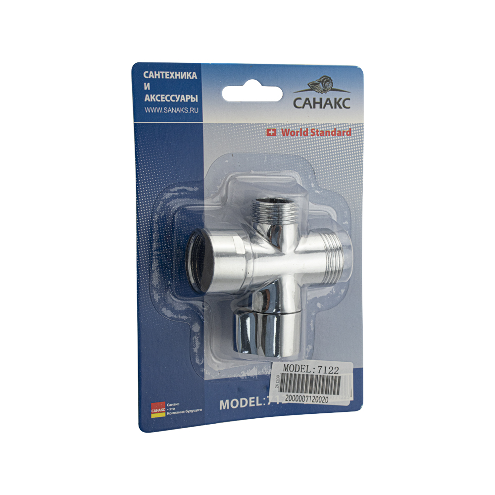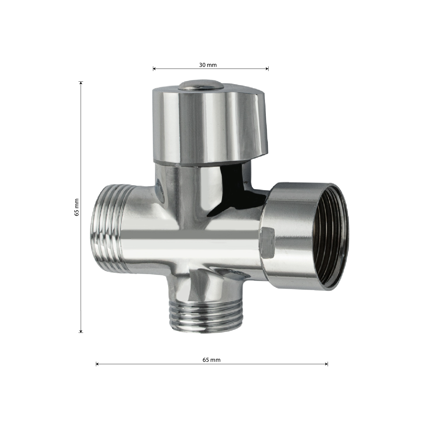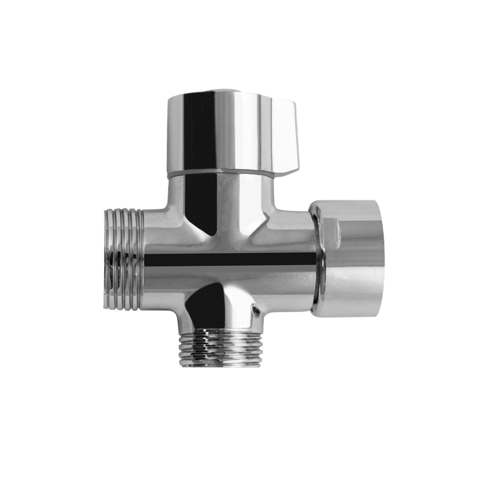Переключатель душа металлический, поворотный, хромированный. Угол поворота 90°. Применяется для перенаправления потока воды с излива в душевой кран и обратно. Входная резьба 3/4, выходная резьба 3/4, выход на лейку 1/2. Габаритные размеры: высота 65 мм, диаметр 30 мм. Вес - 0,200 кг, объём - 0,00002 м2. Комплектация: дивертор, резиновая прокладка.