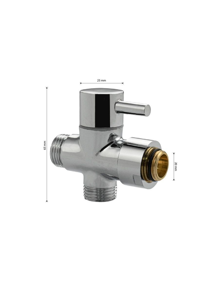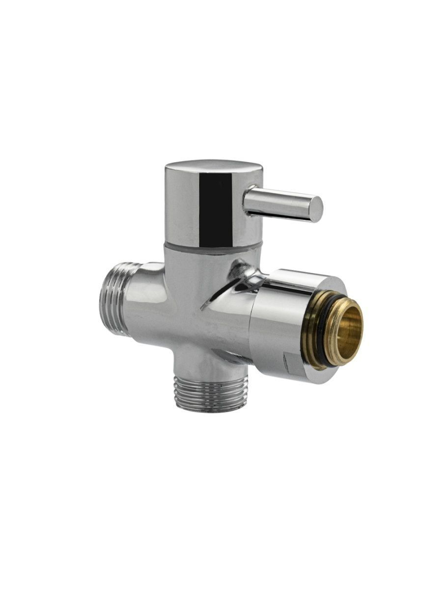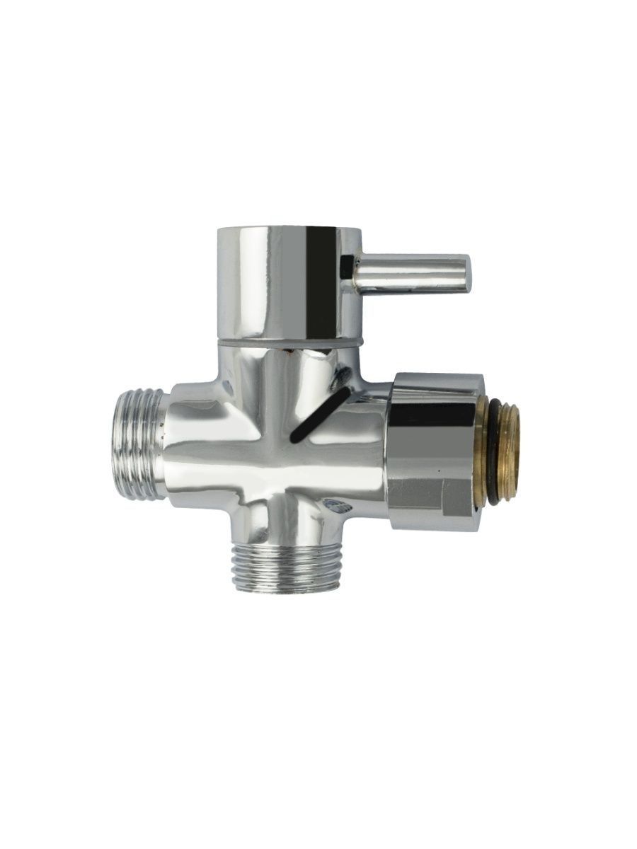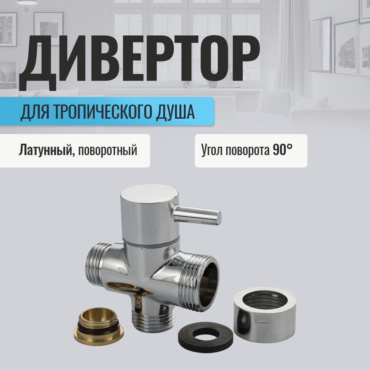 Переключатель душа латунный, поворотный, хромированный, к стойке тропический душ. Угол поворота 90°. Применяется для перенаправления потока воды с излива в душевой кран и обратно. Входная резьба 3/4, выходная резьба 1/2, выход на лейку 1/2. Габаритные размеры: высота 65 мм, диаметр 25 мм. Вес - 0,230 кг, объём - 0,00030 м2. Комплектация: дивертор, резиновая прокладка.