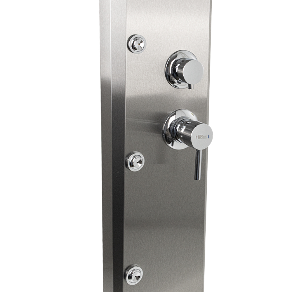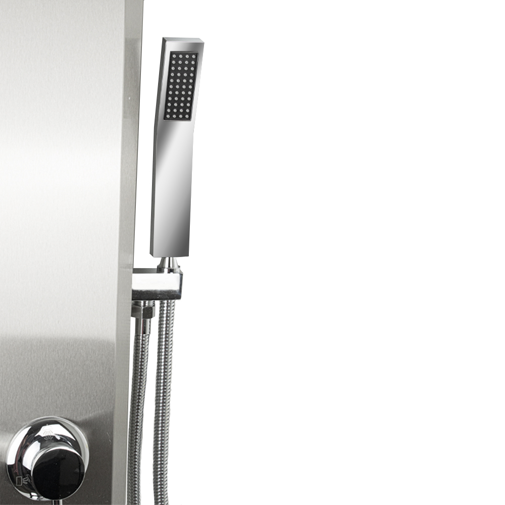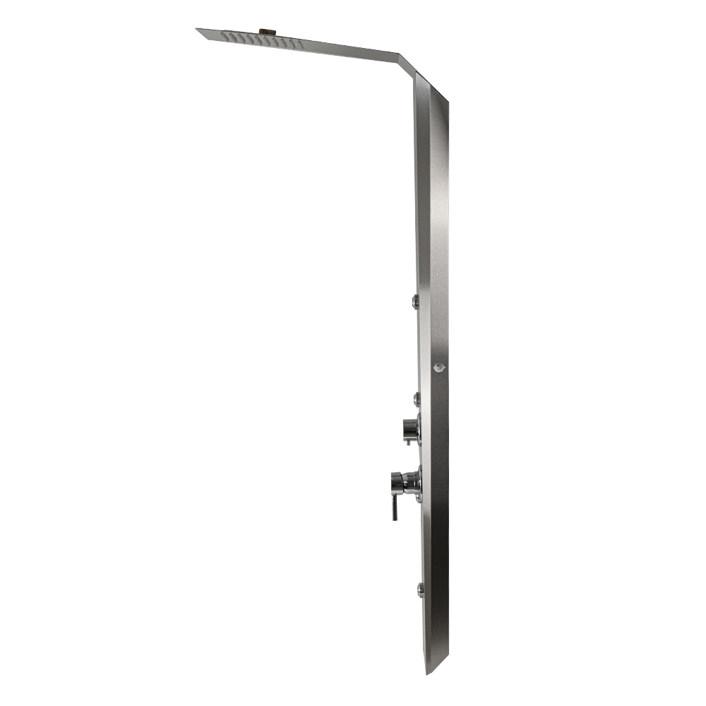 Ультрамодная дизайнерская разборная, гидромассажная душевая панель - "тропический душ" с двумя лейками и форсунками, 3 режима работы. Функциональность обеспечивают тропический, верхний каскадный душ, ручная лейка и форсунки для массажа спины. Эффектный внешний вид и практичность эксплуатации придает изделию из нержавеющей стали марки 304 матовая поверхность. Сочетание эстетики и максимального комфорта достигается за счет интегрированных гидромассажных форсунок и встроенного верхнего душа. Стильное и компактное оборудование предназначено для установки в ванну или любую душевую зону. Душевая панель позволит проводить оздоровительные процедуры в домашних условиях, гидромассажные форсунки окажут мягкое терапевтическое воздействие Габаритные размеры: высота 1350 мм, ширина 240 мм, глубина 40 мм, длина верхнего душа 450 мм, длина шланга 150 см. Вес - 9,500 кг, объём - 0,09000 м3. Комплект: корпус / крепления / лейка / держатель для лейки / душевой шланг / переключатель потоков / соеденительные шланги .
