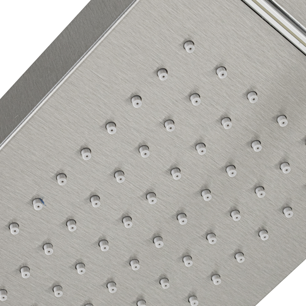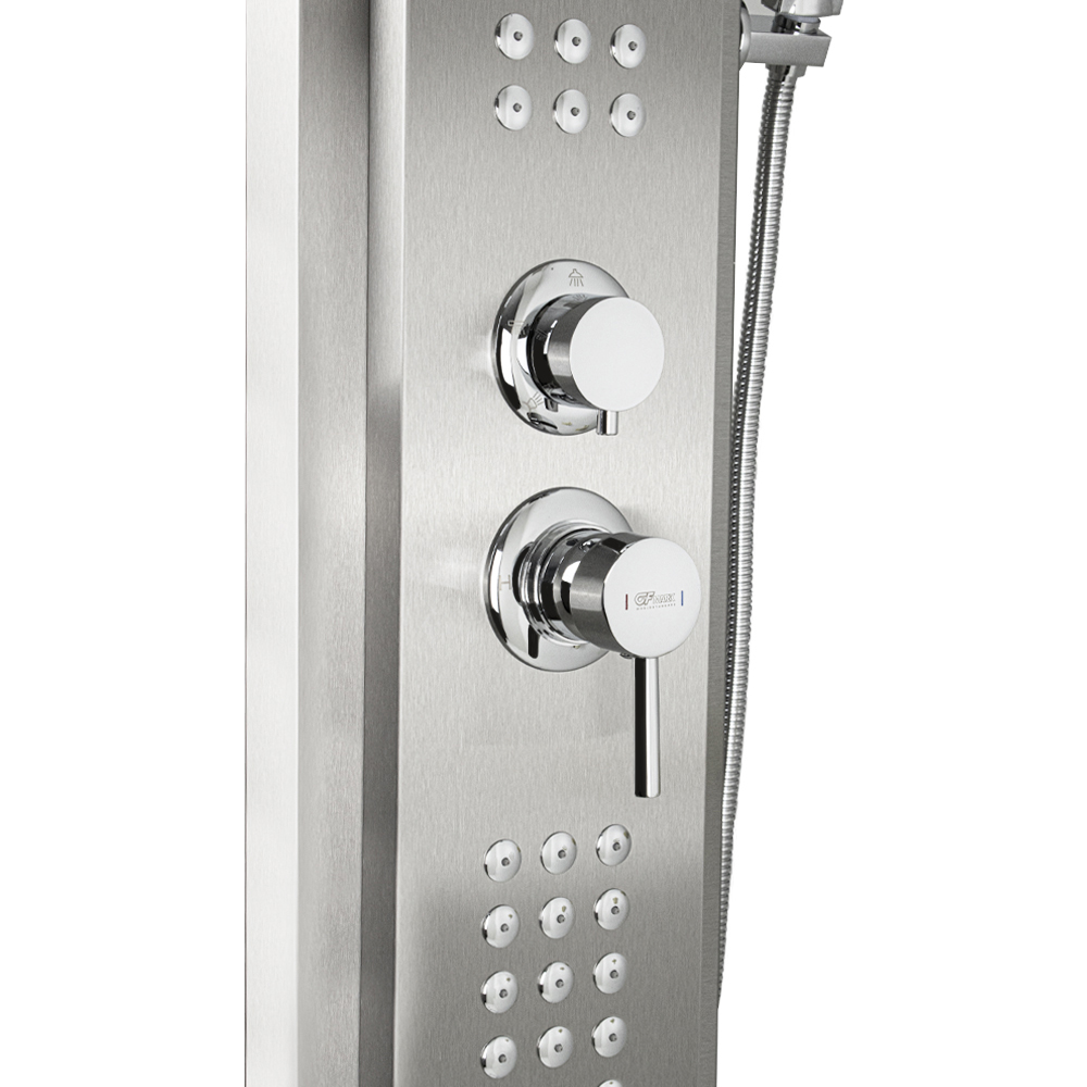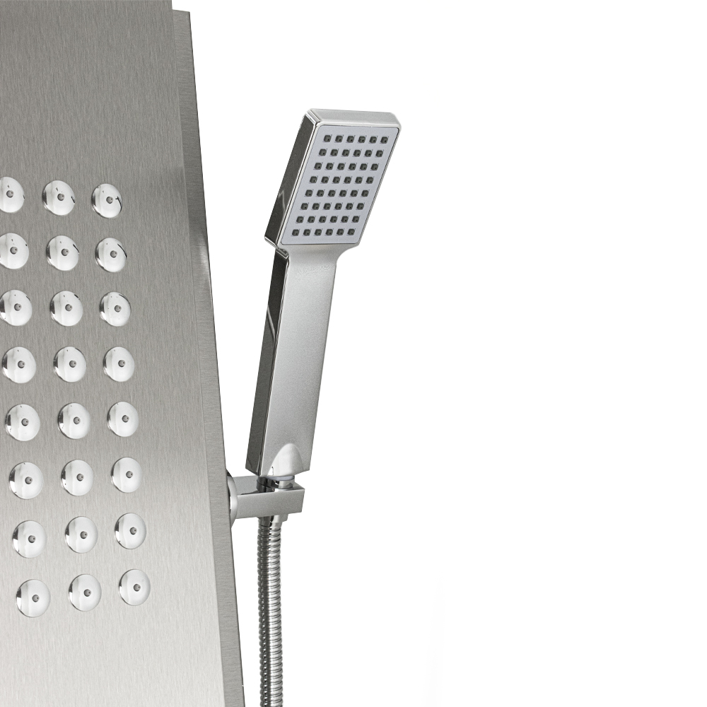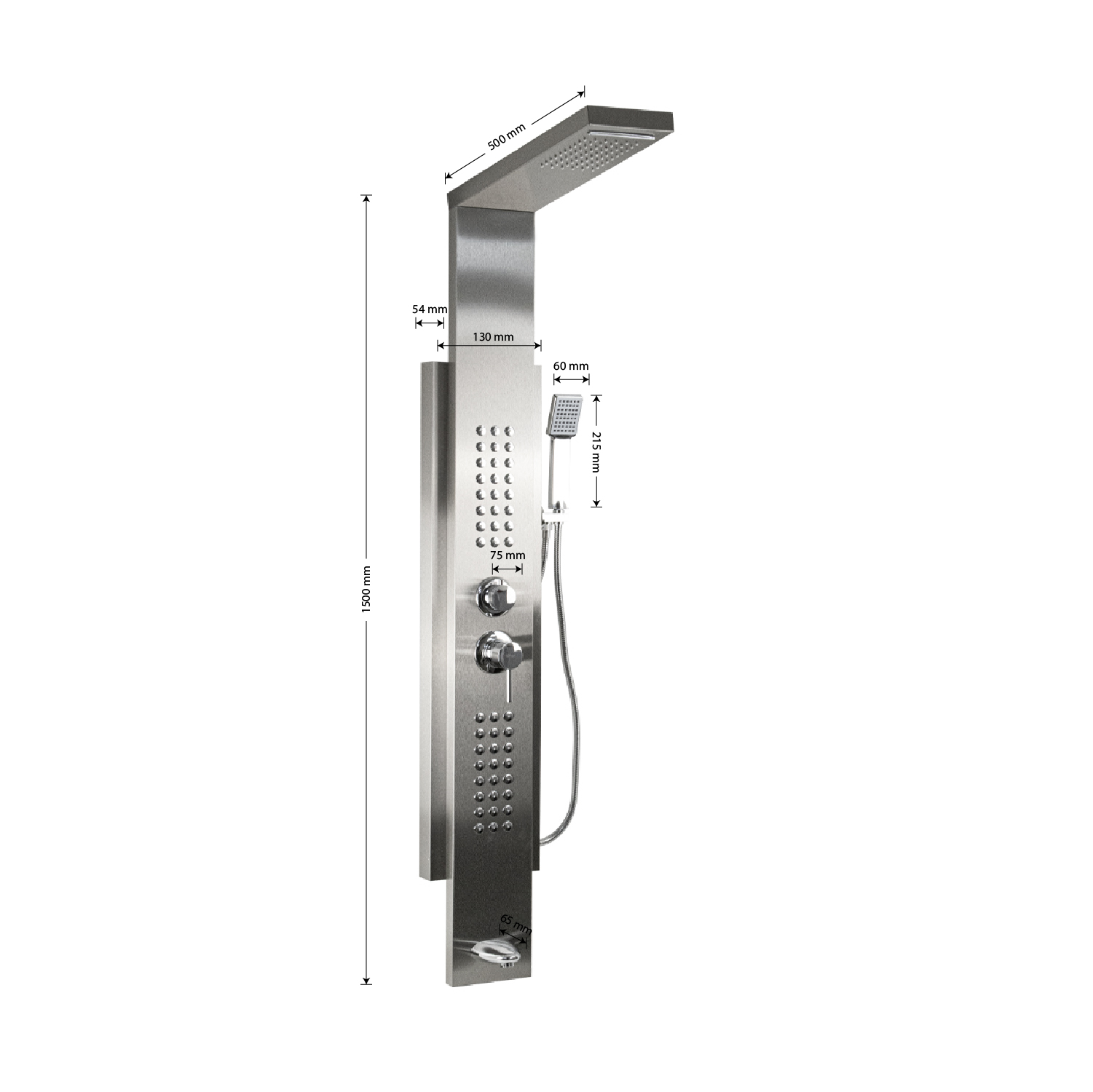 Ультрамодная дизайнерская разборная, гидромассажная душевая панель - "тропический душ" с двумя лейками и форсунками, 4 режима работы, с коротким изливом. Функциональность обеспечивают тропический, верхний каскадный душ, ручная лейка и форсунки для массажа спины. Эффектный внешний вид и практичность эксплуатации придает изделию из нержавеющей стали марки 304 матовая зацарапанная поверхность. Сочетание эстетики и максимального комфорта достигается за счет интегрированных гидромассажных форсунок и встроенного верхнего душа. Стильное и компактное оборудование предназначено для установки в ванну или любую душевую зону. Душевая панель позволит проводить оздоровительные процедуры в домашних условиях, гидромассажные форсунки окажут мягкое терапевтическое воздействие. Габаритные размеры: высота 1500 мм, ширина 220 мм, глубина 54 мм, длина верхнего душа 500 мм, длина излива 65 мм, длина шланга 150 см. Вес - 10,000 кг, объём - 0,10000 м3. Комплект: корпус / крепления / лейка / держатель для лейки / душевой шланг / излив