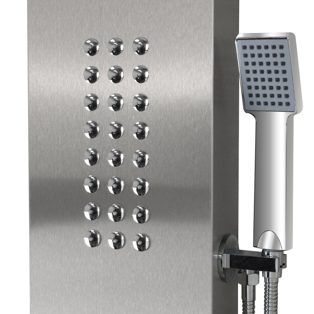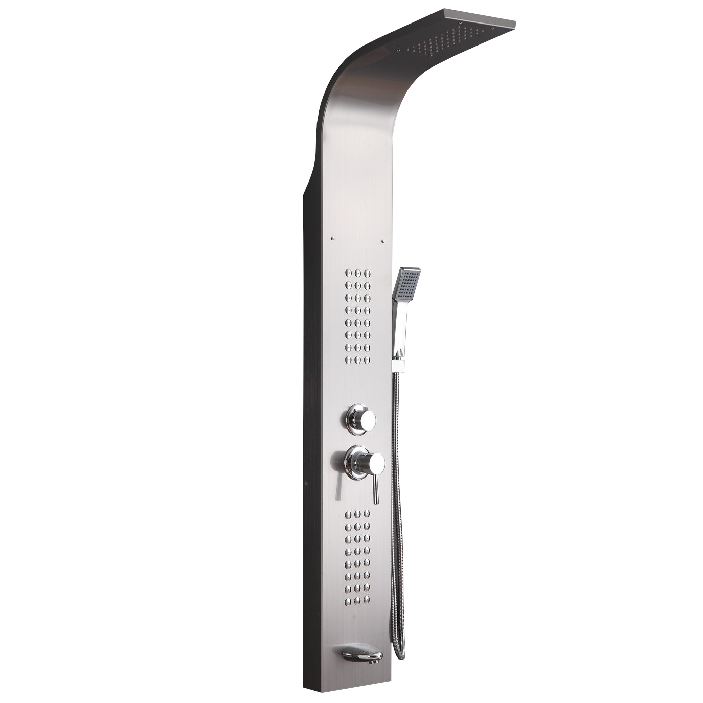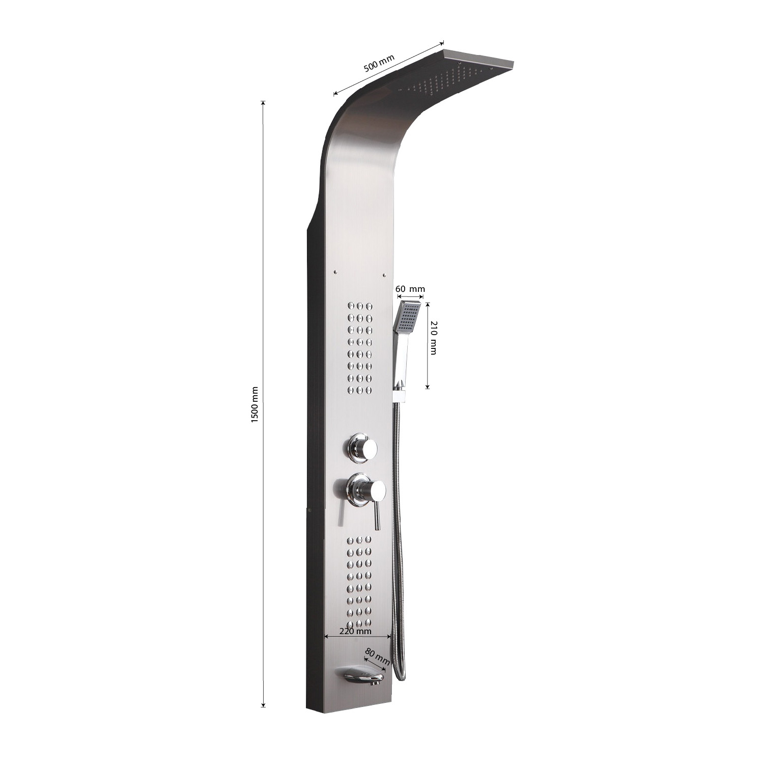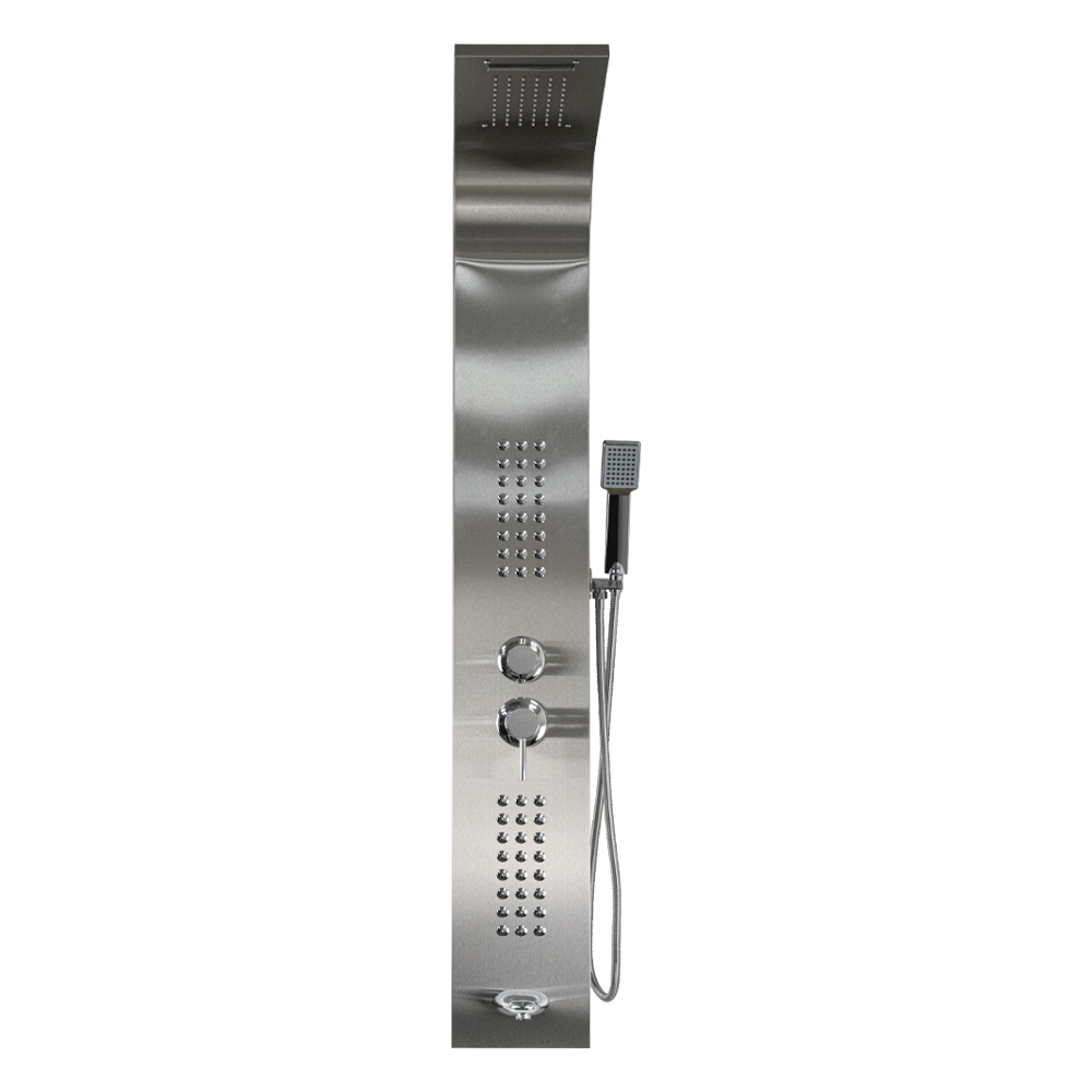 Ультрамодная дизайнерская гидромассажная душевая панель - "тропический душ" с двумя лейками и форсунками, 5 режимов работы, с коротким изливом. Функциональность обеспечивают тропический, верхний каскадный душ, ручная лейка и форсунки для массажа спины. Эффектный внешний вид и практичность эксплуатации придает изделию из нержавеющей стали марки 304 матовая хромированная поверхность. Сочетание эстетики и максимального комфорта достигается за счет интегрированных гидромассажных форсунок и встроенного верхнего душа. Стильное и компактное оборудование предназначено для установки в ванну или любую душевую зону. Душевая панель позволит проводить оздоровительные процедуры в домашних условиях, гидромассажные форсунки окажут мягкое терапевтическое воздействие. Габаритные размеры: высота 1500 мм, ширина 220 мм, глубина 75 мм, длина верхнего душа 500 мм, длина излива 80 мм, длина шланга 150 см. Вес - 9,500 кг, объём - 0,16000 м3. Комплект: корпус / крепления / лейка / держатель для лейки / душевой шланг / излив / переклю