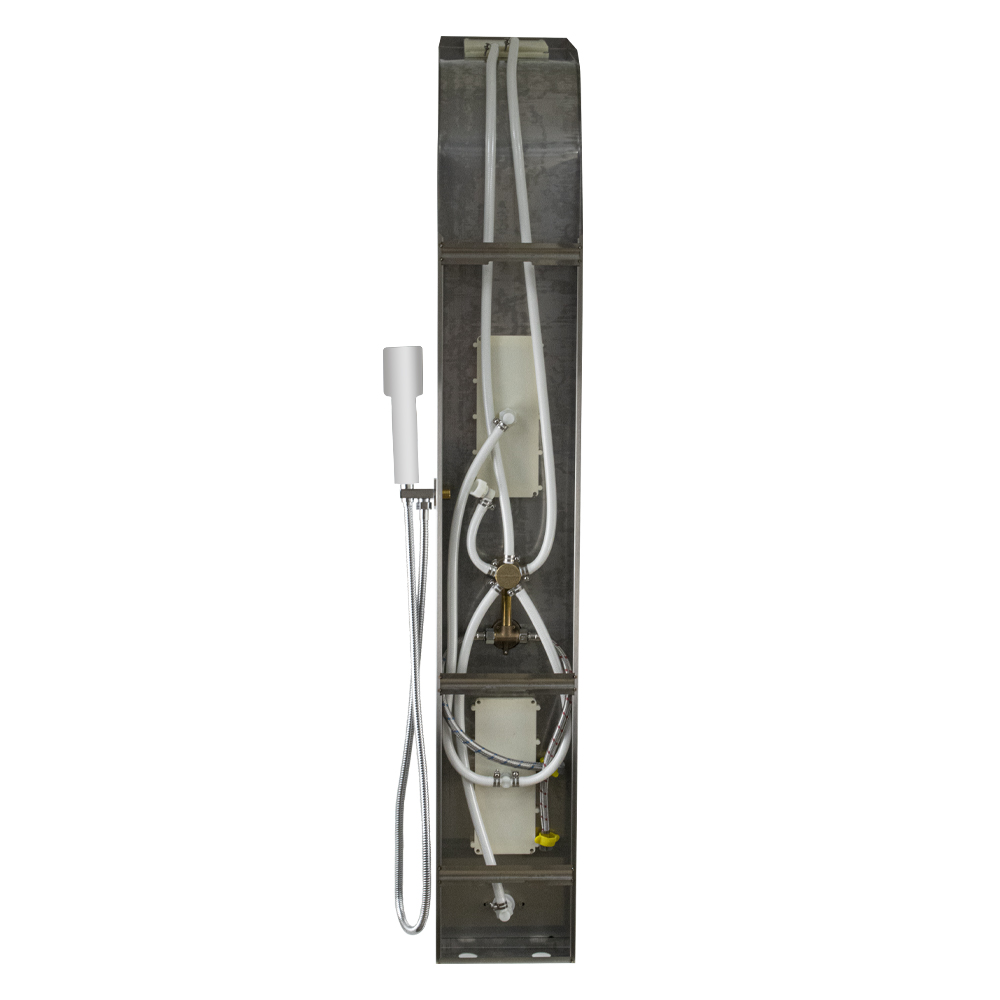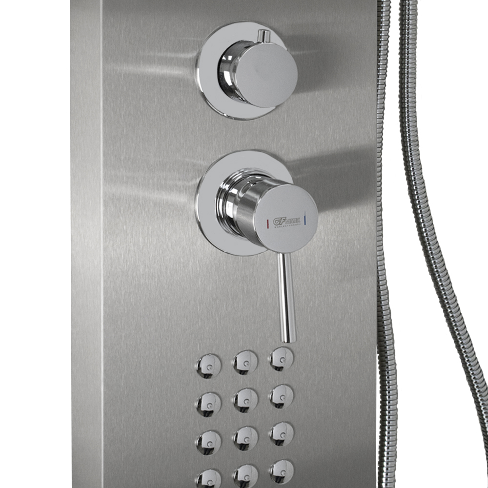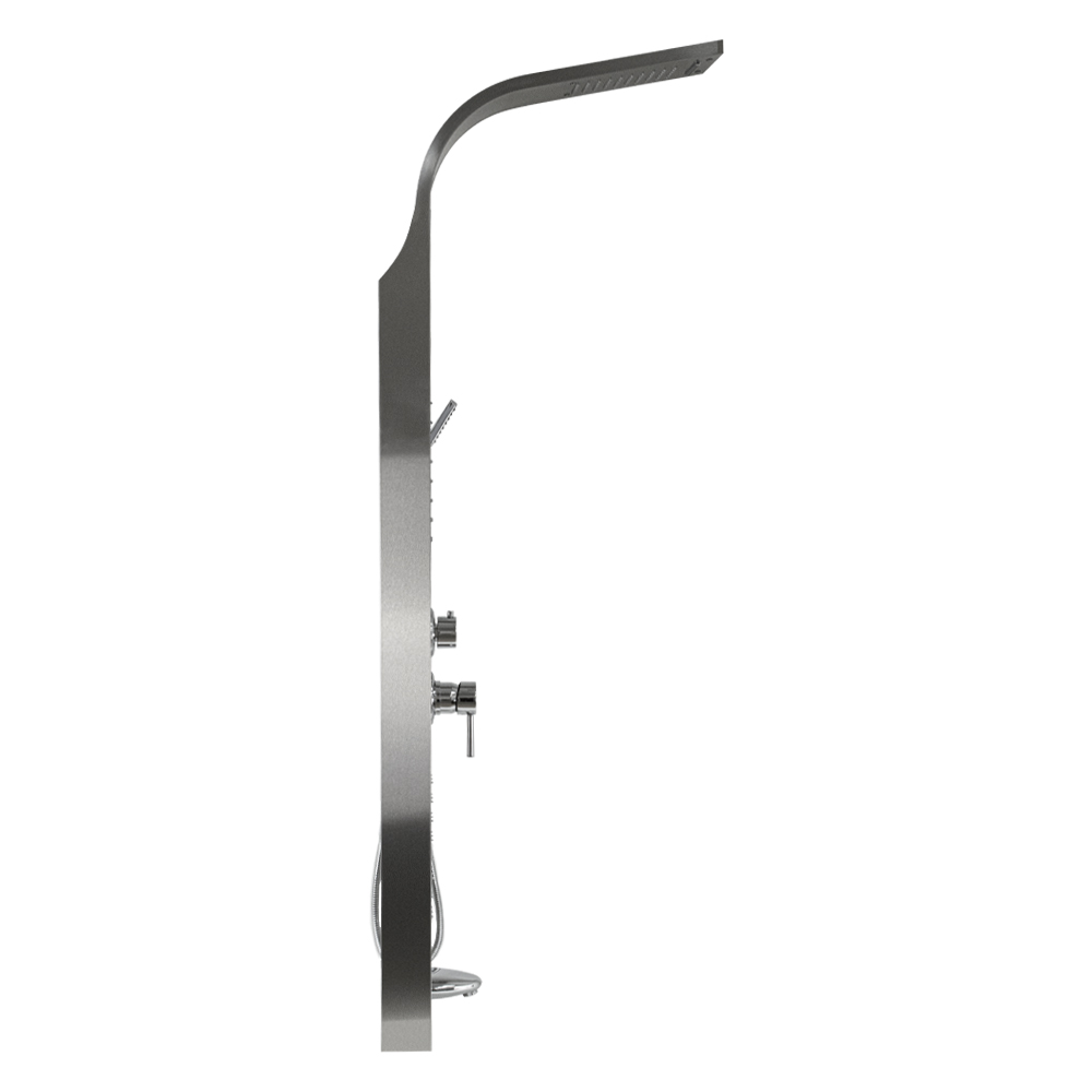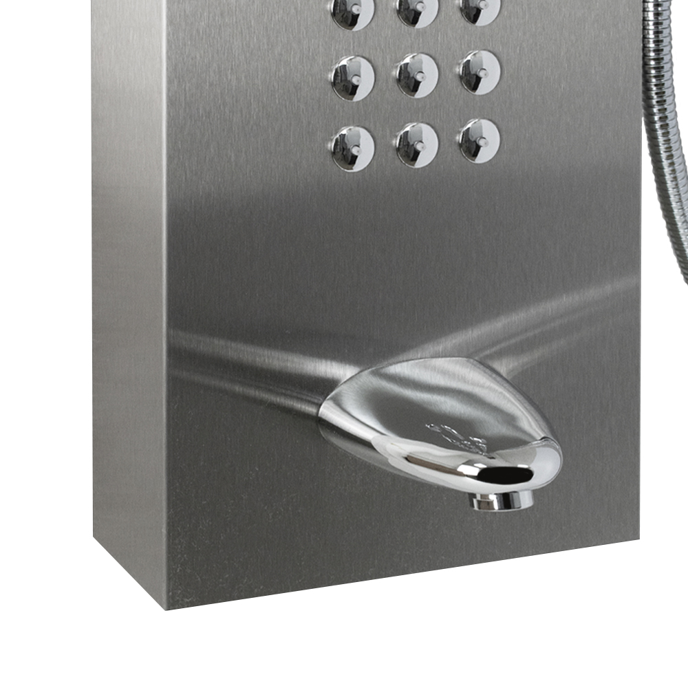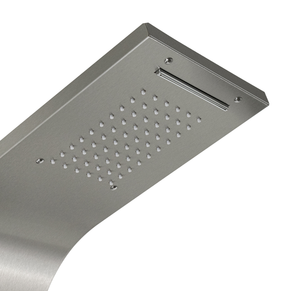 Ультрамодная дизайнерская гидромассажная душевая панель - "тропический душ" с двумя лейками и форсунками, 5 режимов работы, с коротким изливом. Функциональность обеспечивают тропический, верхний каскадный душ, ручная лейка и форсунки для массажа спины. Эффектный внешний вид и практичность эксплуатации придает изделию из нержавеющей стали марки 304 матовая хромированная поверхность. Сочетание эстетики и максимального комфорта достигается за счет интегрированных гидромассажных форсунок и встроенного верхнего душа. Стильное и компактное оборудование предназначено для установки в ванну или любую душевую зону. Душевая панель позволит проводить оздоровительные процедуры в домашних условиях, гидромассажные форсунки окажут мягкое терапевтическое воздействие. Габаритные размеры: высота 1500 мм, ширина 220 мм, глубина 75 мм, длина верхнего душа 500 мм, длина излива 80 мм, длина шланга 150 см. Вес - 9,500 кг, объём - 0,16000 м3. Комплект: корпус / крепления / лейка / держатель для лейки / душевой шланг / излив / переклю