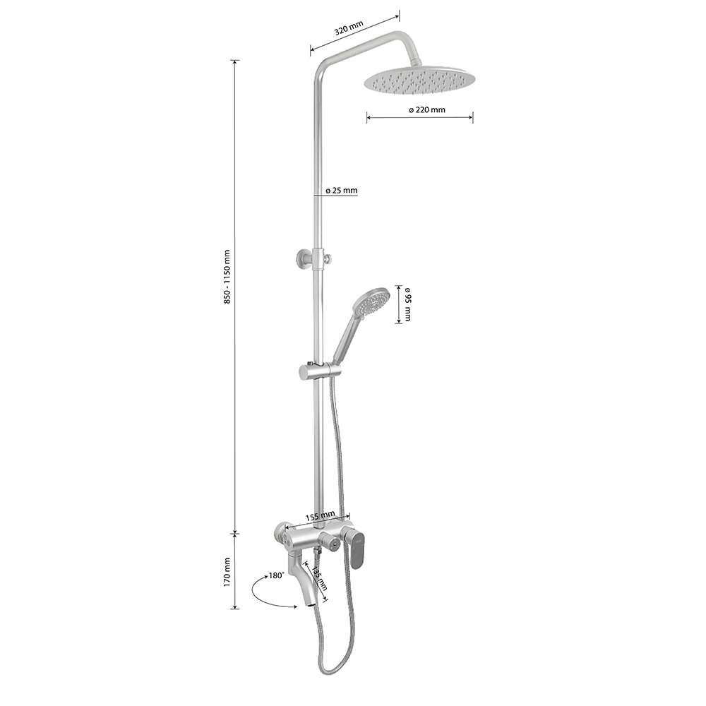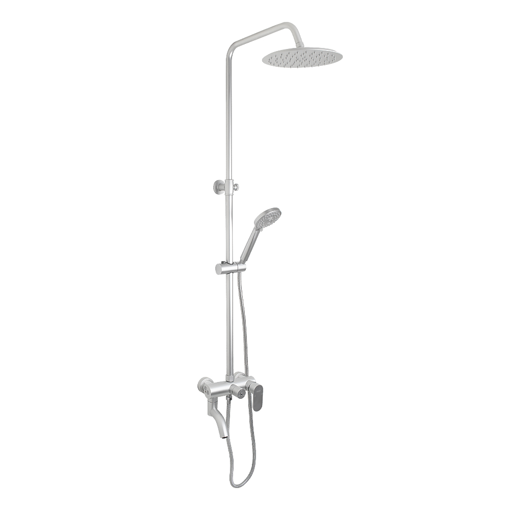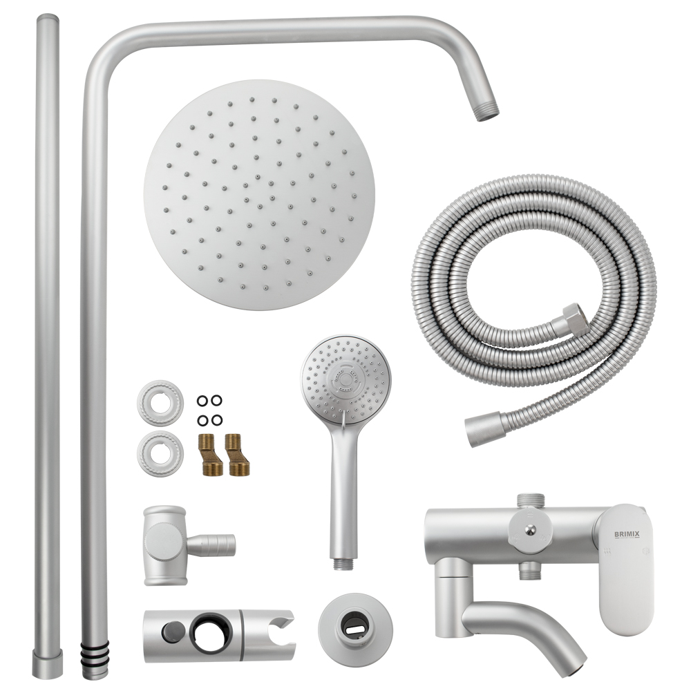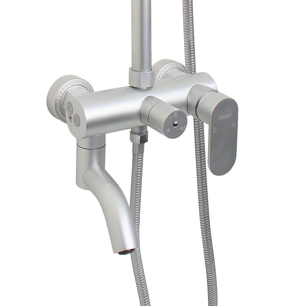 Смеситель + стойка душевая телескопическая "тропический душ" с двумя лейками в ванную / душевую комнату из авиационного алюминия, матовая. Смеситель шаровый с дивертором м/к на корпусе с коротким поворотным изливом, душевым шлангом и лейкой. Картридж d = 40 мм, ручка литая, аэратор для экономии воды, чашки и эксцентрики. Душевая, регулируемая по высоте стойка с присоединением к корпусу смесителя и дополнительным креплением к стене и большой круглой лейкой с эффектом тропического душа. Габаритные размеры: ширина смесителя 150 мм, высота 170 мм, длина излива корпуса 135 мм, длина излива стойки 320 мм, высота телескопической стойки от 850 - 1150 мм, трёхрежимная душевая лейка d = 95 мм, лейка тропический душ d = 220 мм, шланг 150 см. Вес - 3,600 кг, объём - 0,05700 м3. В комплекте корпус с изливом, чашки, эксцентрики, прокладки, стойка, шланг, две лейки, крепления.