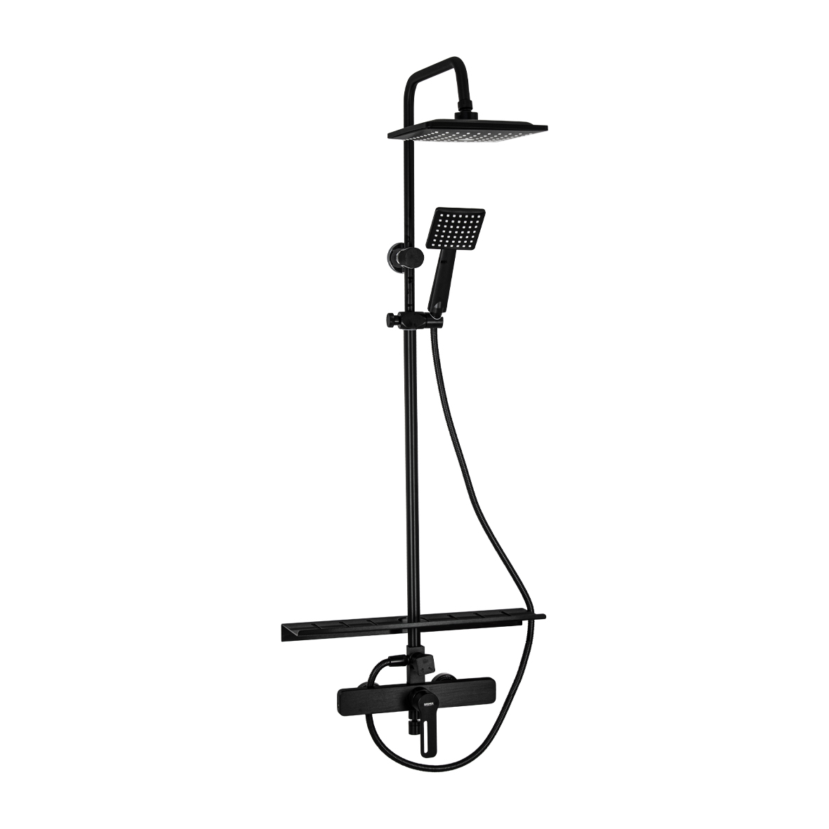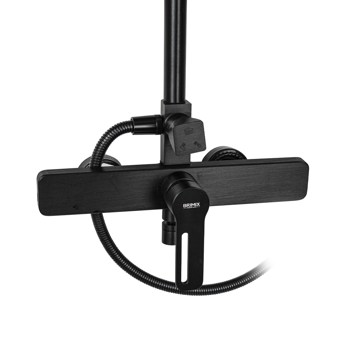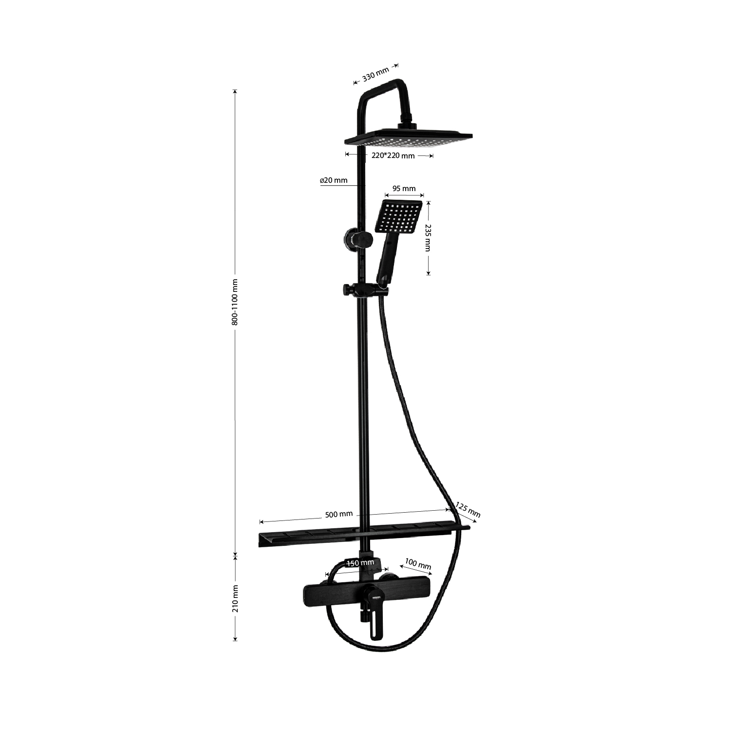 Смеситель + стойка душевая телескопическая "тропический душ" с двумя лейками и двойной полочкой для принадлежностей, в ванную / душевую комнату из авиационного алюминия, черного цвета. Смеситель шаровый с дивертором м/к на корпусе с коротким поворотным изливом, душевым шлангом и лейкой. Картридж d = 40 мм, ручка литая, аэратор для экономии воды, чашки и эксцентрики. Душевая стойка с присоединением к корпусу смесителя и дополнительным креплением к стене и большой прямоугольной лейкой с эффектом тропического душа. Габаритные размеры: ширина смесителя 150 мм, высота 235 мм, длина излива корпуса 80 мм, длина излива стойки 330 мм, высота стойки 800-1100 мм, лейка для душа прямоугольная ширина 95 мм, лейка для душа прямоугольная высота 250 мм, лейка тропический душ 320*220 мм, шланг 150 см. Вес - 4,48 кг, объём - 0,035 м3. В комплекте корпус с изливом, чашки, эксцентрики, прокладки, стойка, шланг, две лейки, крепления.