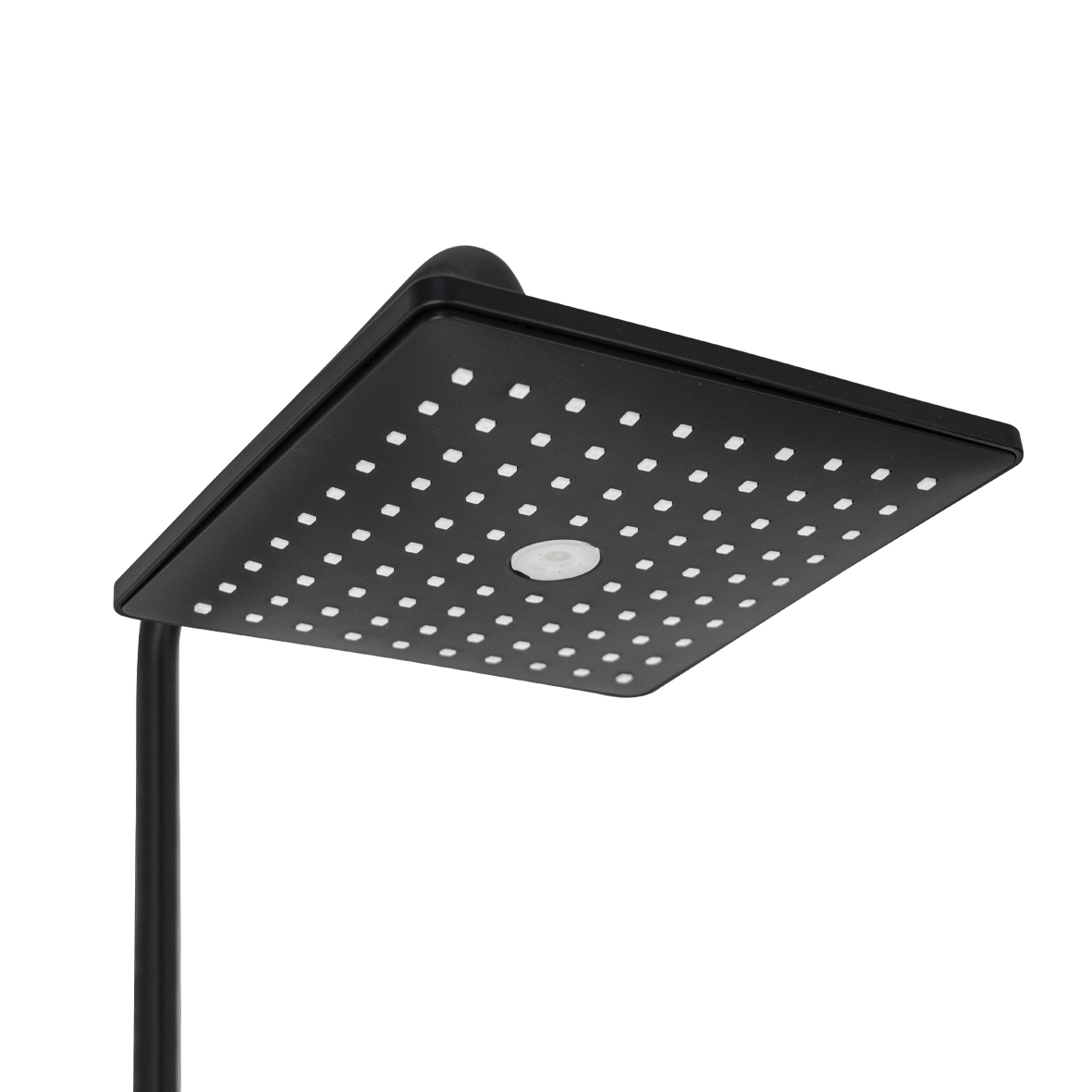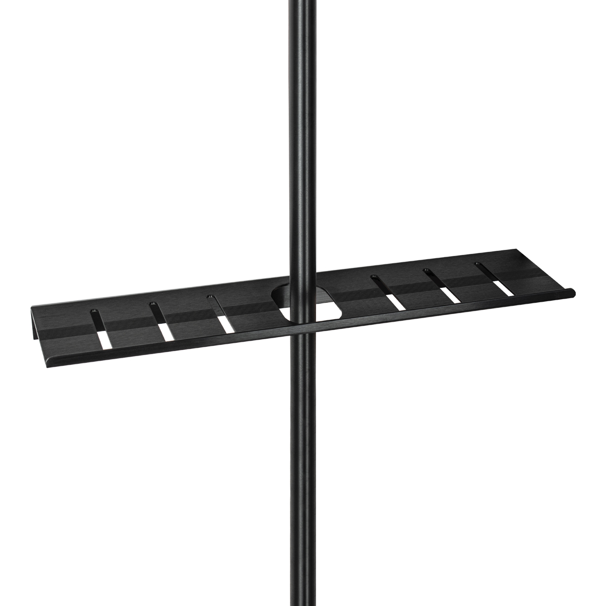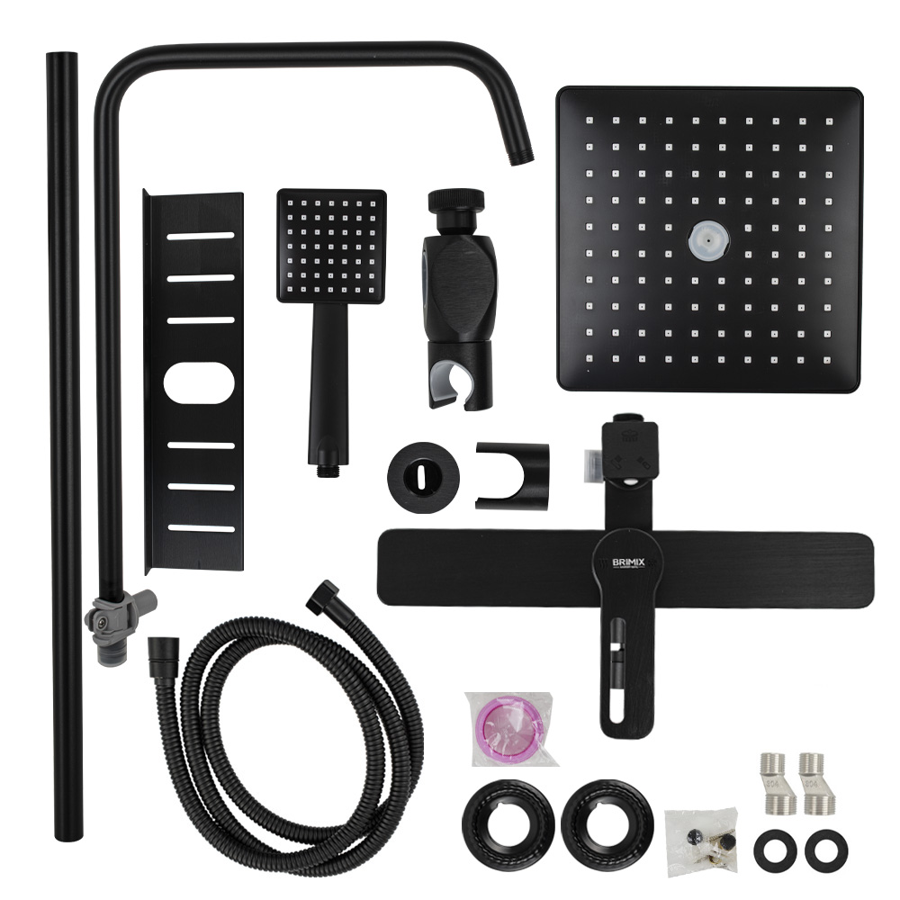 Смеситель + стойка душевая телескопическая "тропический душ" с двумя лейками и двойной полочкой для принадлежностей, в ванную / душевую комнату из авиационного алюминия, черного цвета. Смеситель шаровый с дивертором м/к на корпусе с коротким поворотным изливом, душевым шлангом и лейкой. Картридж d = 40 мм, ручка литая, аэратор для экономии воды, чашки и эксцентрики. Душевая стойка с присоединением к корпусу смесителя и дополнительным креплением к стене и большой прямоугольной лейкой с эффектом тропического душа. Габаритные размеры: ширина смесителя 150 мм, высота 235 мм, длина излива корпуса 80 мм, длина излива стойки 330 мм, высота стойки 800-1100 мм, лейка для душа прямоугольная ширина 95 мм, лейка для душа прямоугольная высота 250 мм, лейка тропический душ 320*220 мм, шланг 150 см. Вес - 4,48 кг, объём - 0,035 м3. В комплекте корпус с изливом, чашки, эксцентрики, прокладки, стойка, шланг, две лейки, крепления.