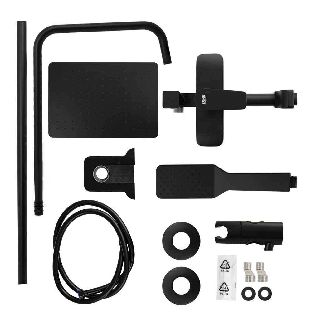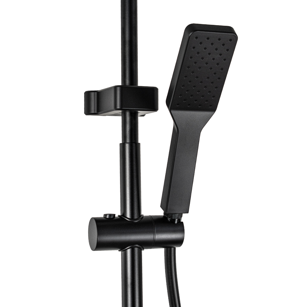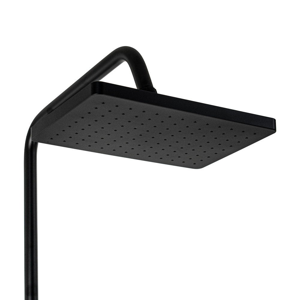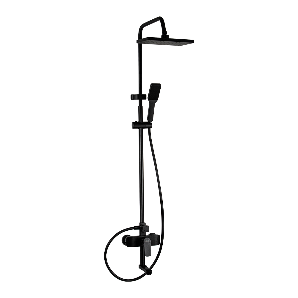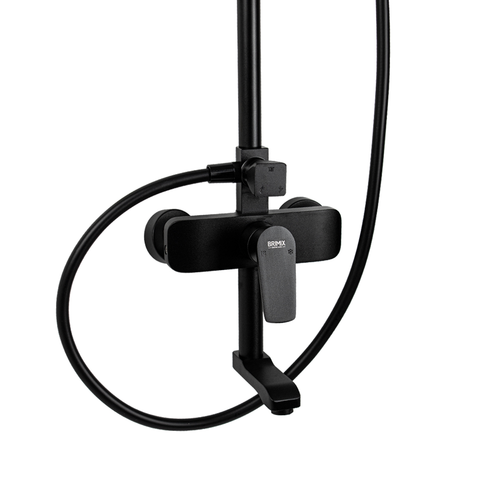 Смеситель + стойка душевая телескопическая "тропический душ" с двумя лейками в ванную / душевую комнату из авиационного алюминия цвет черный. Смеситель шаровый с дивертором м/к на корпусе с коротким поворотным изливом, душевым шлангом и лейкой. Картридж d = мм, ручка литая, аэратор для экономии воды, чашки и эксцентрики. Душевая, регулируемая по высоте стойка с присоединением к корпусу смесителя и дополнительным креплением к стене и большой квадратной лейкой с эффектом тропического душа. Габаритные размеры: ширина смесителя 150 мм, высота 275 мм, длина излива корпуса 140 мм, высота телескопической стойки 800-1100 мм, длина излива стойки 350 мм, прямоугольная душевая лейка 250*170 мм, лейка тропический душ 57*225 мм, шланг 150 см. Вес - 3.9 кг, объём - 0.03089 м3. В комплекте корпус с изливом, чашки, эксцентрики, прокладки, стойка, шланг, две лейки, крепления.