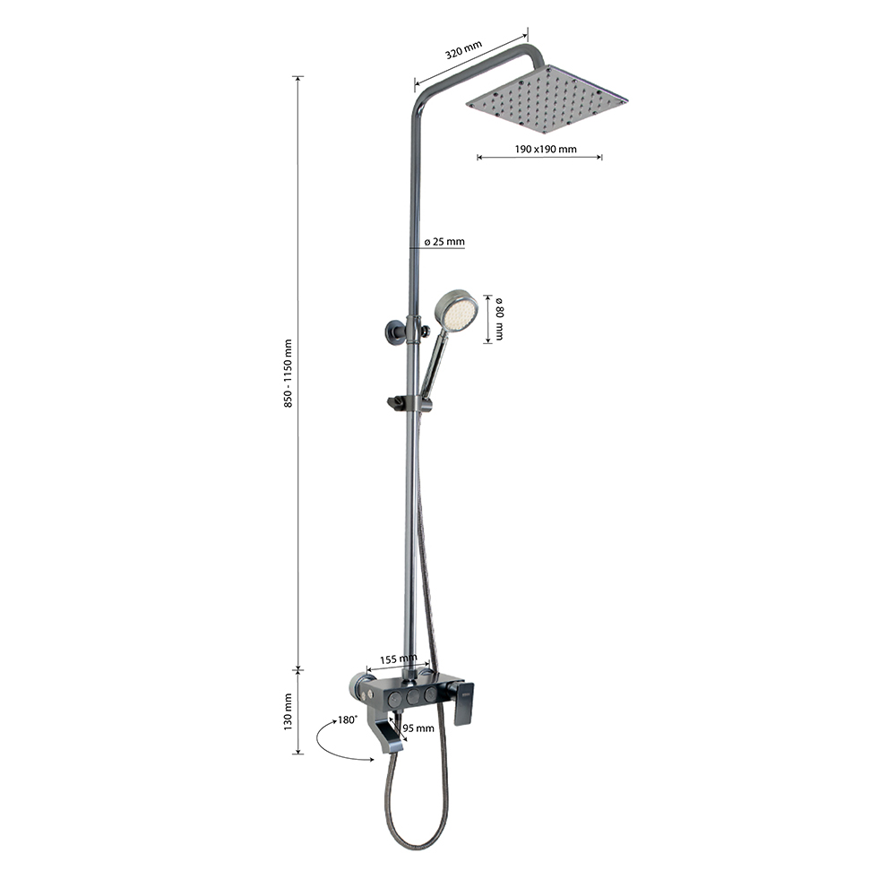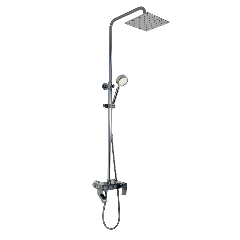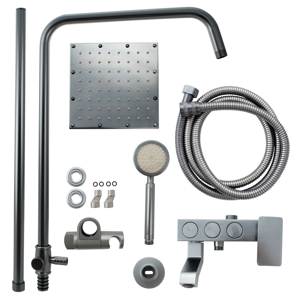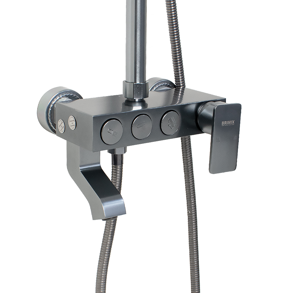 Смеситель + стойка душевая телескопическая "тропический душ" с двумя лейками в ванную / душевую комнату из авиационного алюминия цвет ТИТАН. Смеситель шаровый с кнопочным переключением режимов подачи воды на корпусе, с коротким поворотным изливом, душевым шлангом и лейкой. Картридж d = 40 мм, ручка литая, аэратор для экономии воды, чашки и эксцентрики душевая, регулируемая по высоте стойка с присоединением к корпусу смесителя и дополнительным креплением к стене и большой квадратной лейкой с эффектом тропического душа. Габаритные размеры: ширина смесителя 150 мм, высота 130 мм, длина излива корпуса 95 мм, высота телескопической стойки от 850 - 1150 мм, длина излива стойки 320 мм, душевая лейка d = 80 мм, лейка тропический душ 190 x 190 мм, шланг 150 см. Вес - 4,100 кг, объём - 0,05700 м3. В комплекте корпус с изливом, чашки, эксцентрики, прокладки, стойка, шланг, две лейки, крепления.