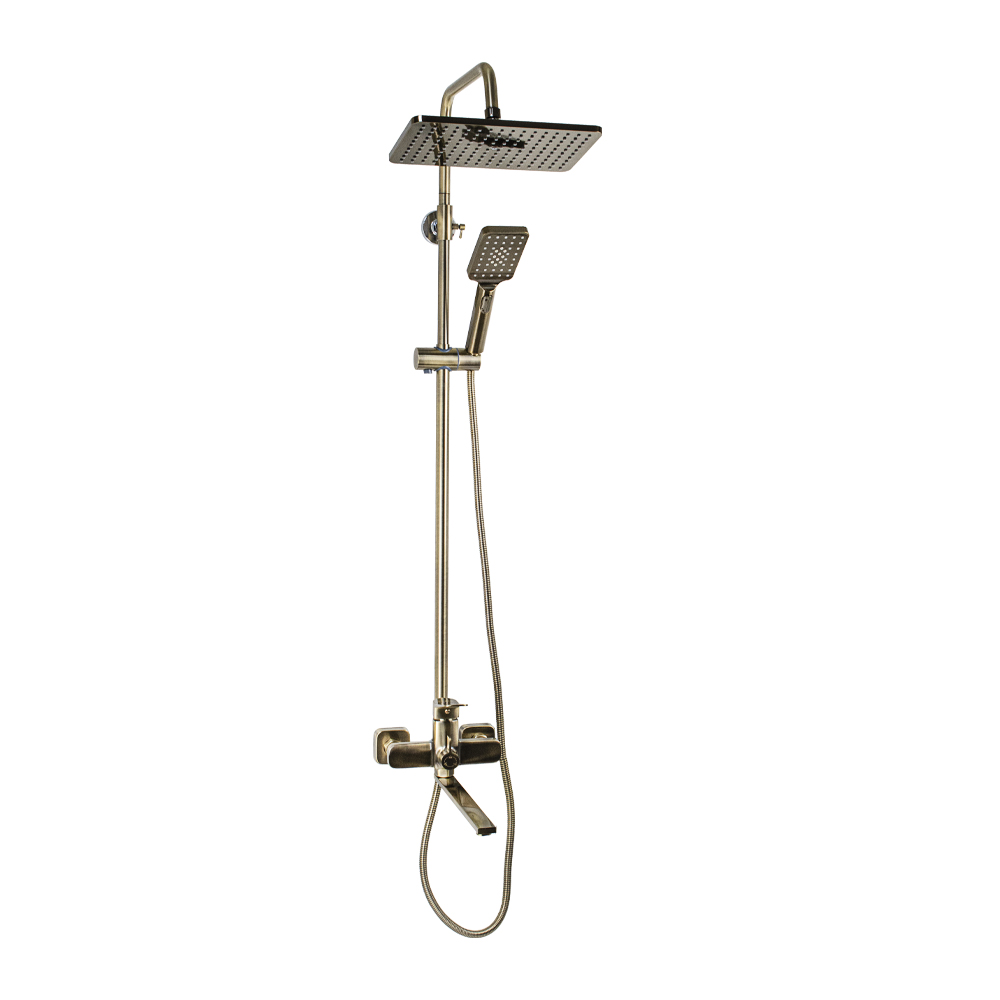 Смеситель + стойка душевая телескопическая "тропический душ" с двумя лейками в ванную / душевую комнату, цвет бронза. Смеситель шаровый с длинным поворотным изливом, душевым шлангом и лейкой, дивертор переключения в трёх положениях. Материал изготовления — цам. Картридж d = 40 мм, ручка литая, аэратор для экономии воды, чашки и эксцентрики. Душевая, регулируемая по высоте стойка с присоединением к корпусу смесителя и дополнительным креплением к стене и большой круглой лейкой с эффектом тропического душа. Габаритные размеры: ширина смесителя 150 мм, высота 160 мм, длина излива корпуса 300 мм, высота телескопической стойки 800 -1200 мм, длина излива стойки 330 мм, душевая лейка 80*255 мм, круглая лейка тропический душ 290*190 мм, шланг 150 см. Вес - 4,58 кг, объём - 0,02847 м3. В комплекте корпус с изливом, чашки, эксцентрики, прокладки, стойка, дивертор, шланг, две лейки, крепления.